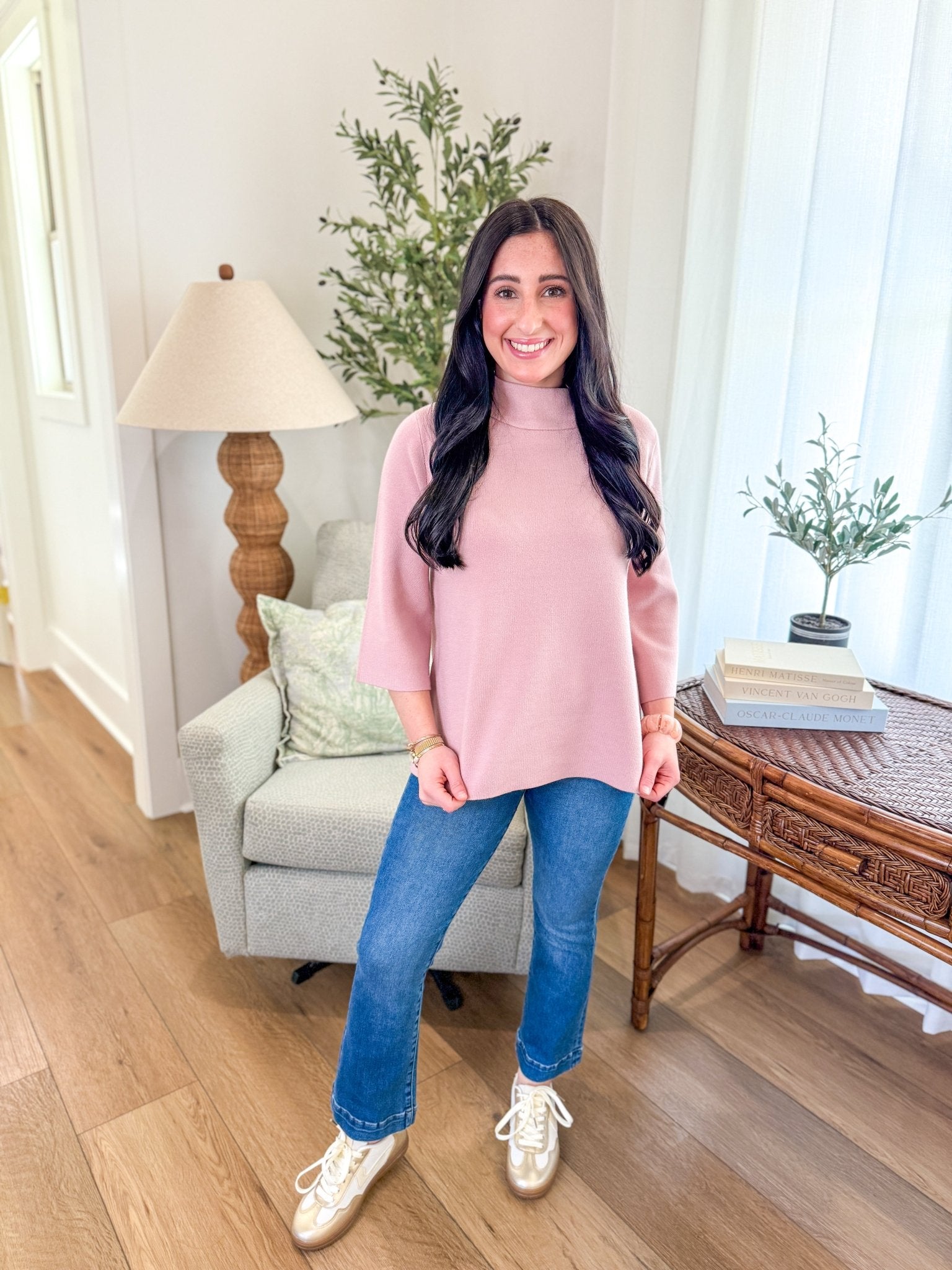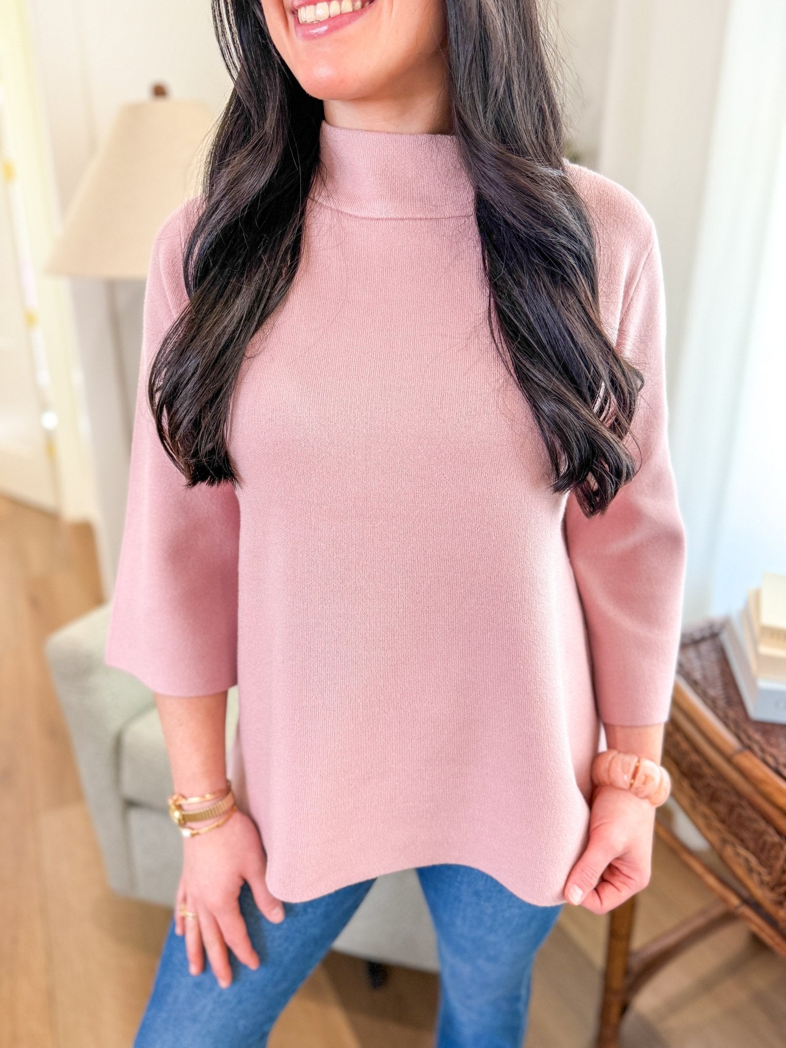 Design: Mock neckline, bell sleeves, relaxed yet refined silhouette, soft pink hue.