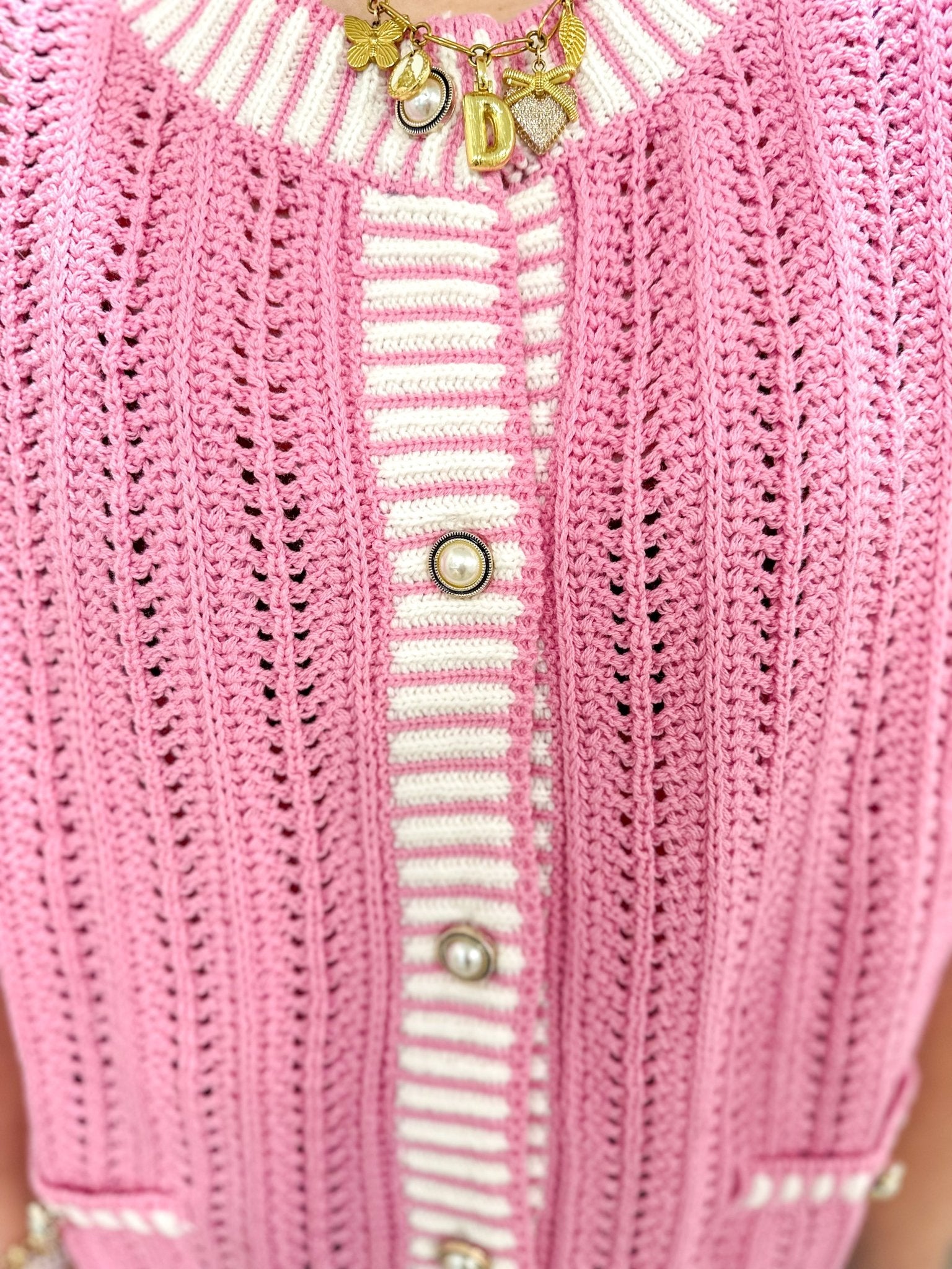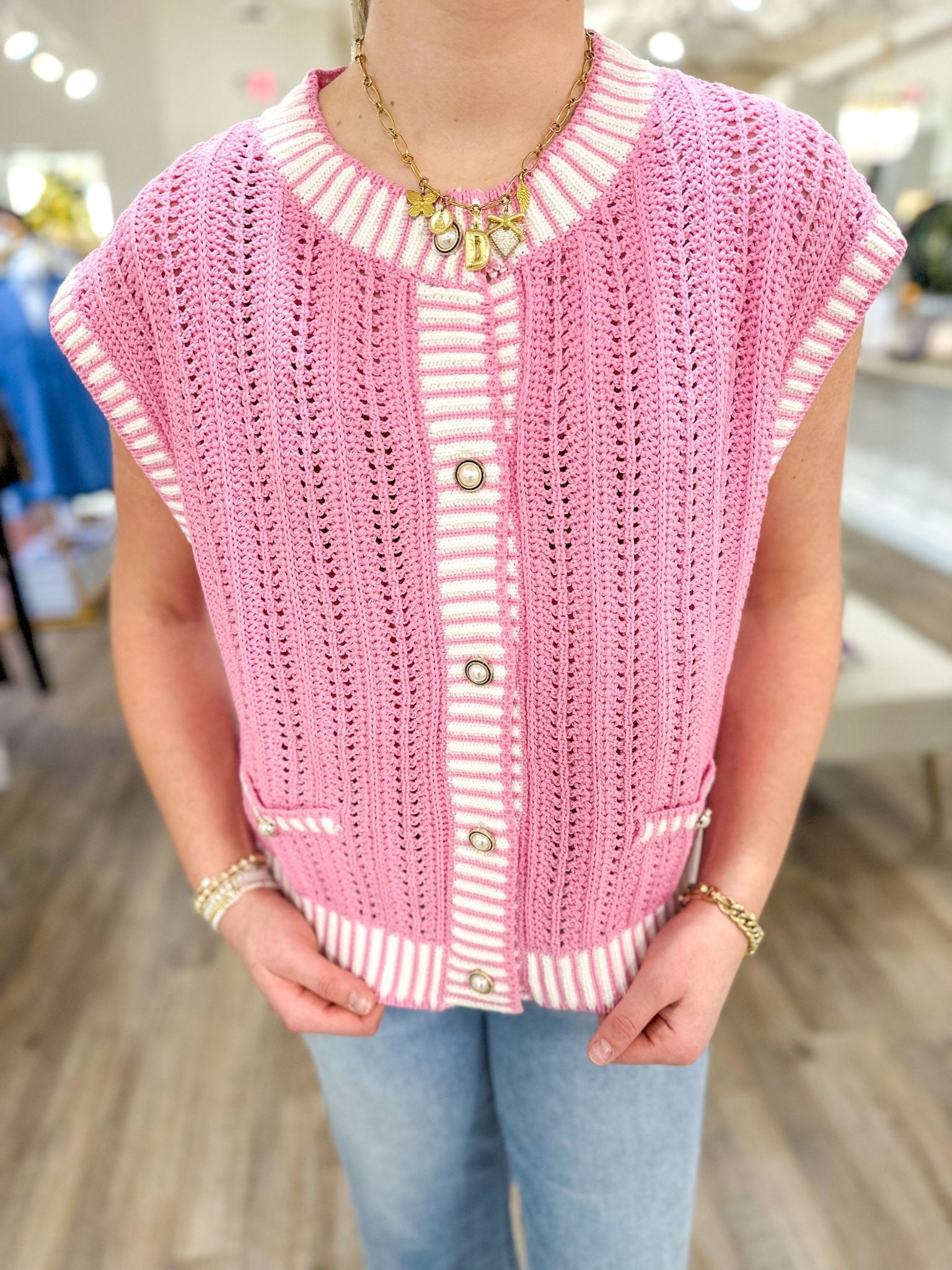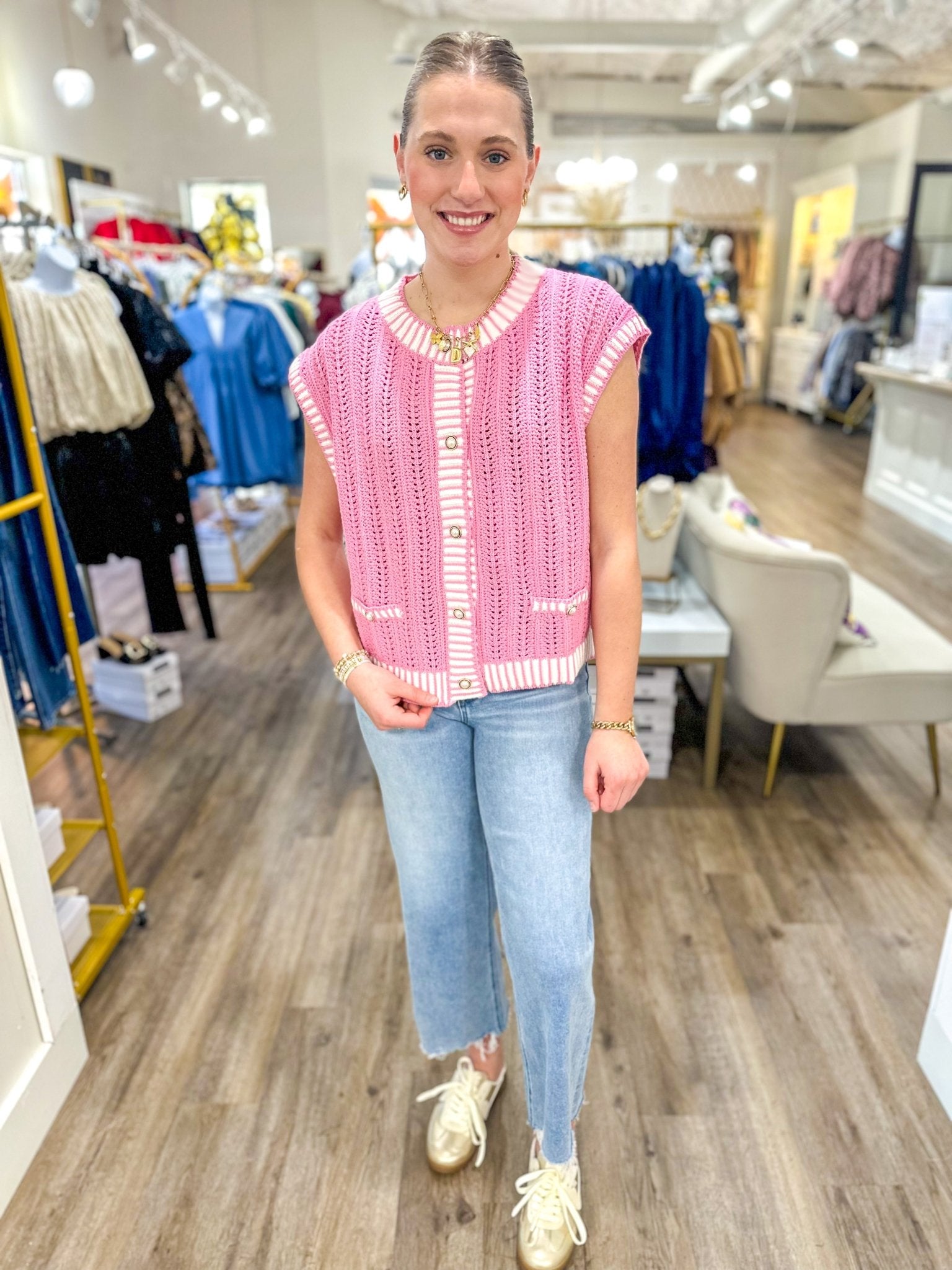A fresh, polished layering piece with soft pink striping and a classic button-front design. Perfect worn on its own or layered over a fitted tee or blouse for an elevated everyday look.