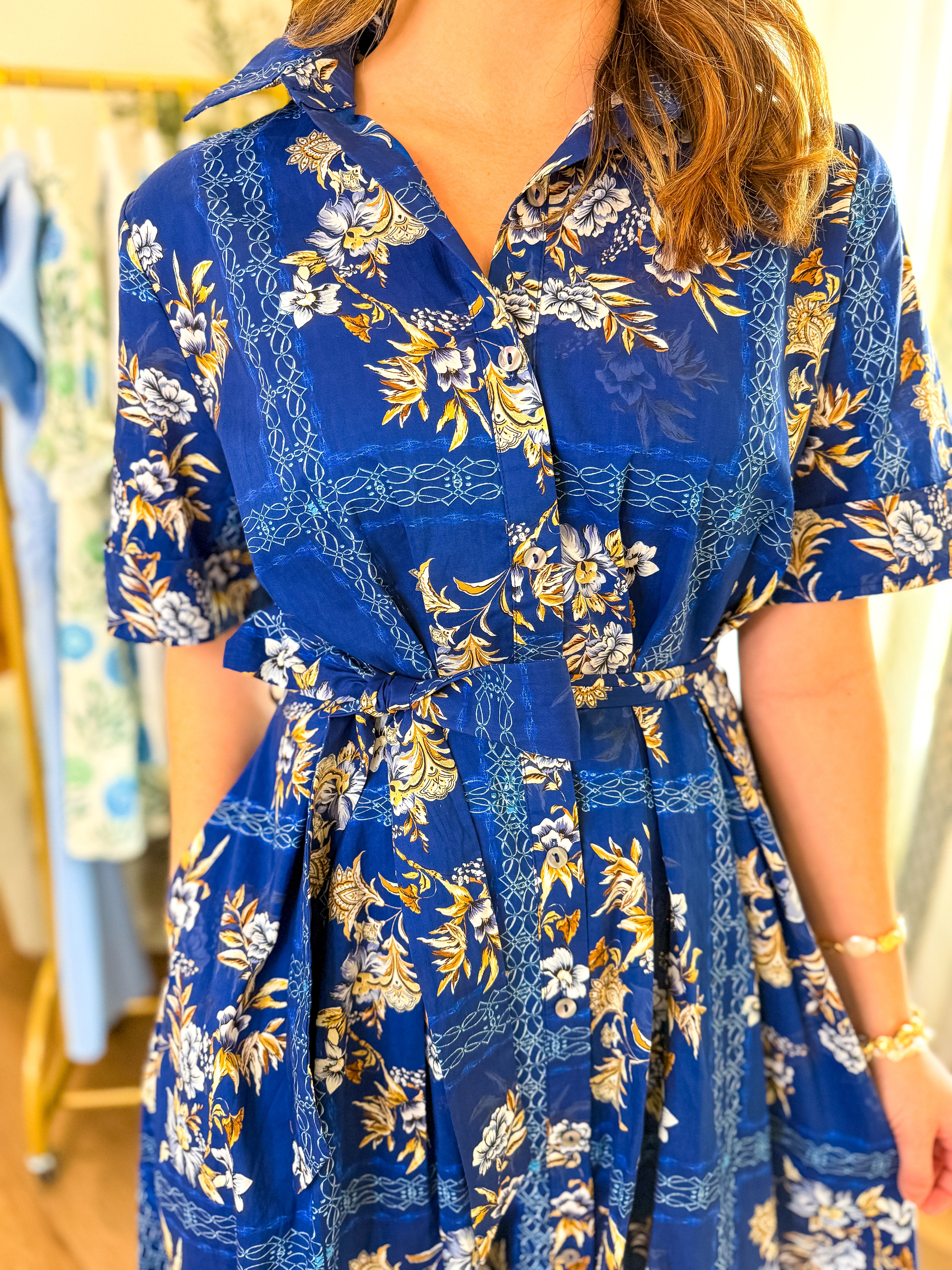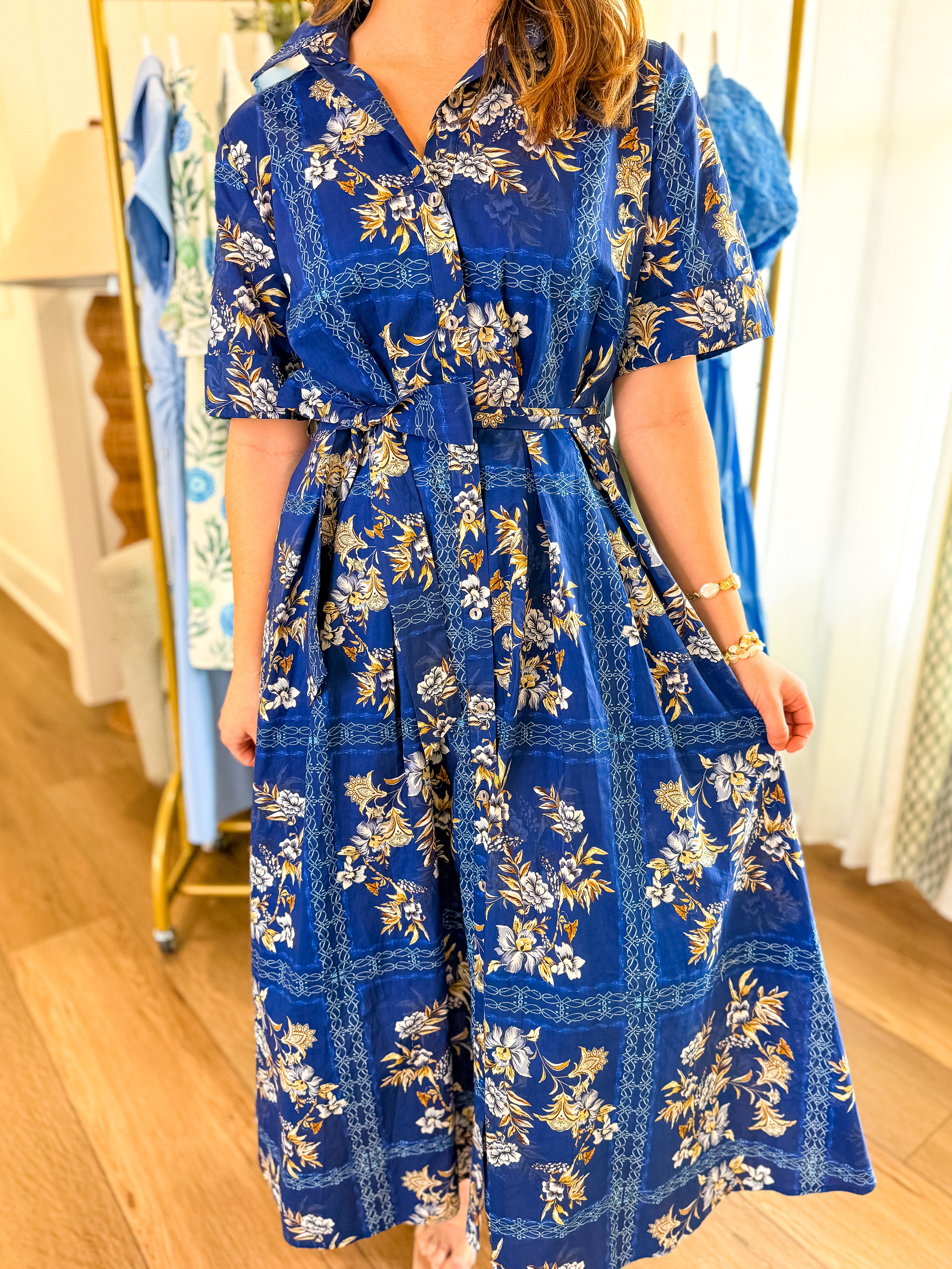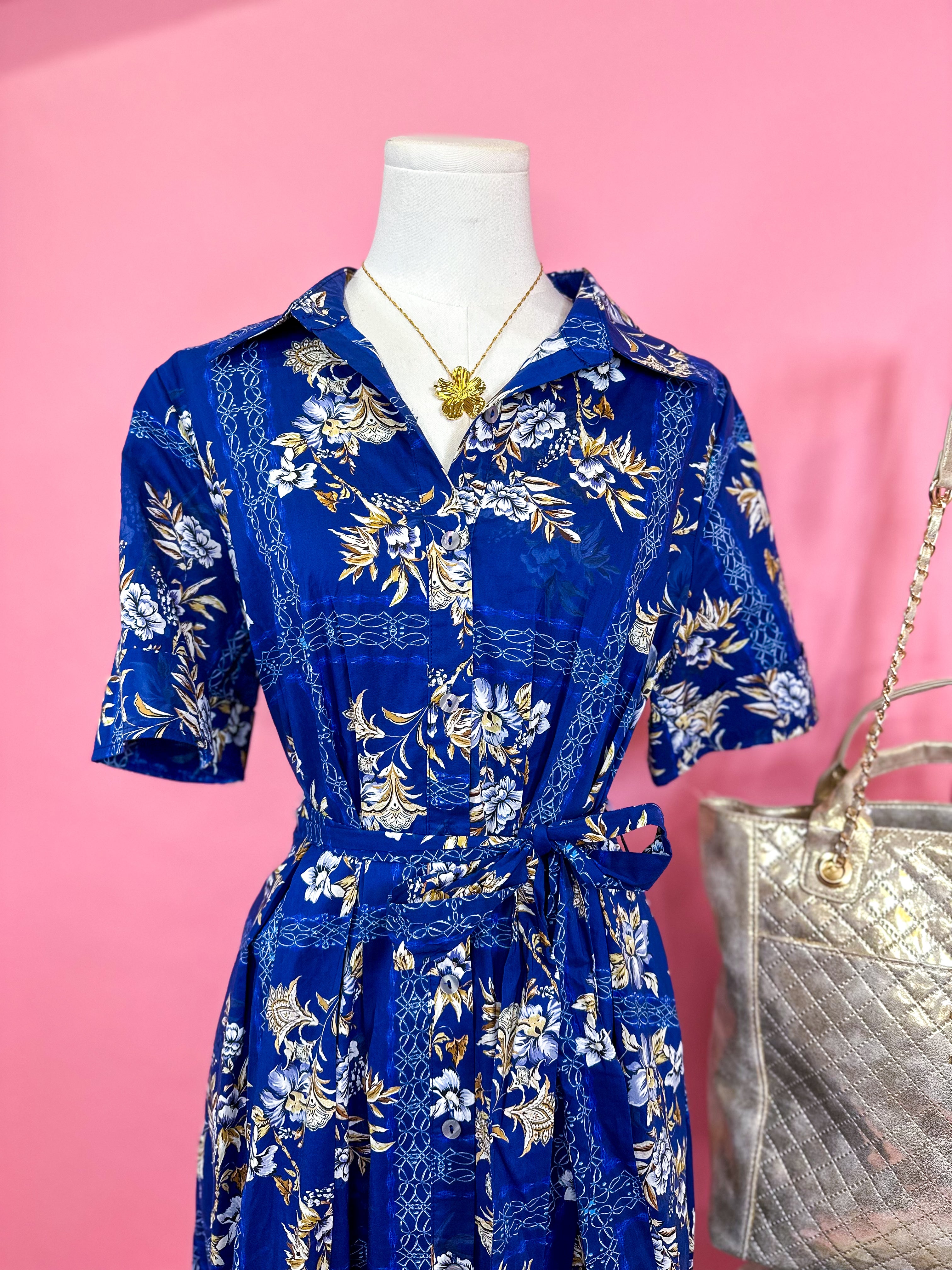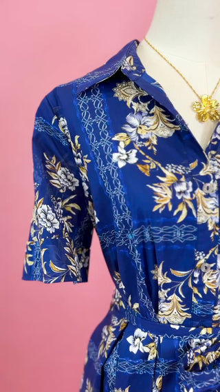 Design: Collared midi dress with a button front, short sleeves, adjustable tie waist, and a flowy skirt finished in an allover blue and ivory floral print.