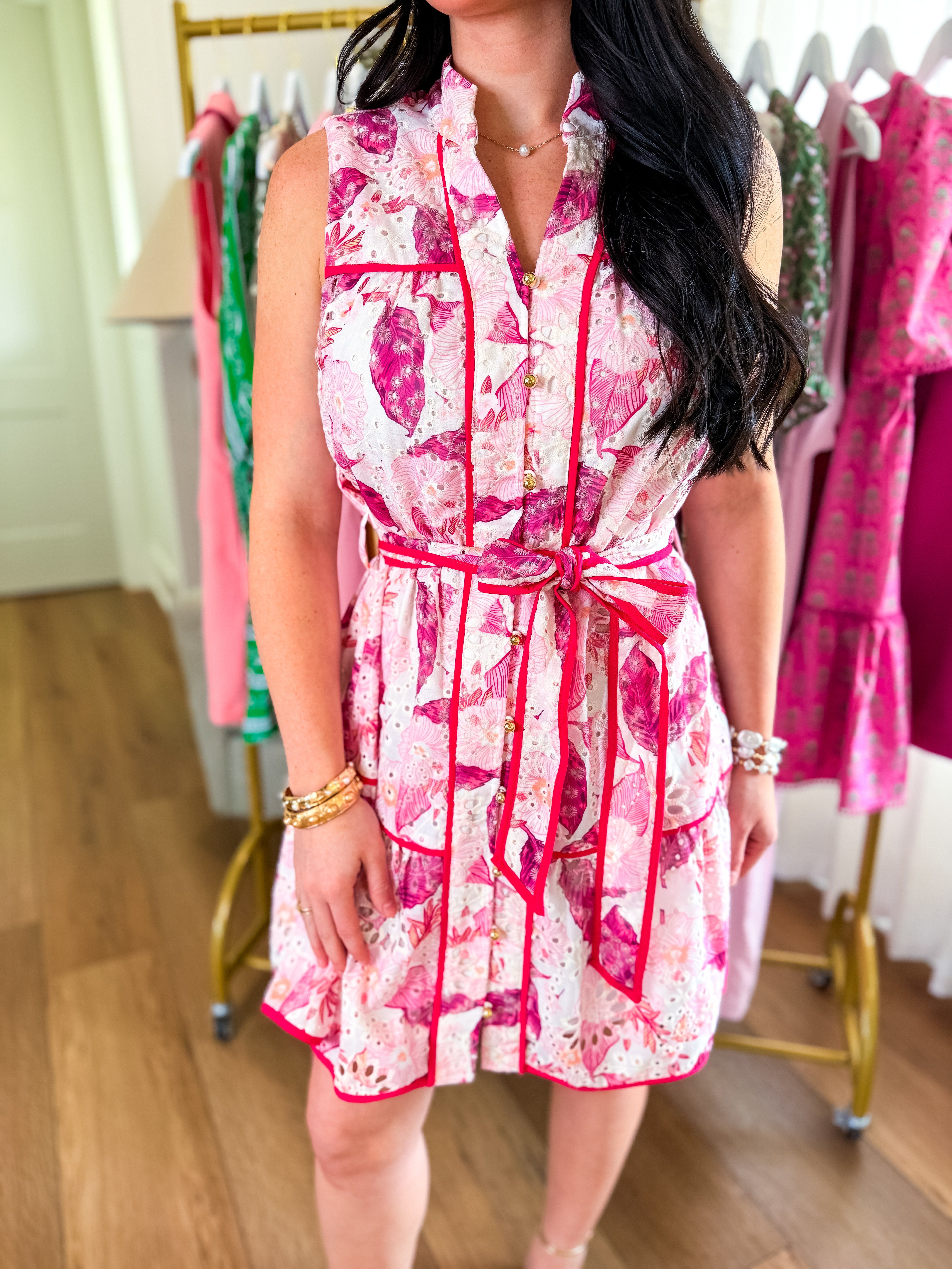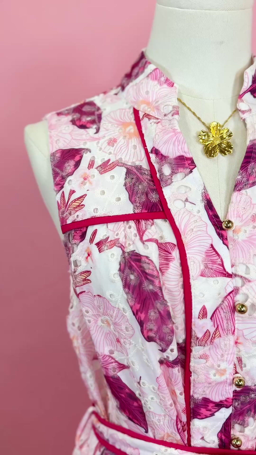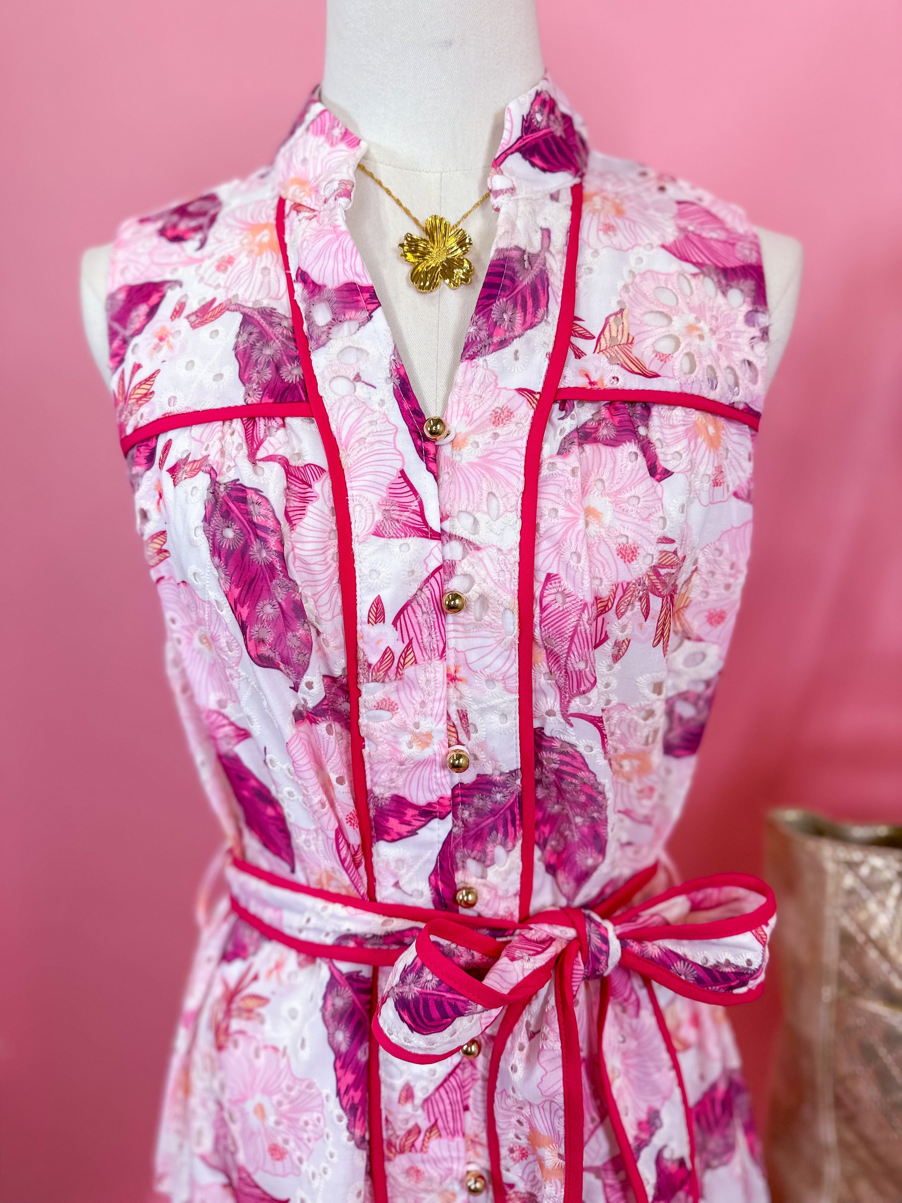 Design: Sleeveless mini dress with a collared neckline, button front, adjustable tie waist, contrast piping details, and a tiered skirt in a bold pink floral print.