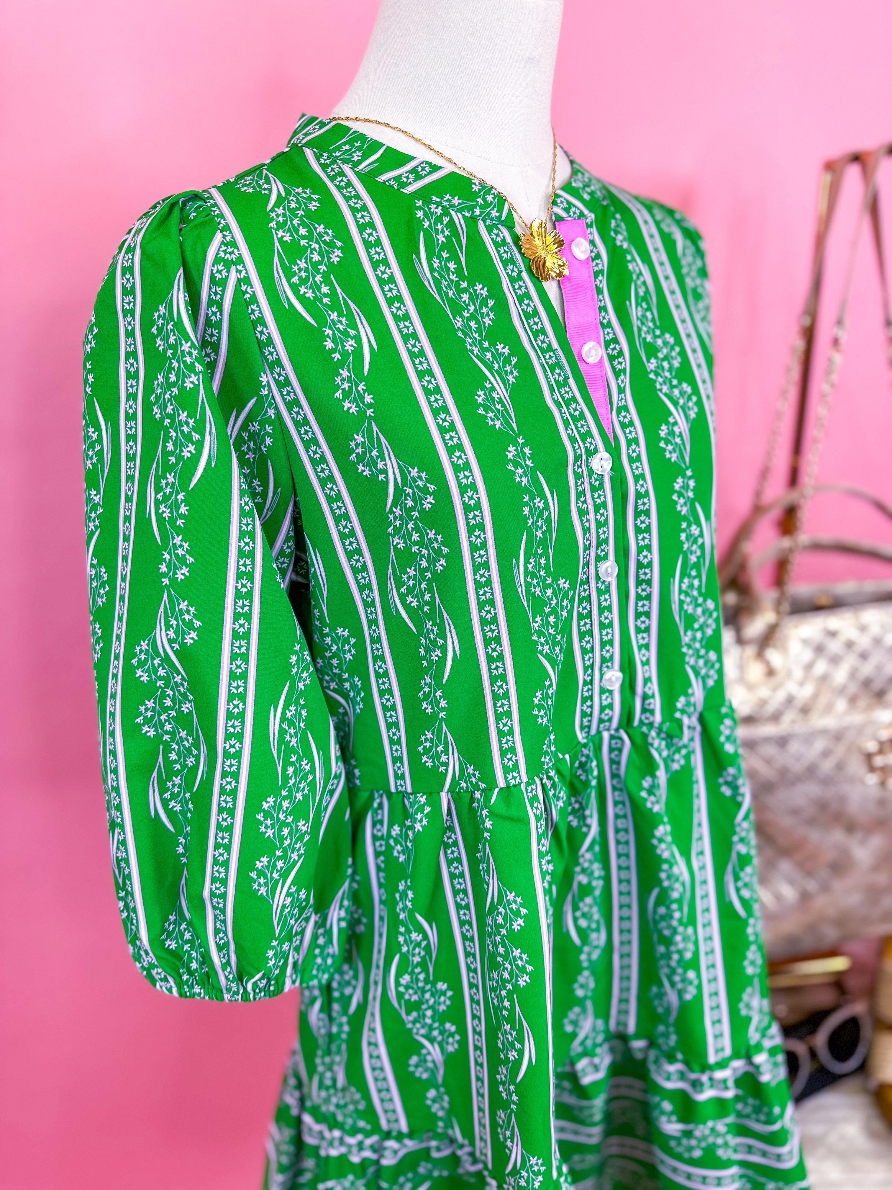 Fresh, vibrant, and full of charm, this mini dress is a standout for the season. Featuring a flattering button-front bodice with contrast trim detail and a softly gathered waist, it flows into a feminine ruffle hem for added movement. The bold green hue paired with delicate lace-inspired patterning makes it equal parts playful and polished.