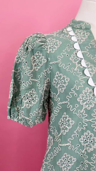 Design: Sage mini dress featuring an all-over embroidered pattern, puff sleeves, and a beautifully scalloped neckline detail for a refined, heirloom-inspired look.