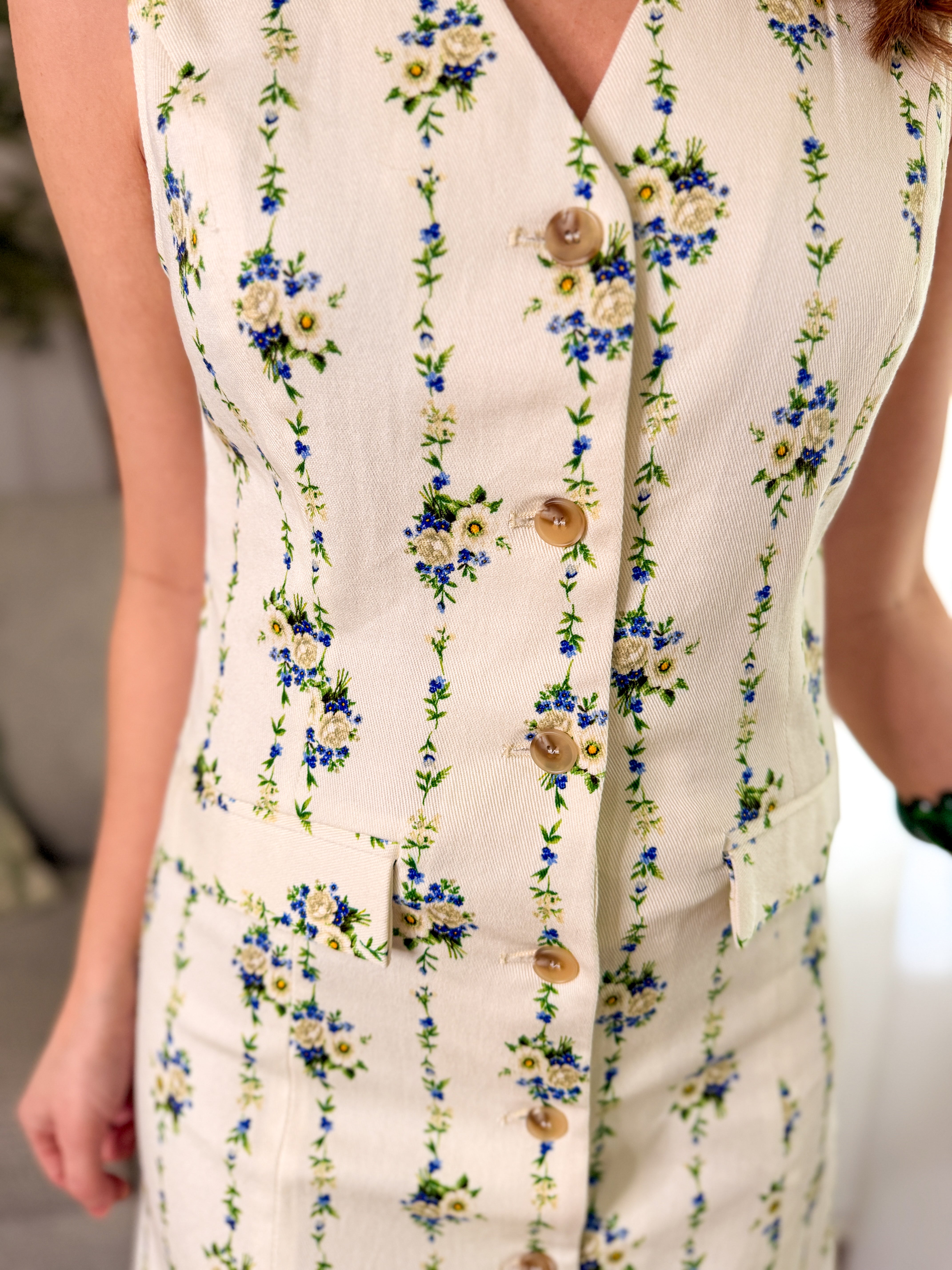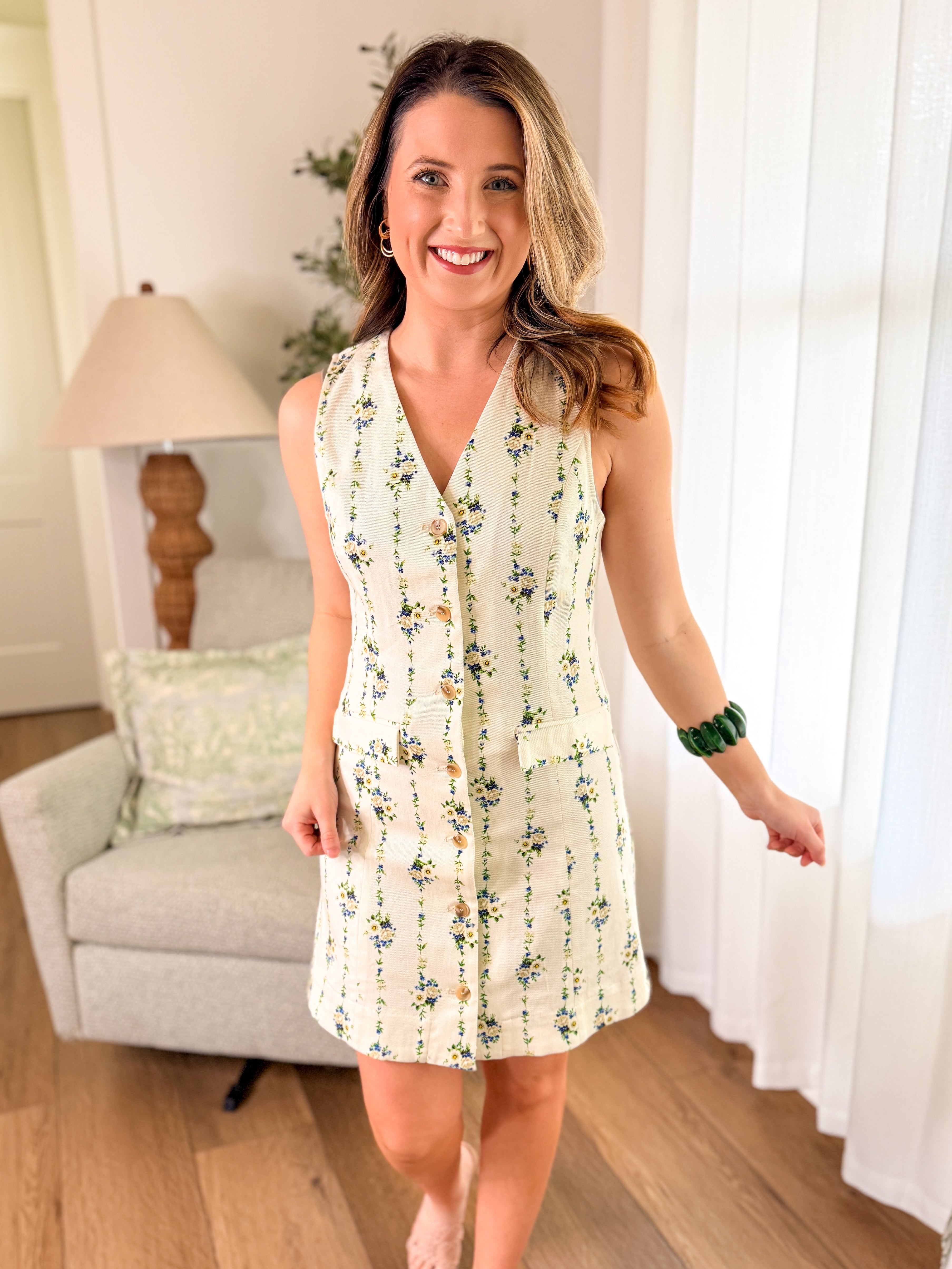 Design: Sleeveless mini dress featuring a soft cream base with dainty blue floral print, a flattering V-neckline, front button detail, and functional front pockets for an easy yet polished silhouette.