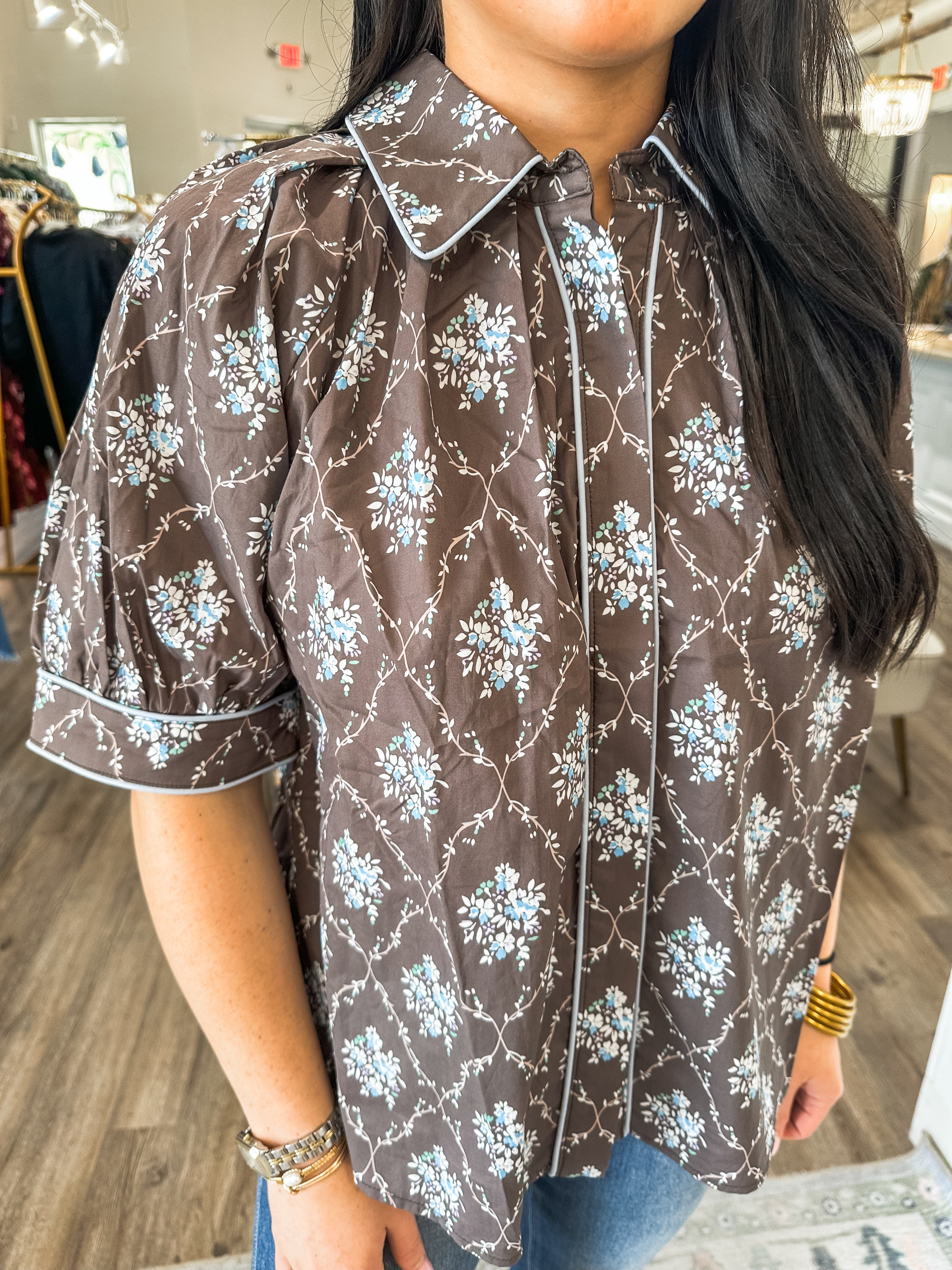 A timeless button-down with vintage-inspired charm, this coffee-hued floral top pairs perfectly with denim, trousers, or layered under a cozy cardigan.