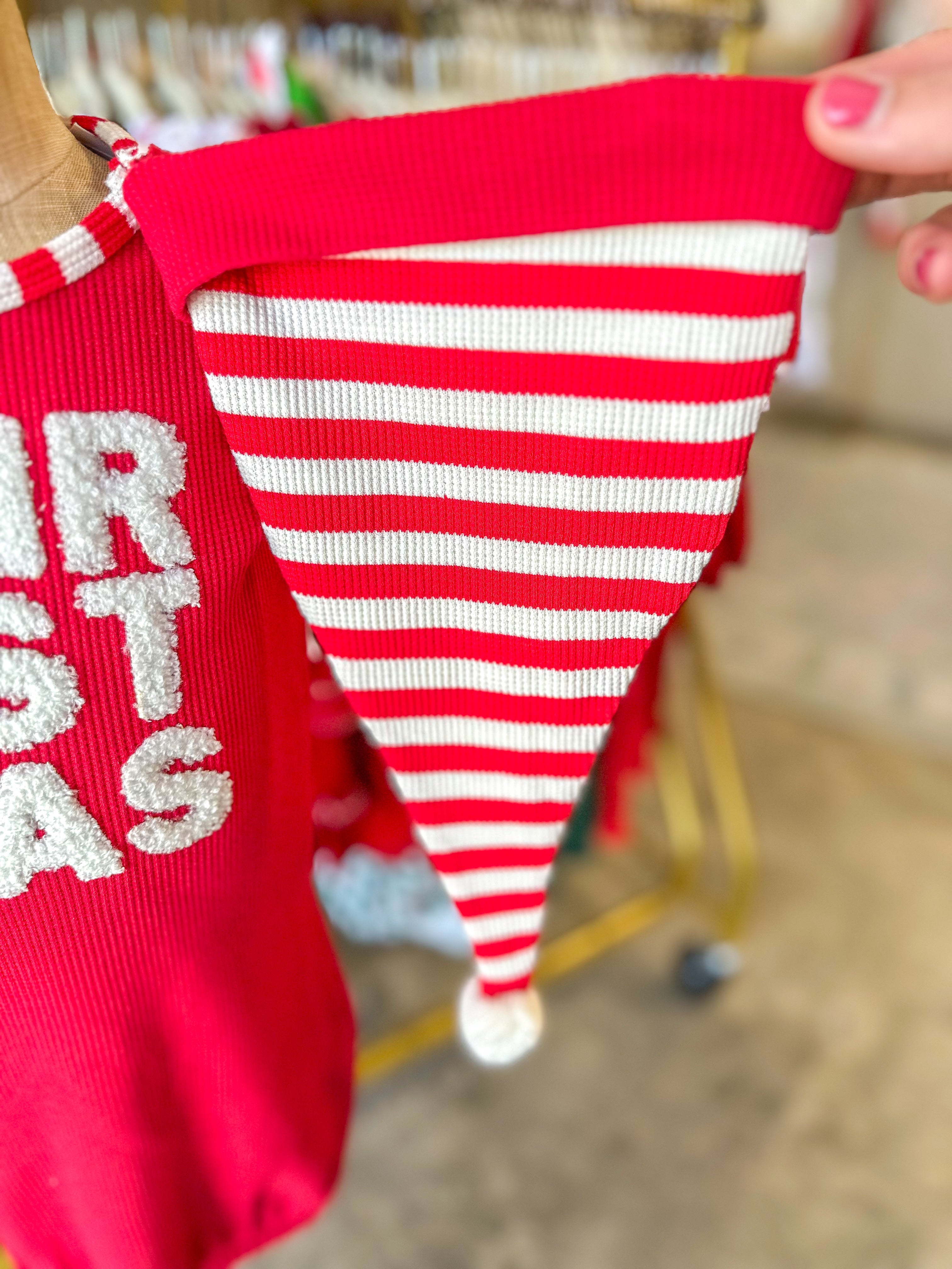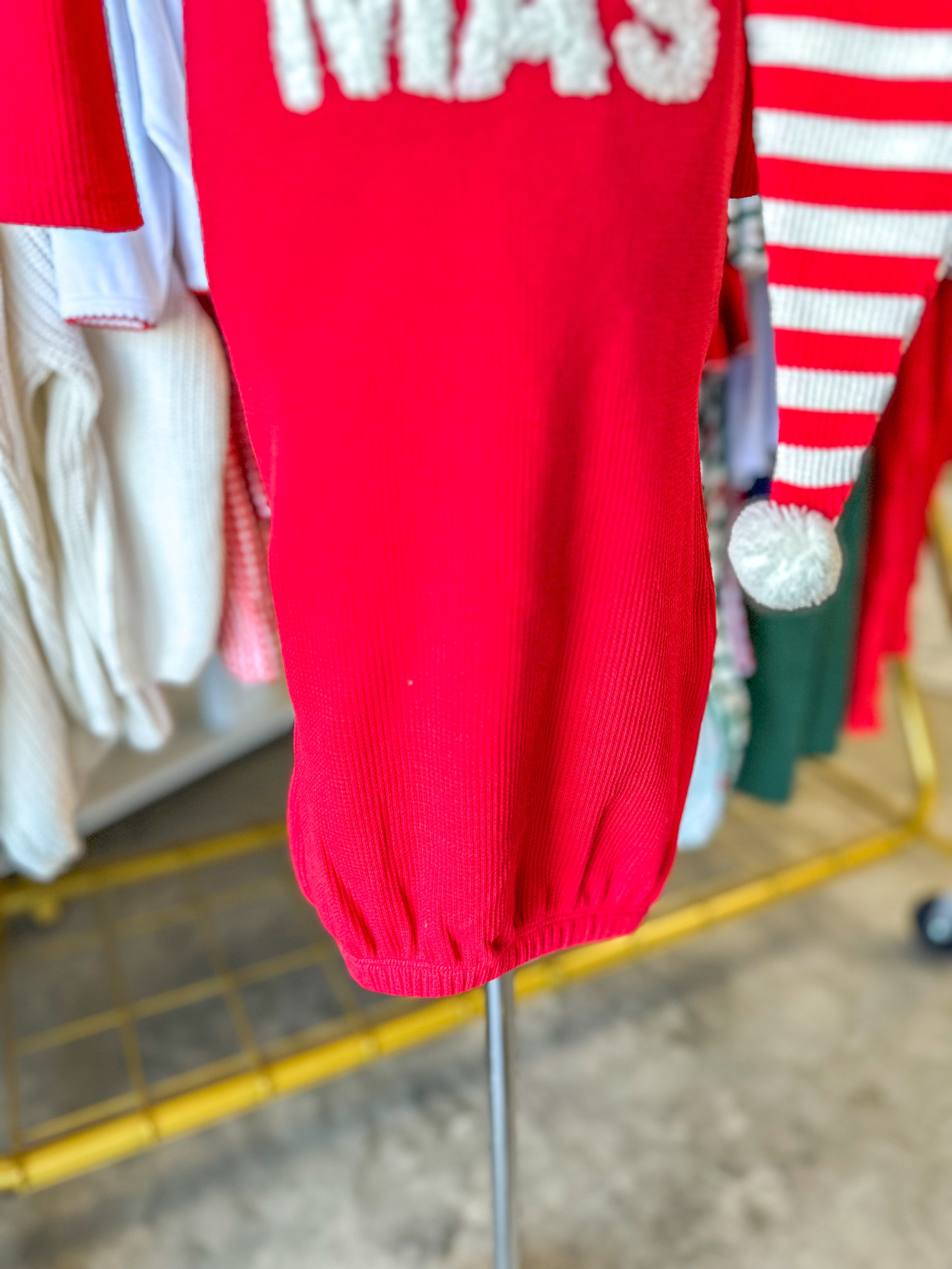 The red knit romper features a sweet “CHRISTMAS” appliqué with little tree details, paired with candy-cane striped pants and a matching hat for the cutest holiday debut. Perfect for those first photos under the tree or cozy cuddles by the fire!