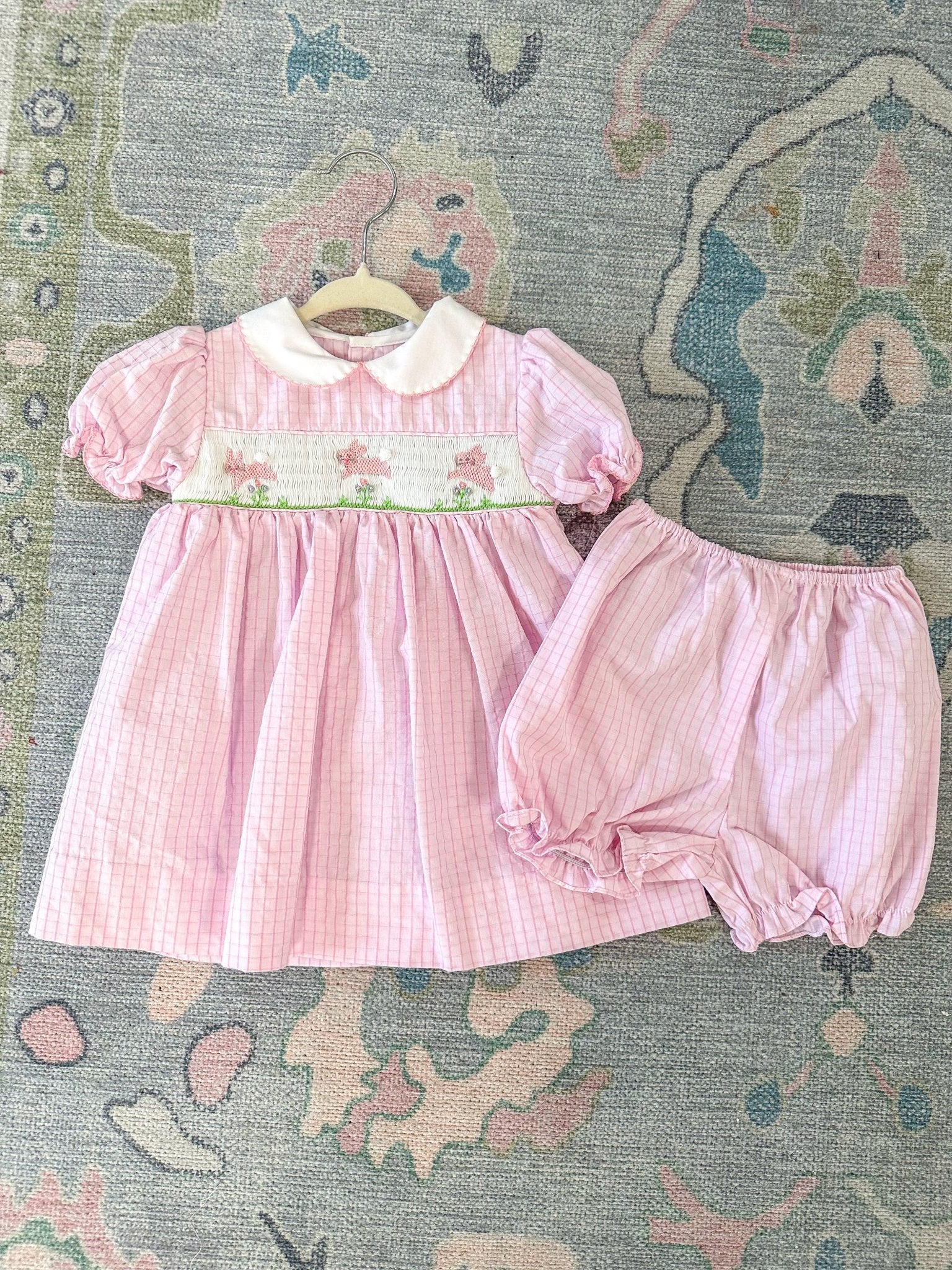 - Soft pink gingham fabric with hand-smocked bunny and carrot detail