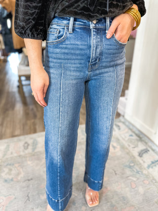 Nellie Medium Wash High Rise Crop Straight Distressed Hem Jeans- Risen