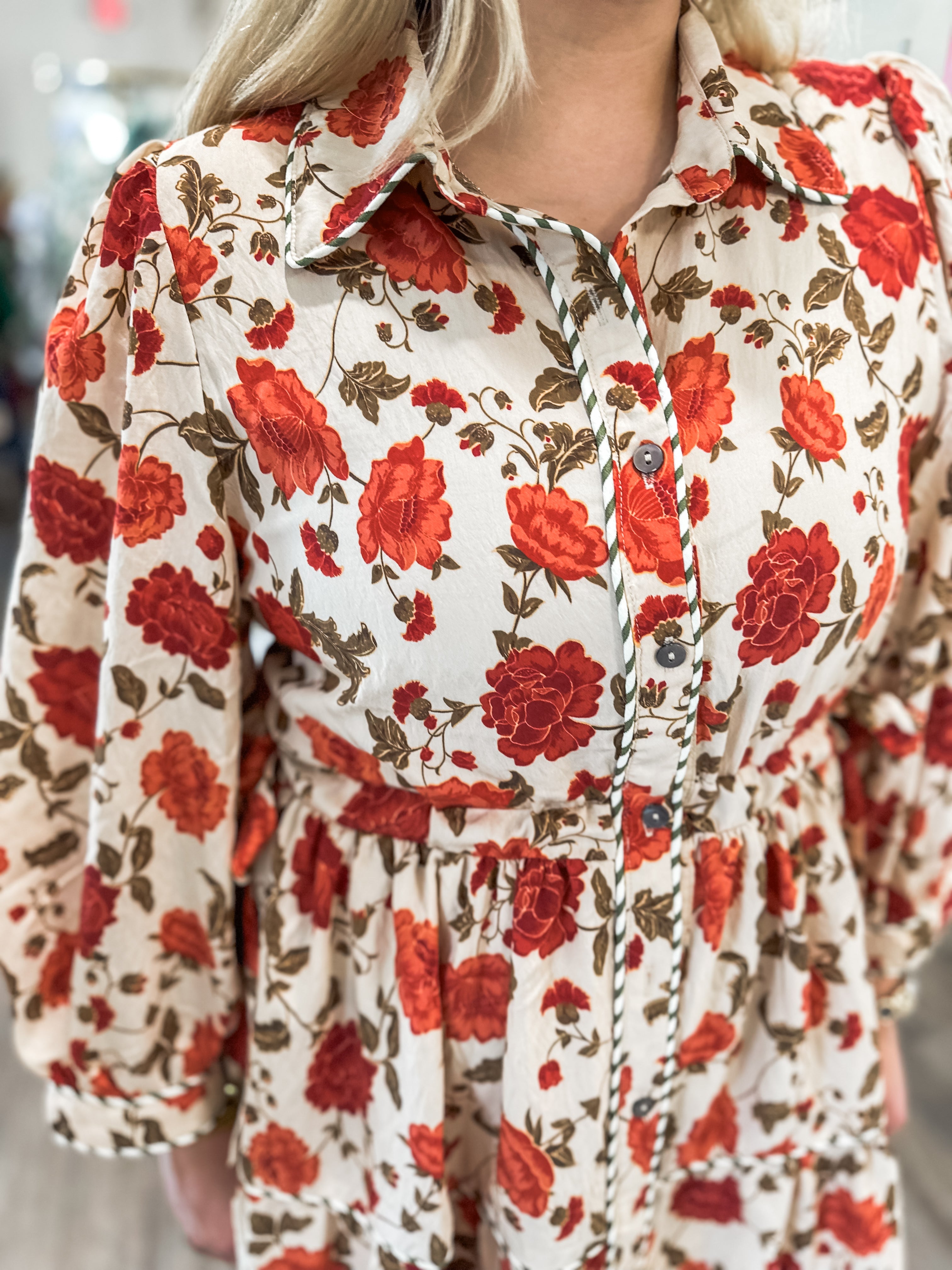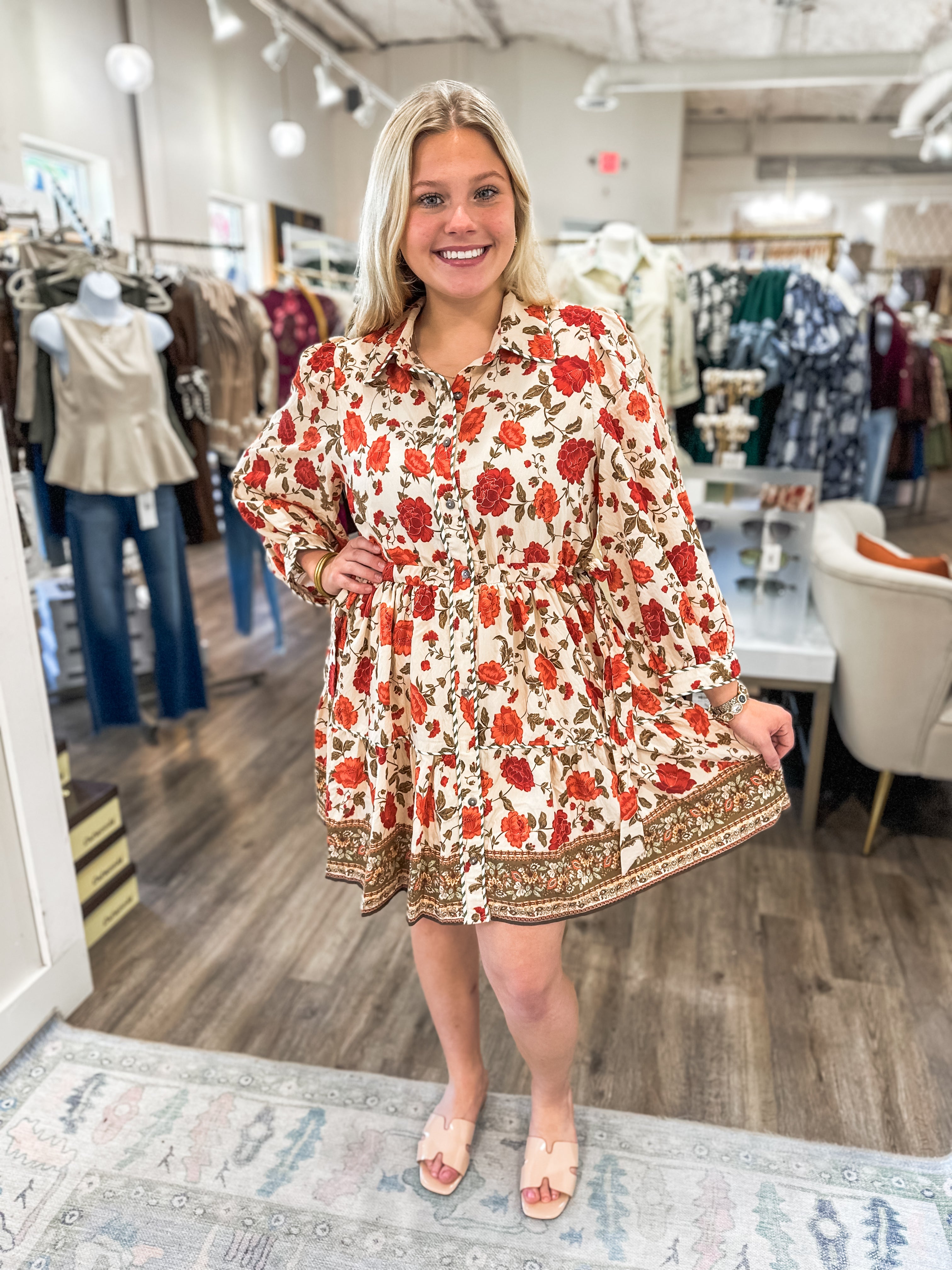 Bring charm to your fall wardrobe with the Harvest Honey Ecru Mini Dress. This sweet and feminine style pairs delicate florals with an easy, flowy fit—perfect for seasonal gatherings, brunch dates, or even Thanksgiving with the family.