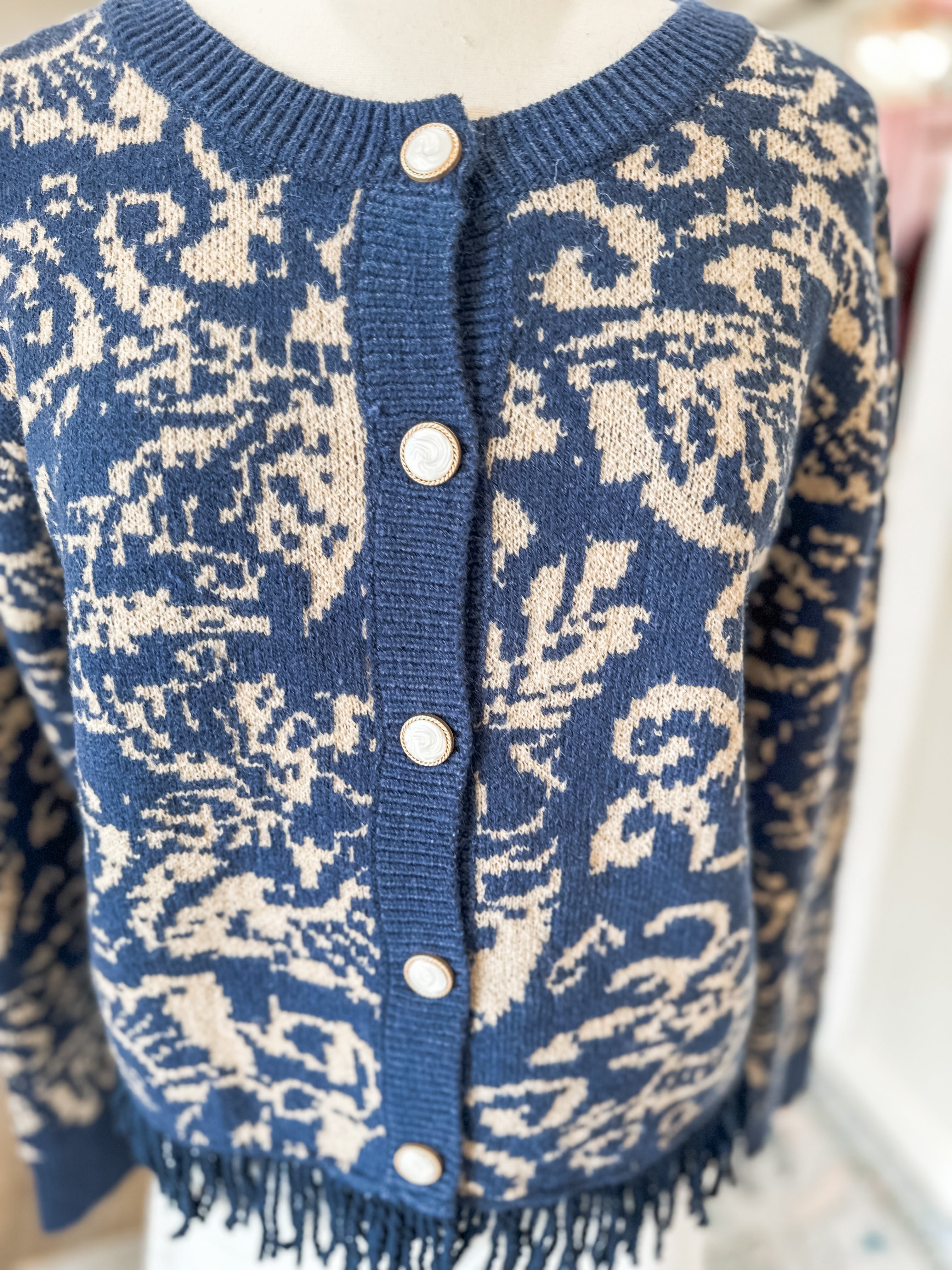 The rich navy knit features a vintage-inspired chateau pattern in cream, finished with fringe trim and pearlescent buttons for a touch of feminine flair.