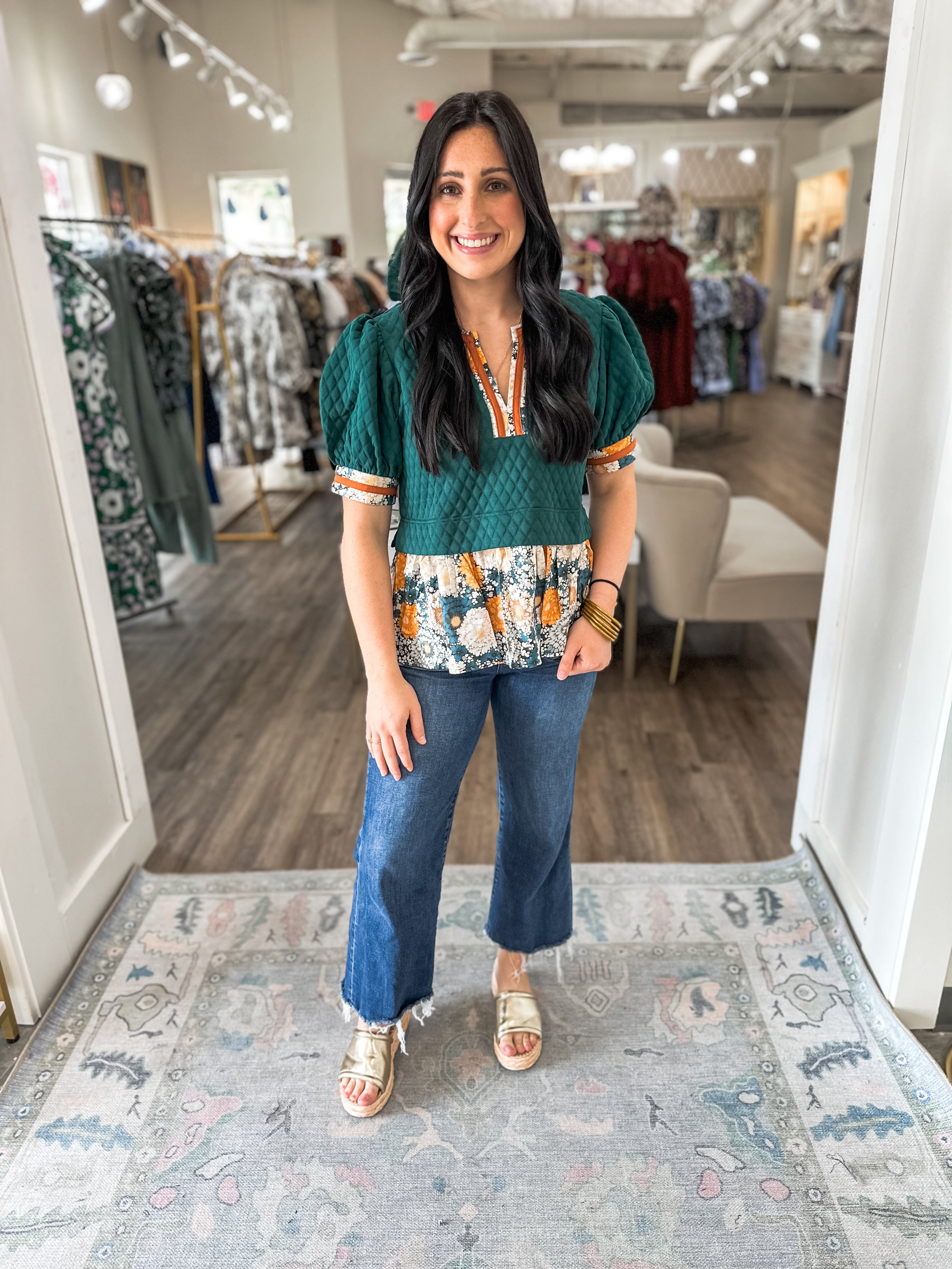 Add a dose of charm to your everyday style with The Quilted Cottage Peplum Top. This unique piece blends cozy quilted texture with a breezy floral peplum for a feminine-meets-casual look. The contrast neckline and cuff details add a pop of color, making it a versatile option for fall outings or cozy gatherings.