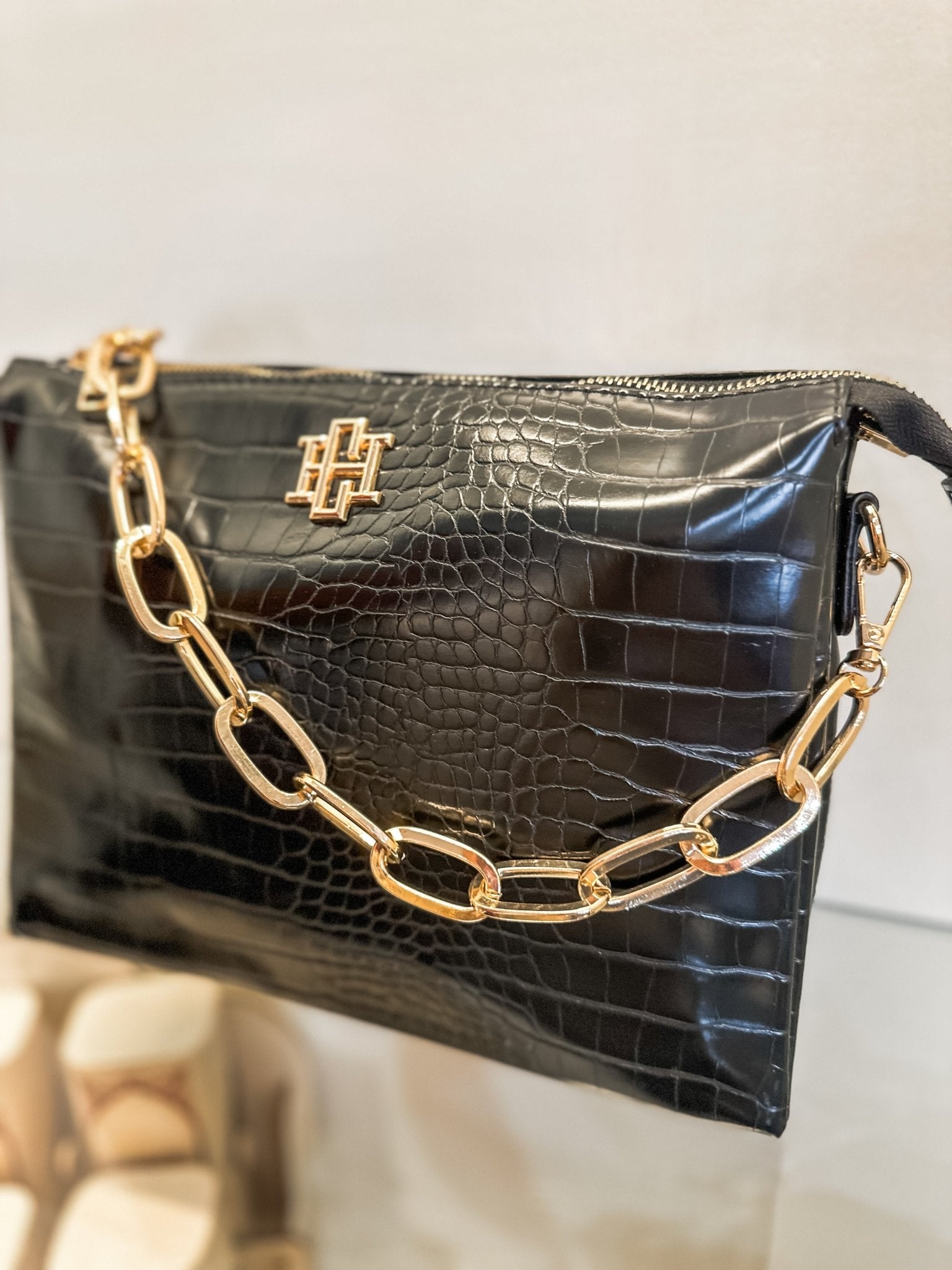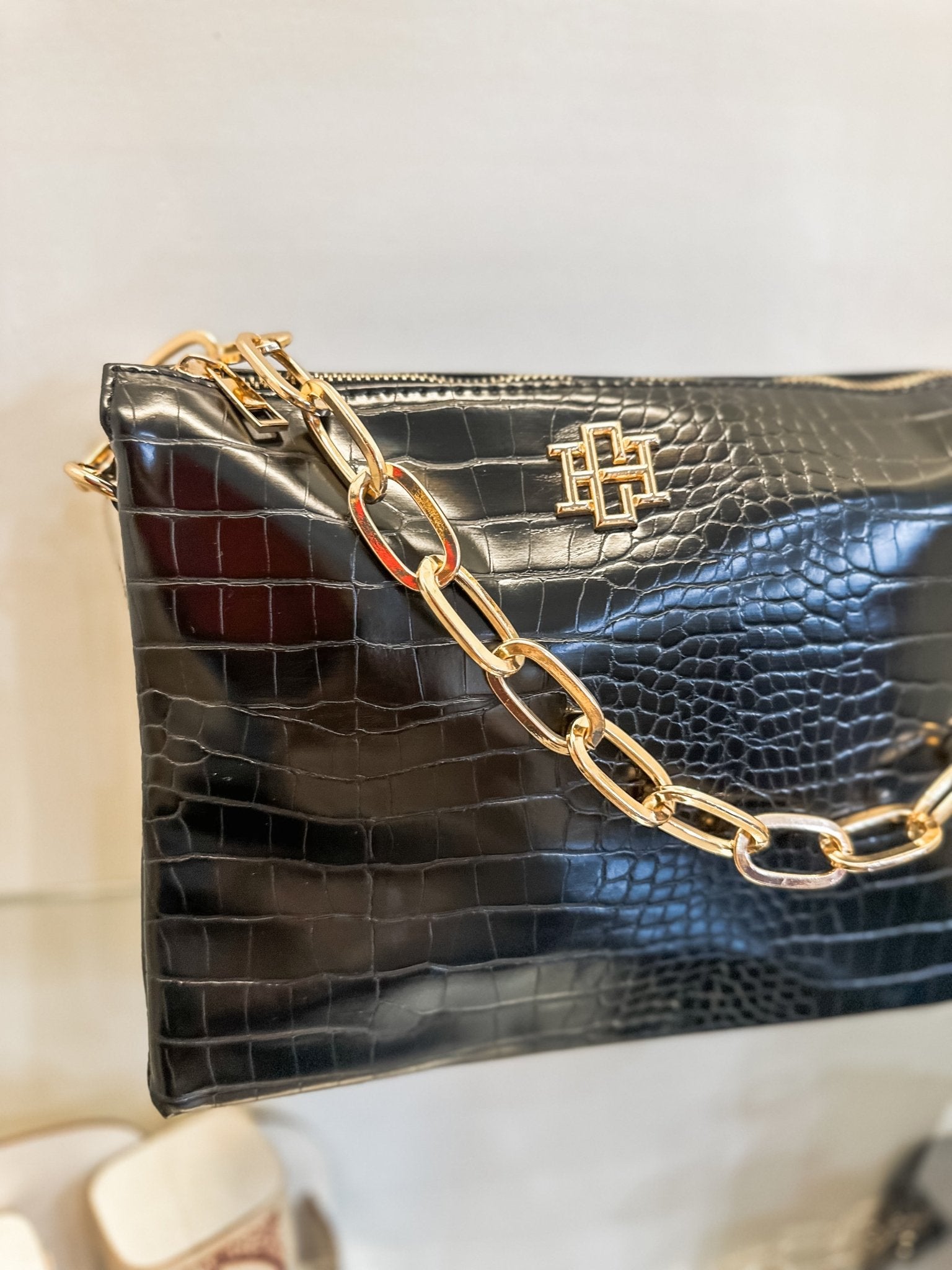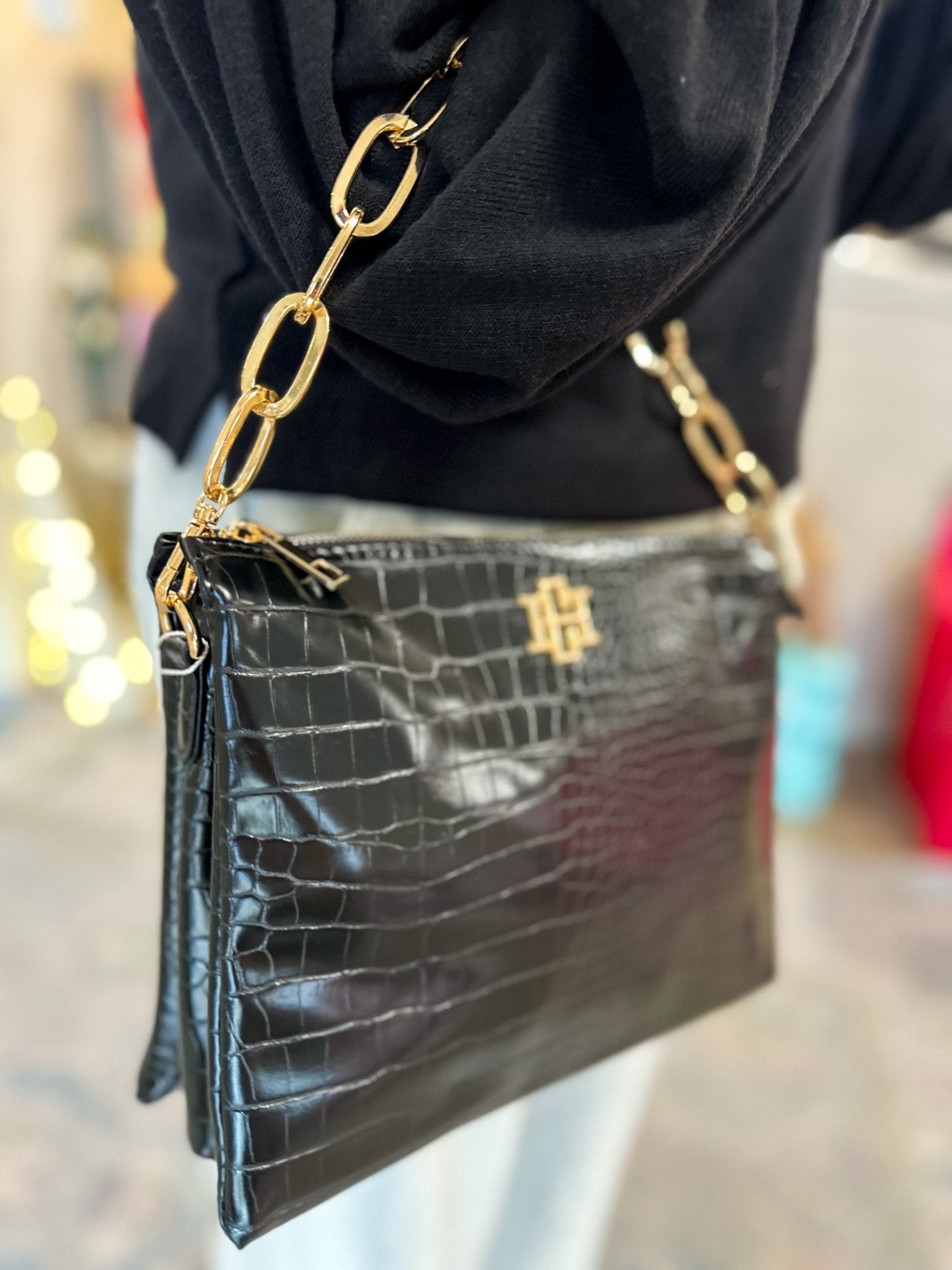 This quilted vegan leather crossbody is so fashion forward! It has a chunky gold chain accent that is removable, and it can be used as a carrying strap as well. The crossbody strap is made of nylon and is also adjustable and removable. The top zipper closure leads to two open compartments as well as a third middle zippered section. It also has two smaller internal open pockets and one zippered pocket.