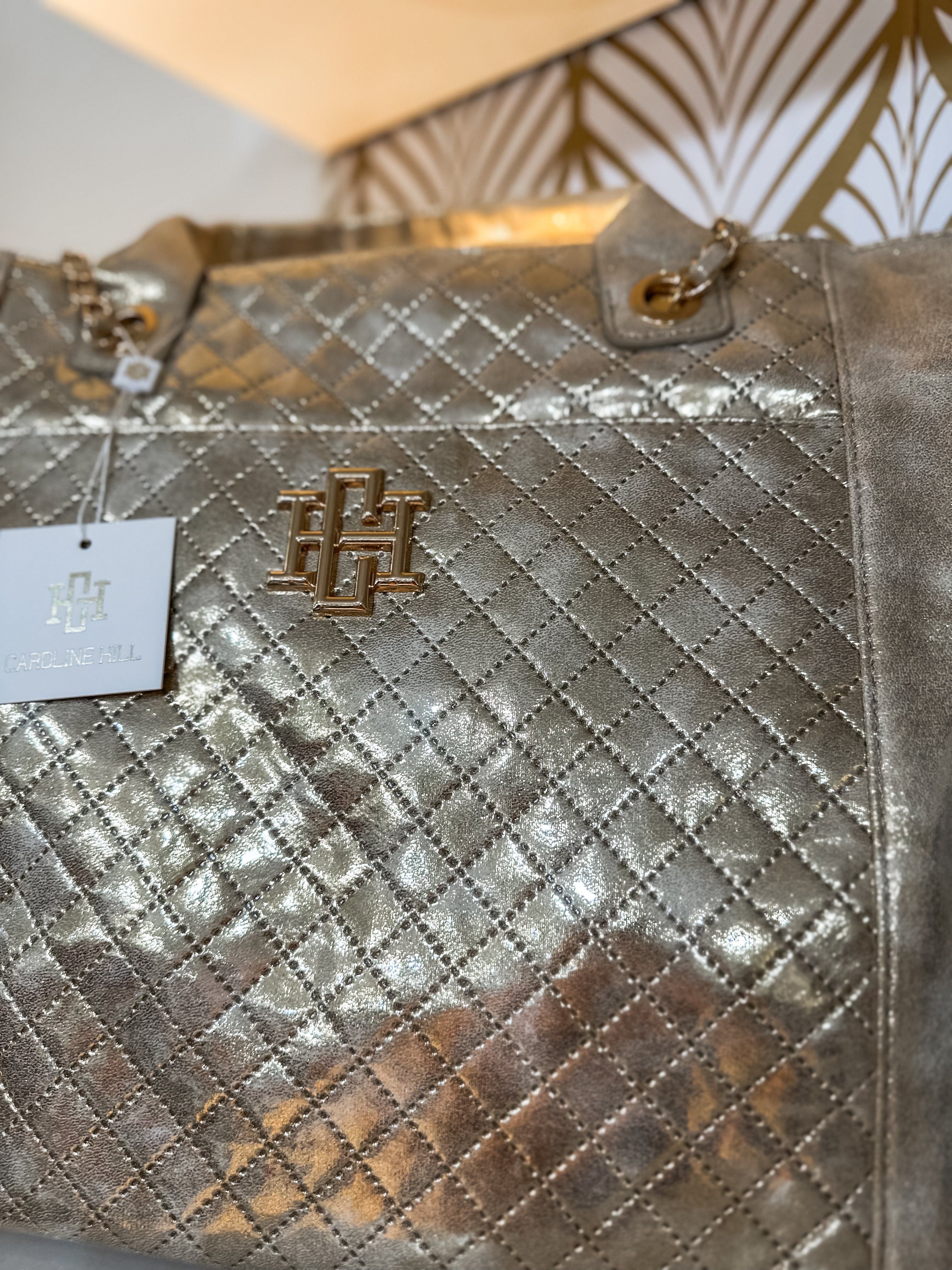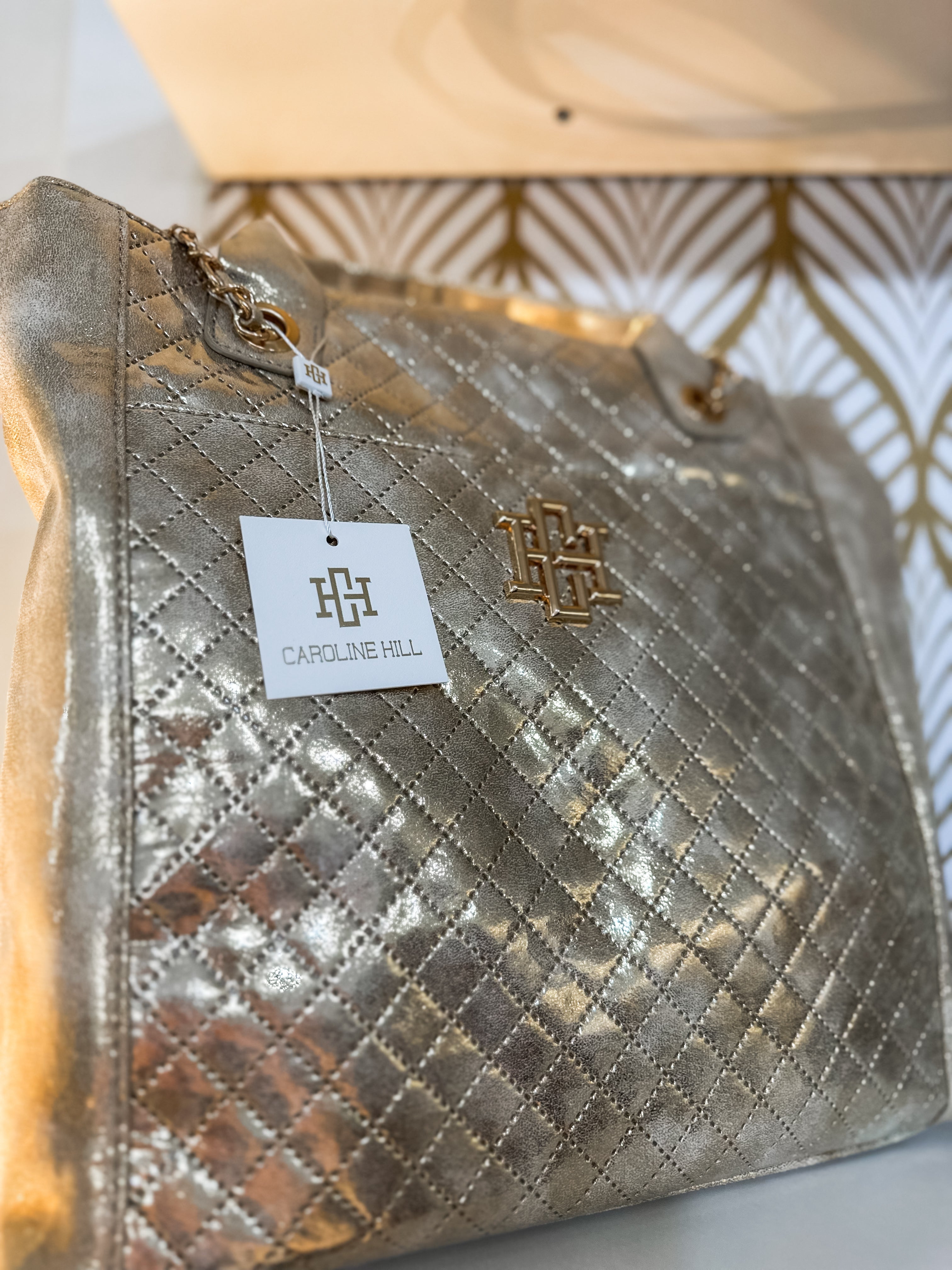 Chic, structured, and oh-so-classic — this quilted tote is the ultimate everyday bag. The champagne pop quilted design gives it a timeless luxe look, while the spacious interior keeps it practical for work, errands, or travel. Finished with gold Caroline Hill hardware and sturdy handles, this tote adds elegance to any outfit.