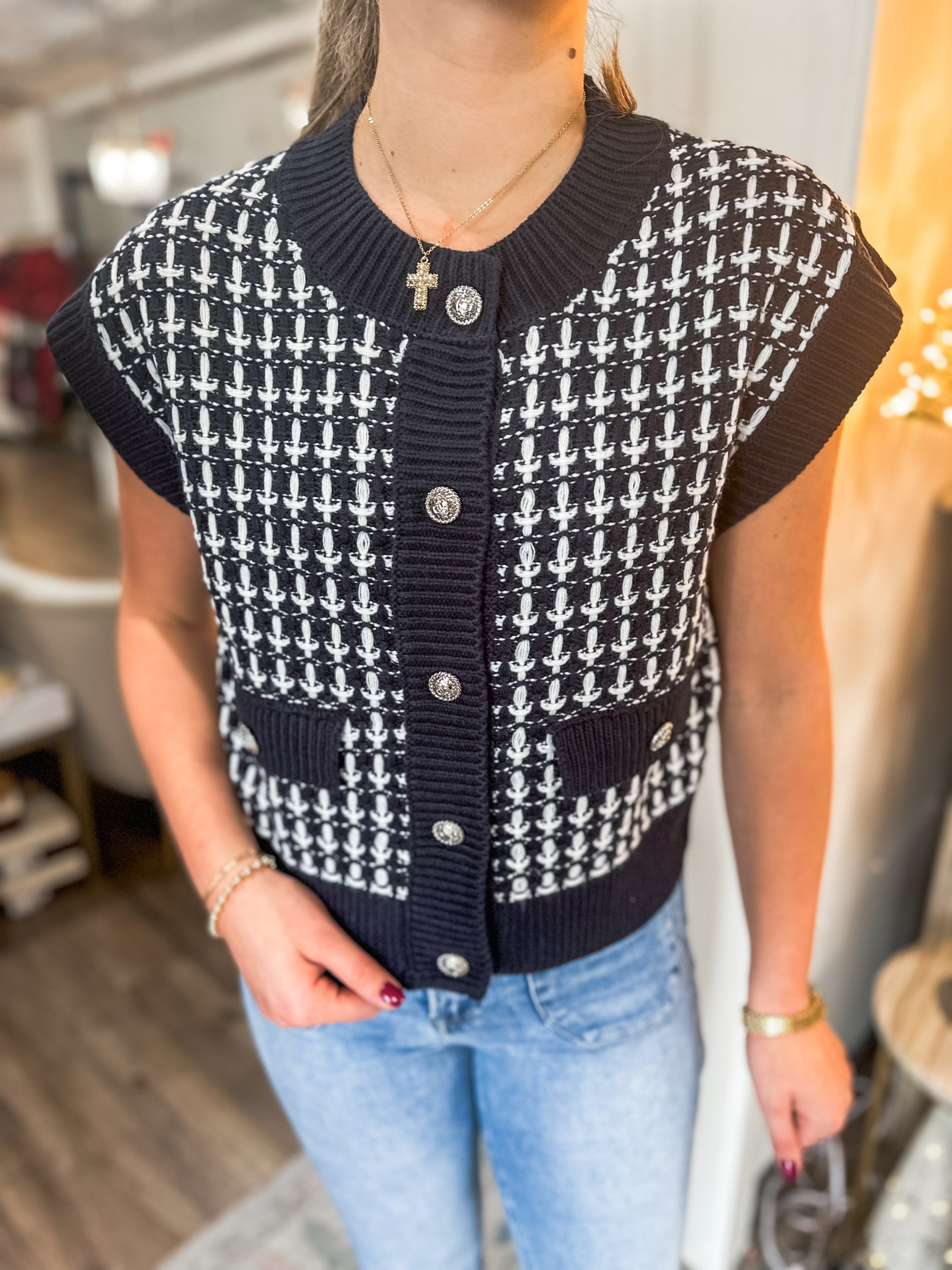 A chic layering piece with a festive touch, the Navy Tweed & Tinsel Sweater Vest blends cozy knit texture with classic tweed-inspired style. Its rich blue base is accented by a cream pattern and subtle metallic threads for a hint of shimmer. Silver statement buttons and faux front pockets add a polished, vintage vibe. Perfect over a blouse for the office or layered casually with jeans for the weekend.