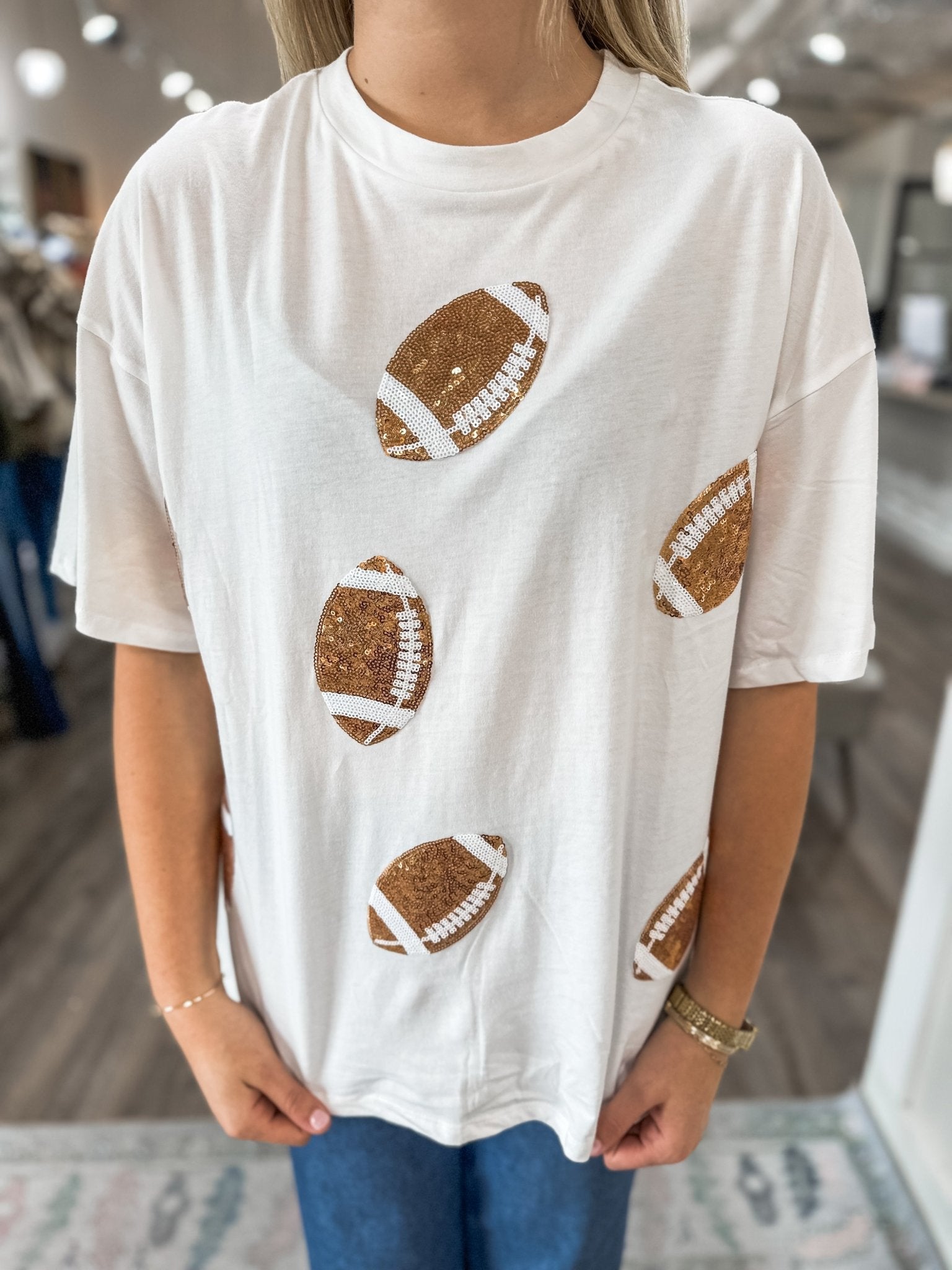 Game day, but make it sparkly! This oversized football tee adds the perfect pop of fun and spirit whether you’re tailgating, in the stands, or cheering from home.