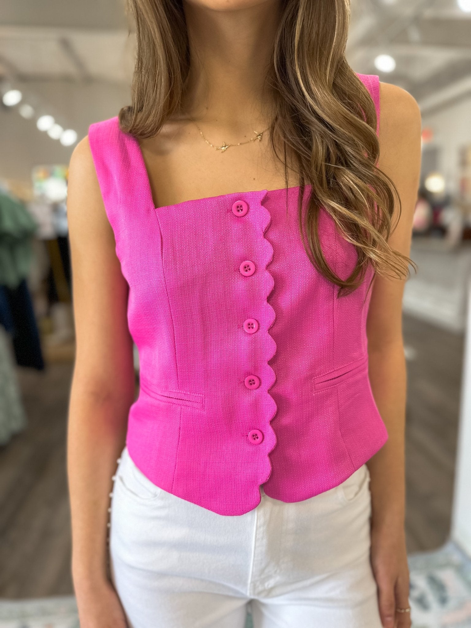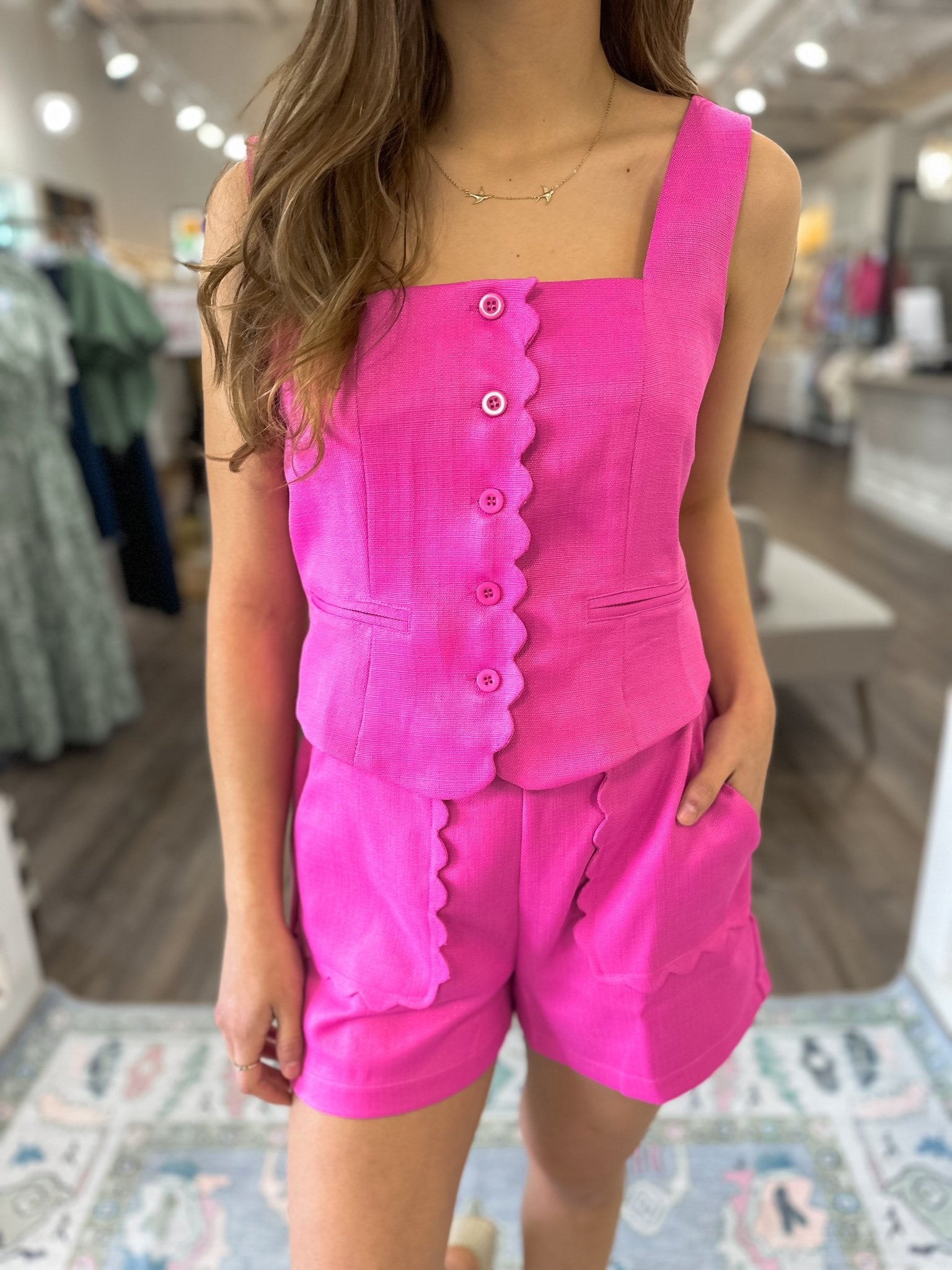 Add a pop of fun and color to your wardrobe with this playful flamingo pink set, featuring a scalloped detail that adds a touch of elegance to the casual design. The matching shorts and top offer a comfortable, flattering fit that’s perfect for warm-weather days. Whether you're lounging by the pool or enjoying a sunny afternoon, this set blends whimsy with style for a look that’s as sweet as it is chic. Sizze Guide: Small 2/4, Medium 6/8, Large 10/12.