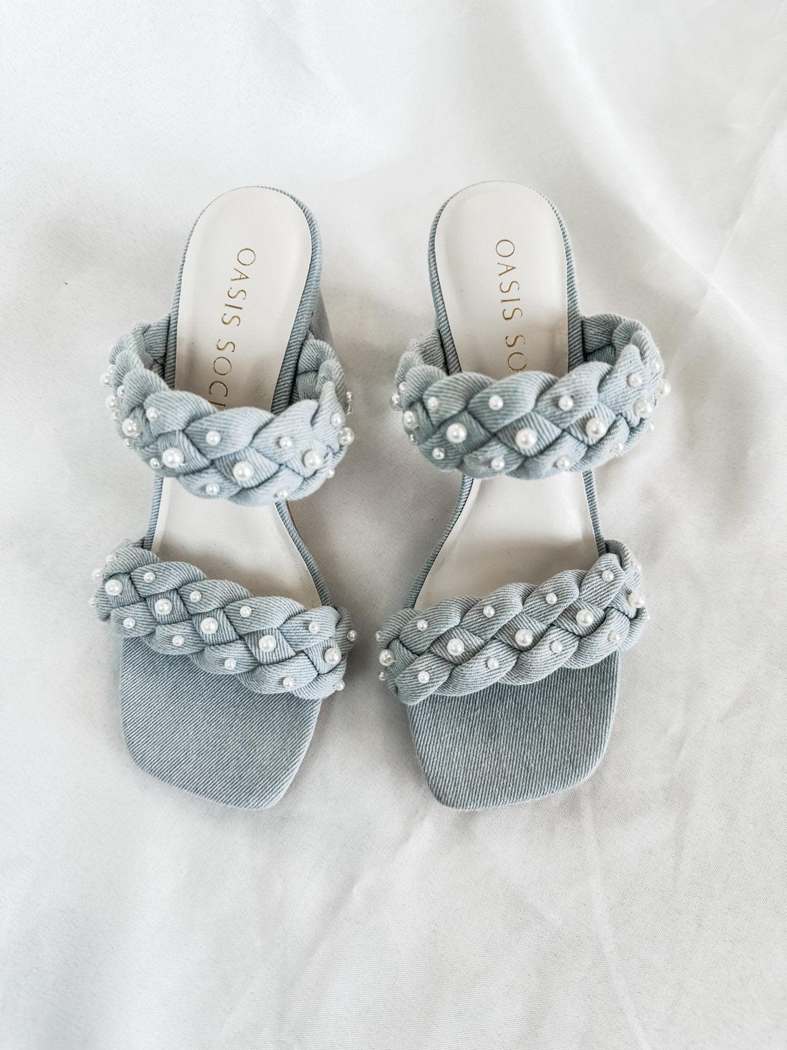 The Parisa Braided Pearl Sandal Heels Denim Blue - Oasis Society