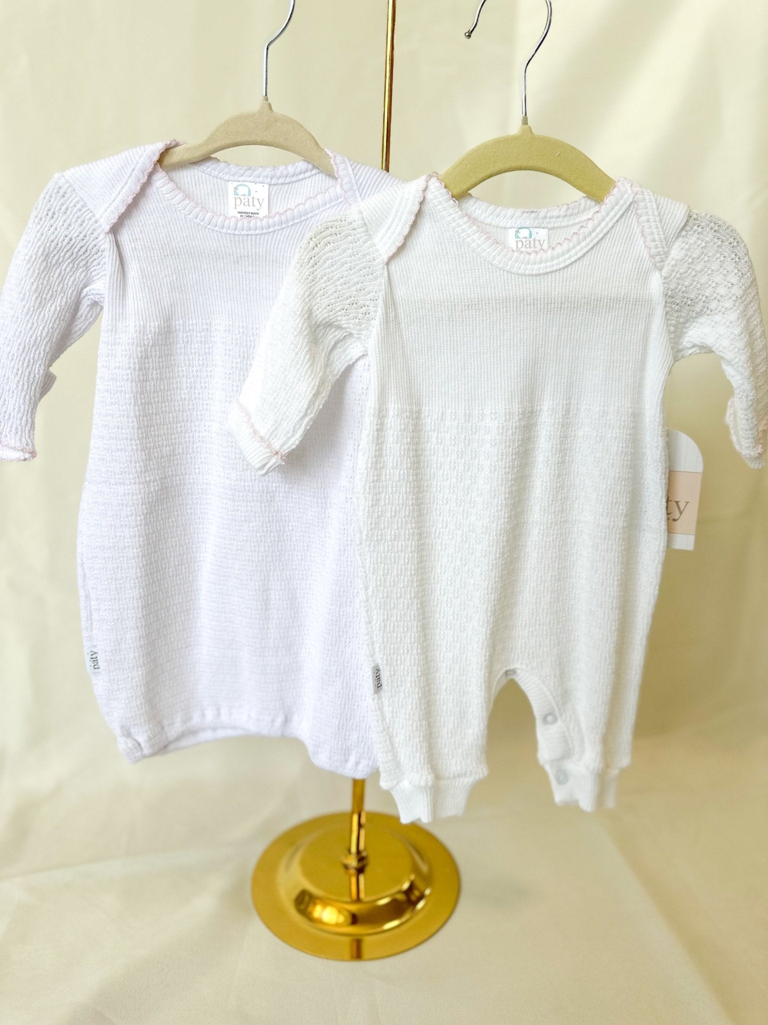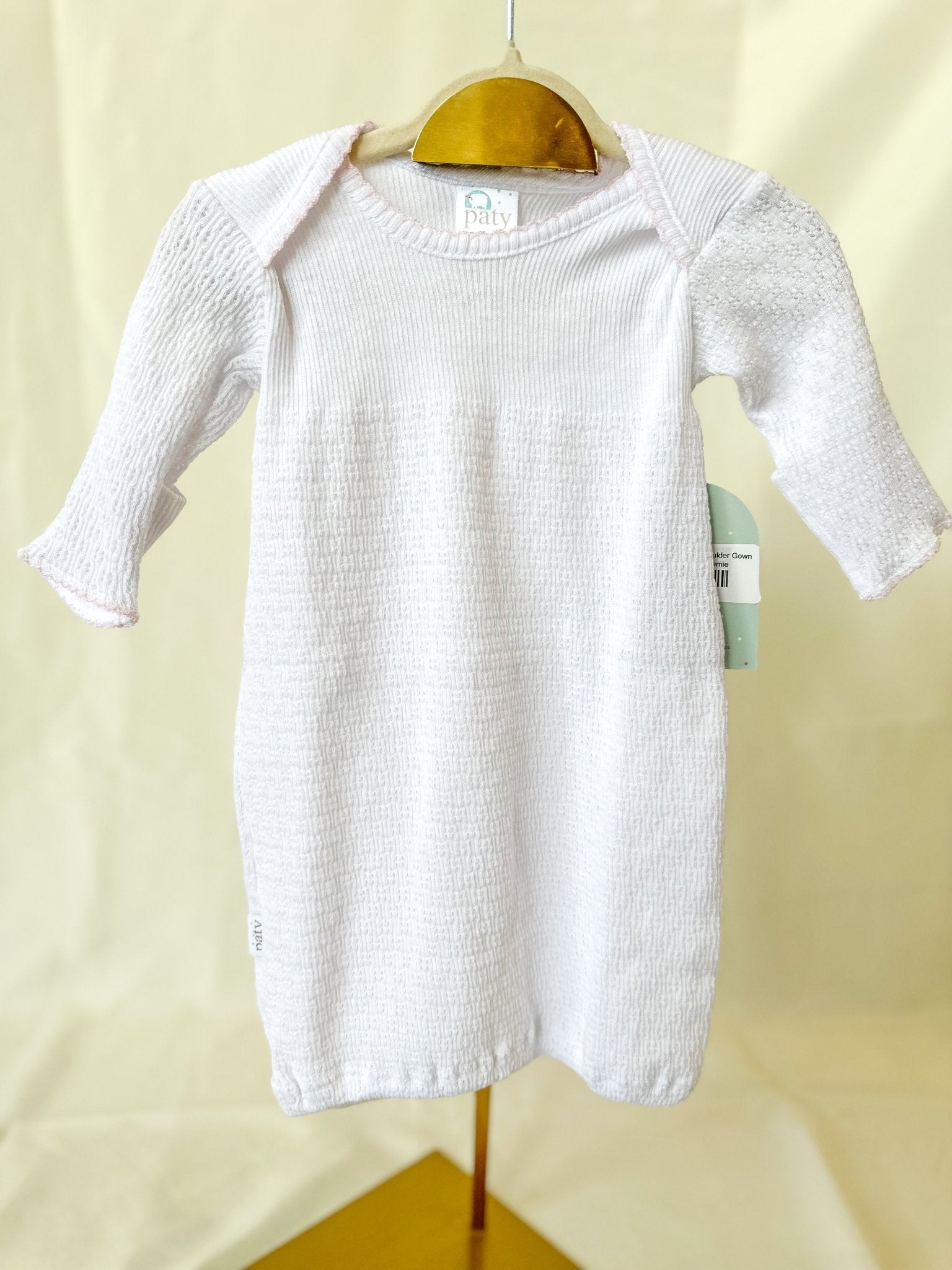 The sweetest start for your little girl—timeless, cozy, and made to be loved. Whether you're bringing her home from the hospital or prepping for newborn photos, this soft and delicate gown is a keepsake piece you'll treasure forever. The pink trim adds just a touch of charm for your girly girl, while still feeling classic and clean. Crafted in Texas with Paty's signature textured cotton blend, this gown is breathable, stretchy, and gentle on sensitive skin. The lap shoulder neckline makes dressing easy, and the open bottom is ideal for those quick changes in the early days.