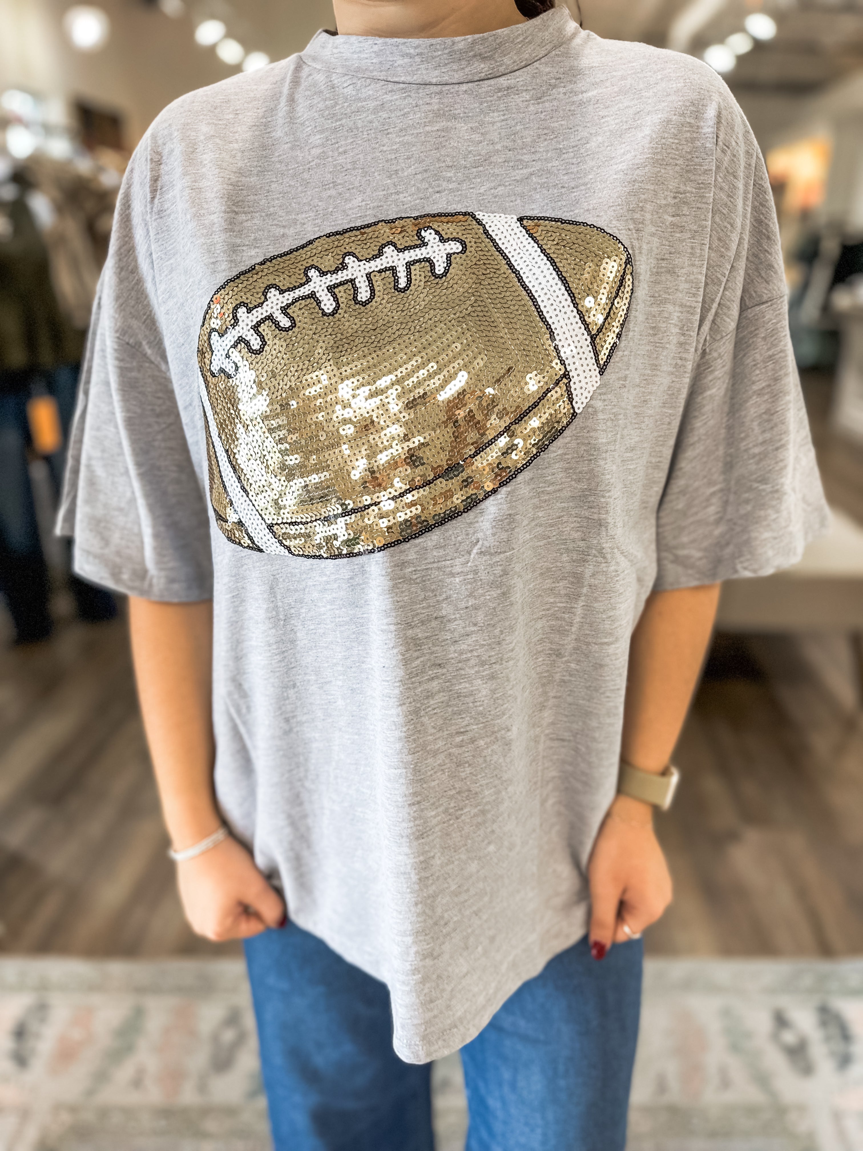 Game day, but make it sparkly! This oversized football tee adds the perfect pop of fun and spirit whether you’re tailgating, in the stands, or cheering from home.
