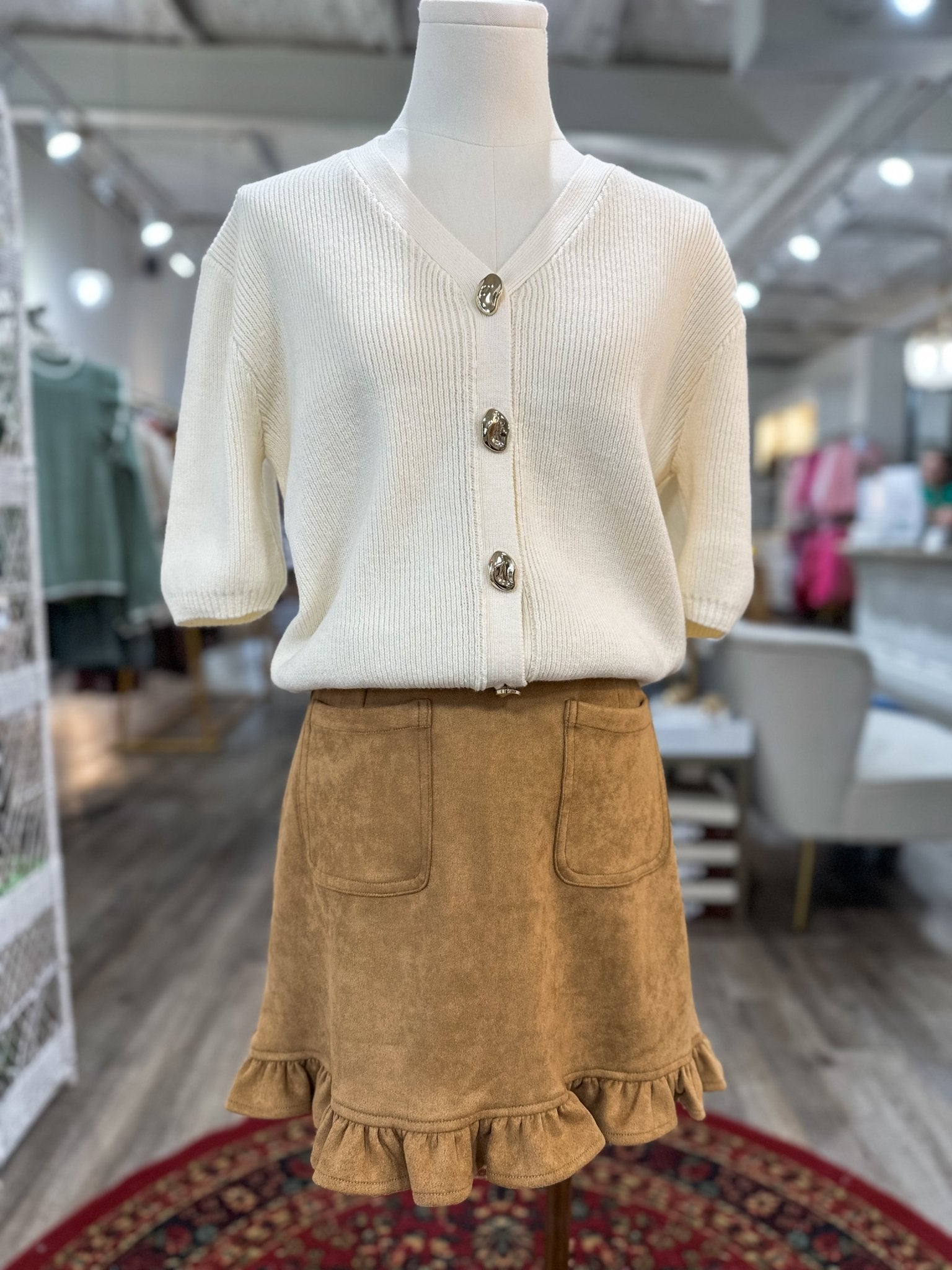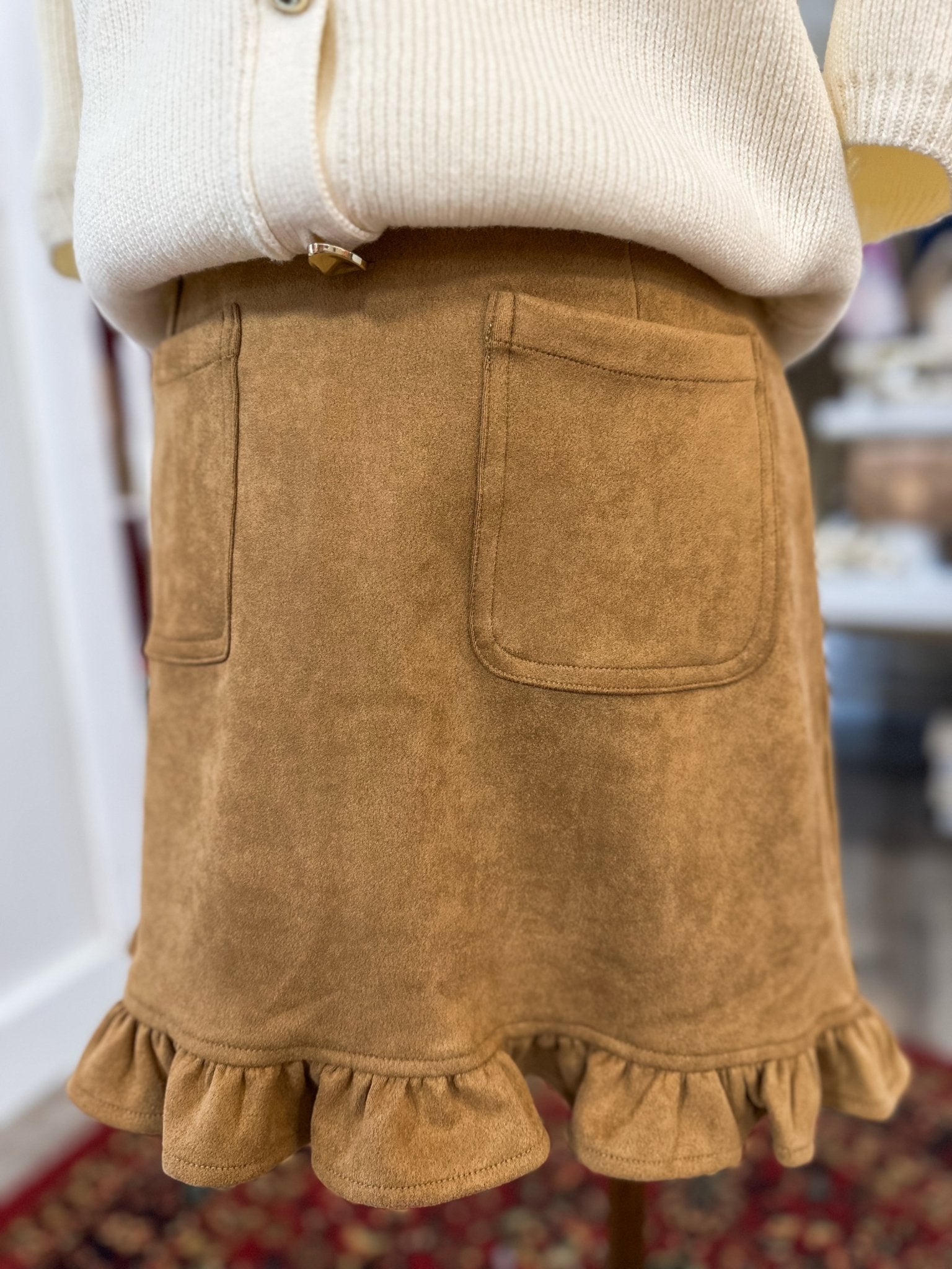 This suede mini skirt is perfect for pairing with sweaters, blouses, or boots for effortless autumn styling!
