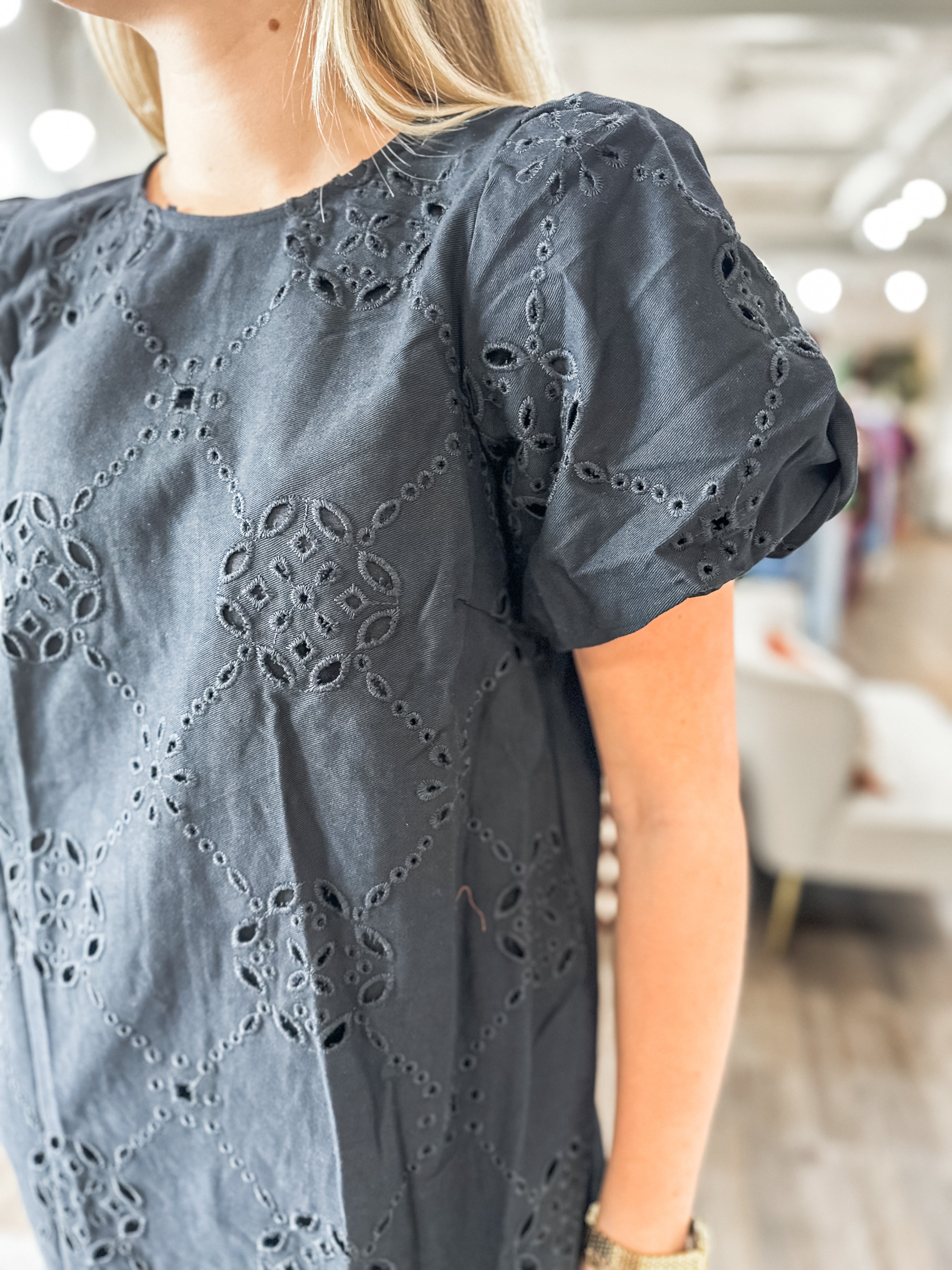 Chic and timeless, this eyelet mini is the perfect blend of feminine detail and everyday wearability. Whether you’re heading to dinner, a shower, or just want to elevate your daily look, this piece delivers.