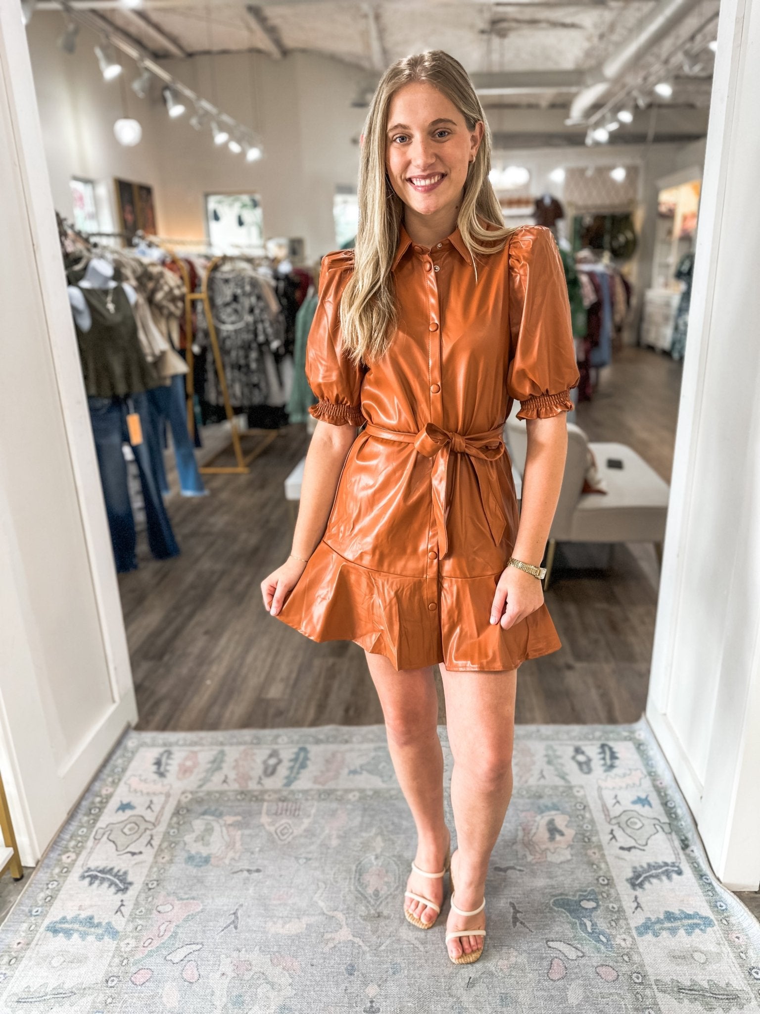 Chic and confident, this camel faux leather mini is made for making an entrance. Whether you’re headed to a dinner, night out, or just want to elevate your everyday look, this piece delivers instant polish.