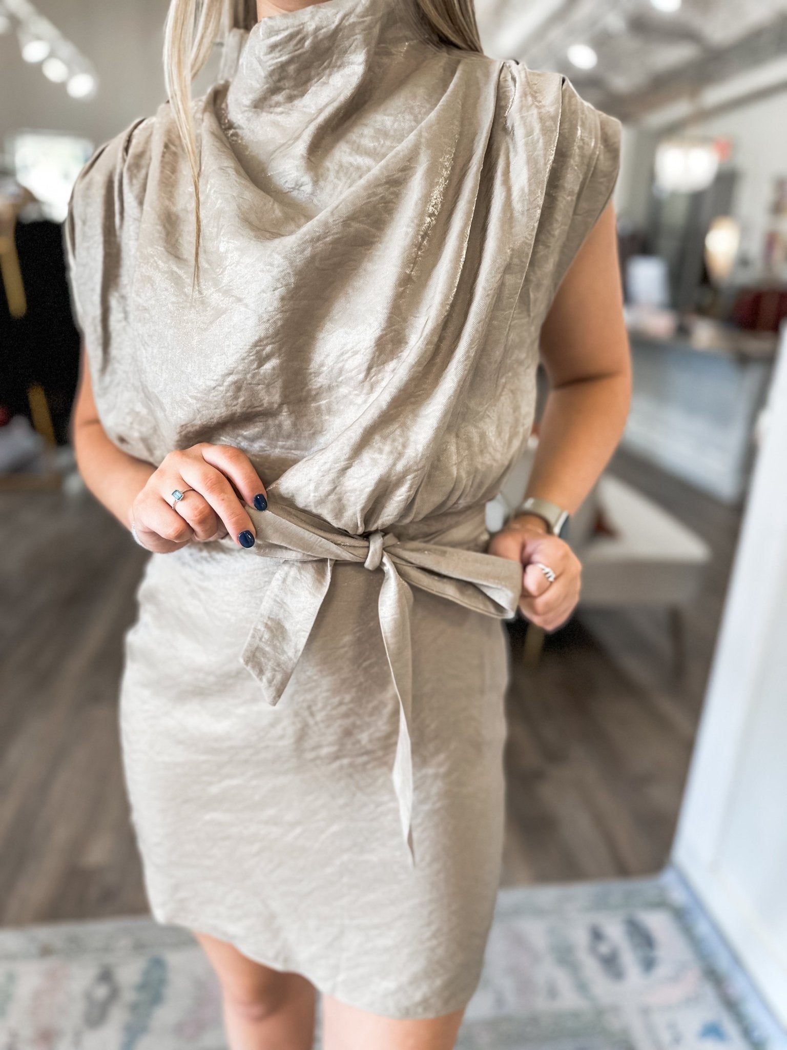 Soft, flirty, and effortlessly chic — this mock neck mini dress is made for the moments you’ll want to twirl through. Its flowy silhouette and warm mocha hue make it perfect for weddings, dinner dates, and all things fall.