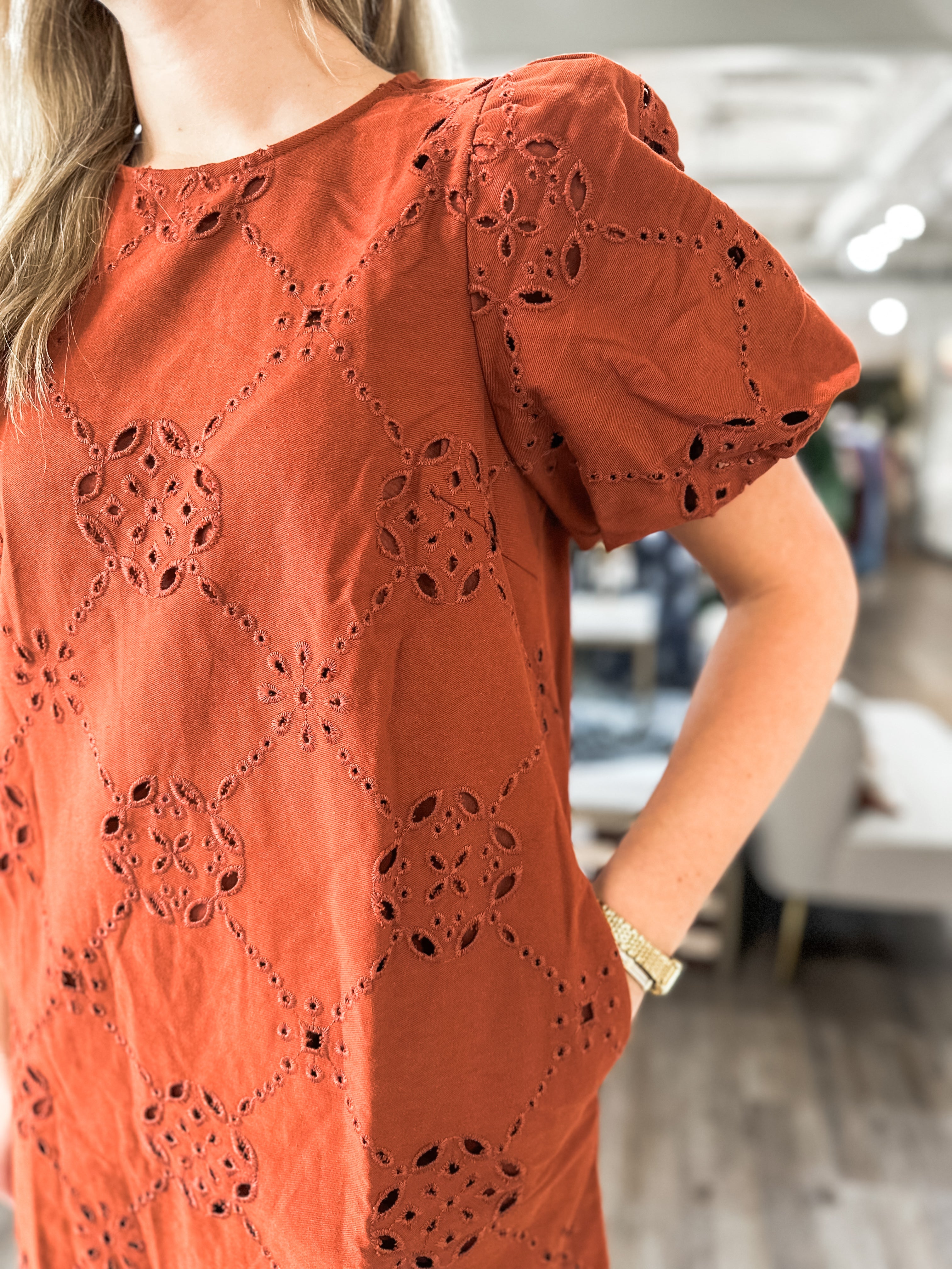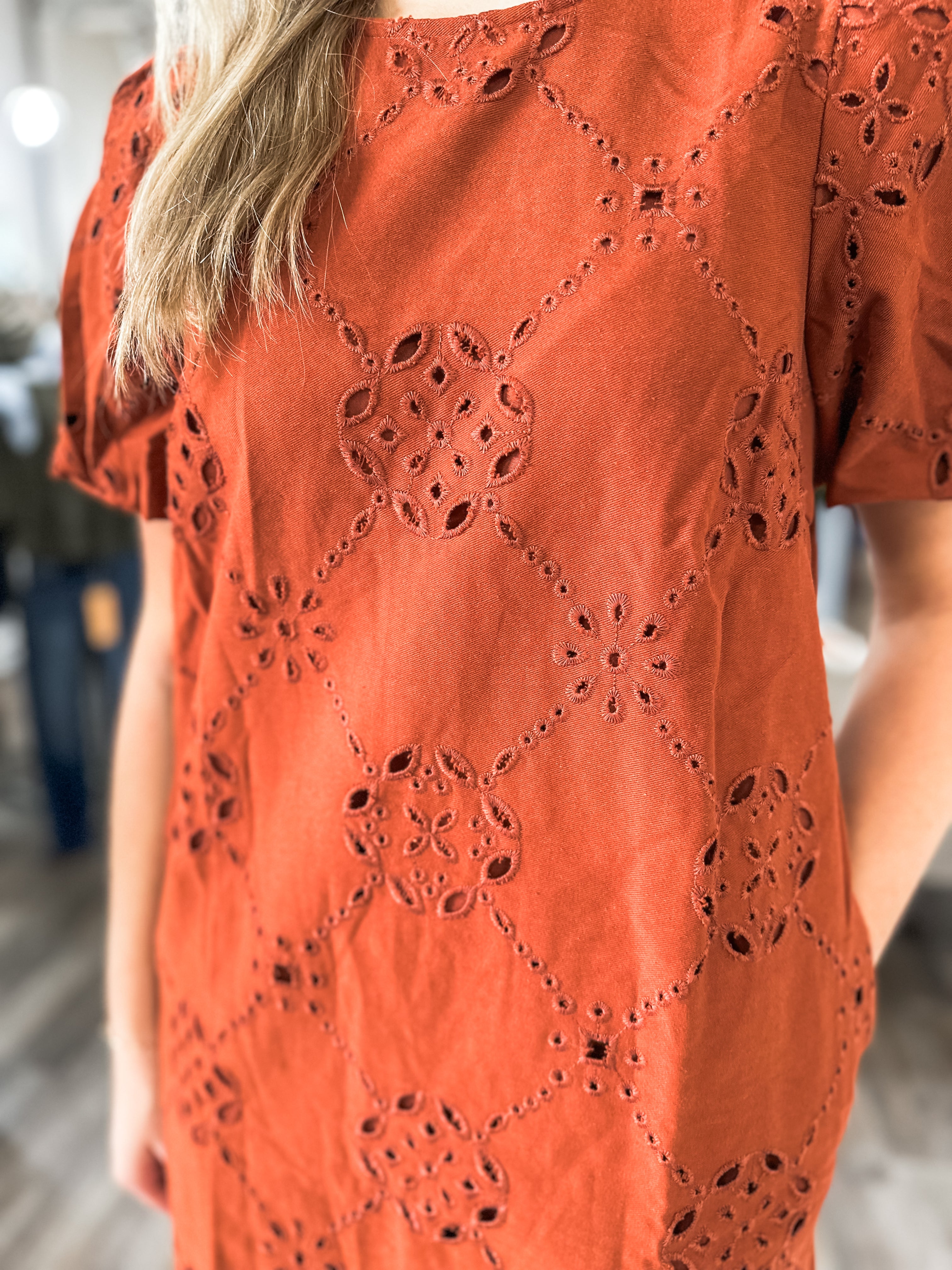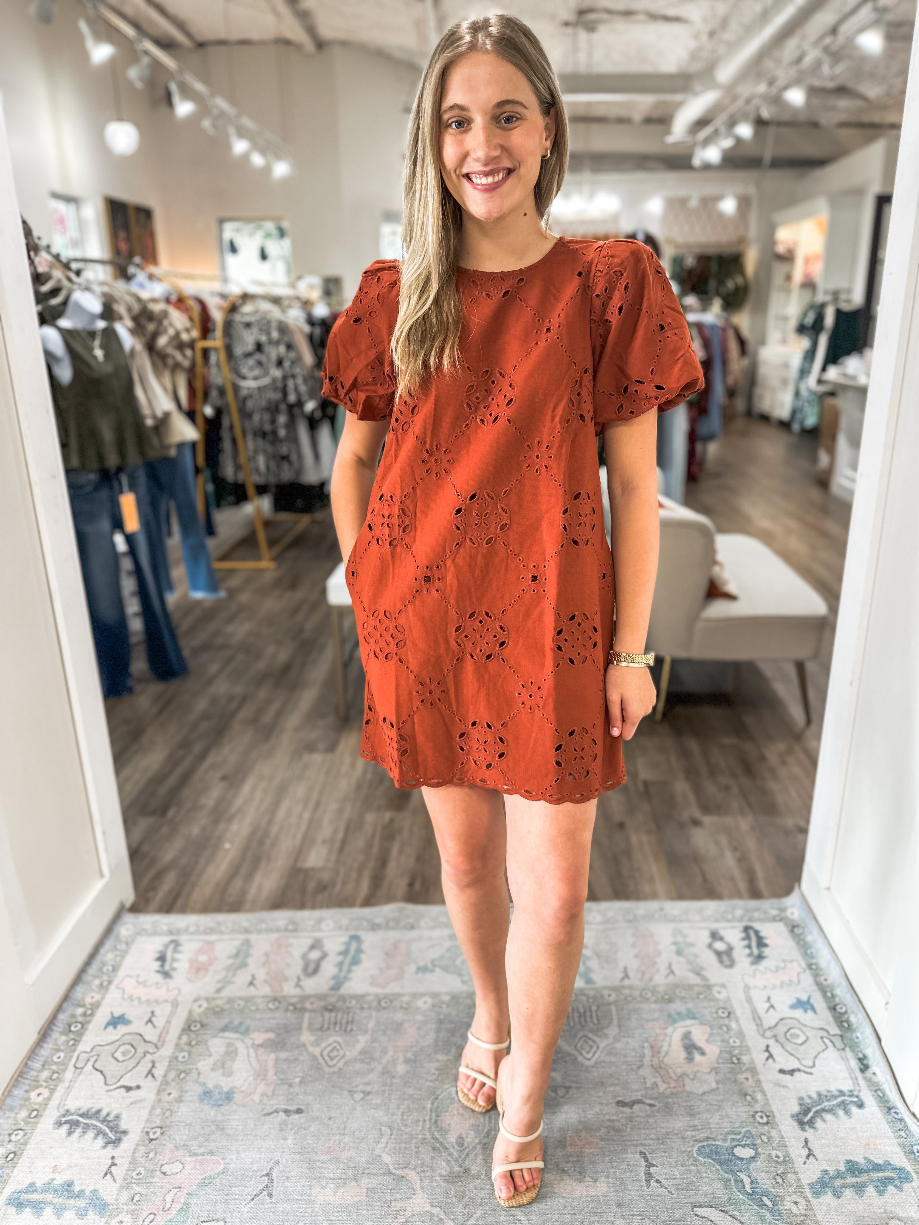 Fall in love with timeless charm in this eyelet mini, perfect for brunch, showers, or seasonal gatherings.