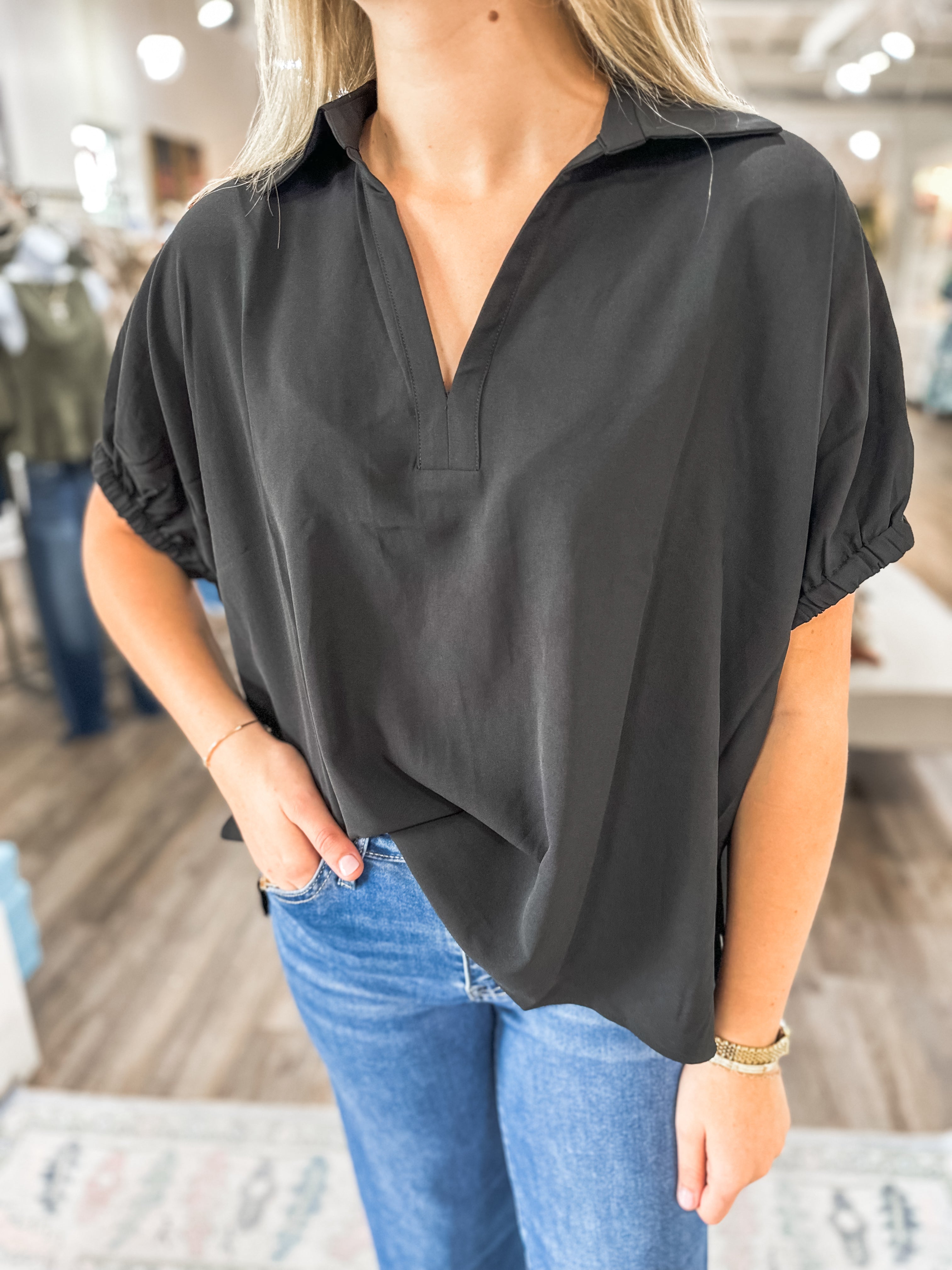 A fresh take on an Everyday Eden favorite — the Black Simplicity Blouse blends classic charm with easy versatility. The soft, flowy fabric drapes beautifully, while the collared V-neckline and gathered short sleeves create a polished yet relaxed look.