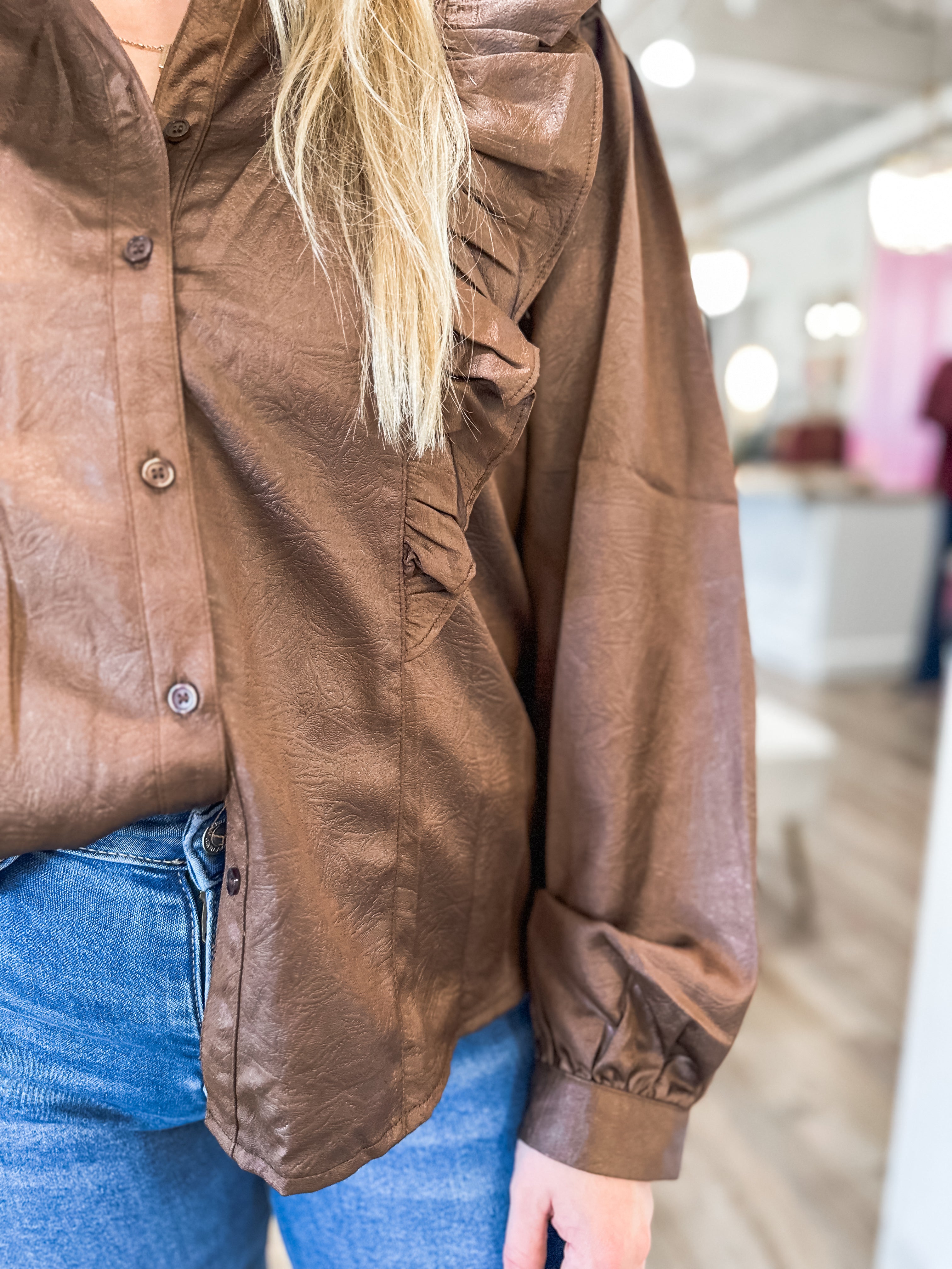 Designed with a subtle sheen, this brown blouse features delicate textured fabric, ruffled shoulder detailing, and a classic button-front with a mandarin collar for a timeless, sophisticated touch. Long sleeves make it a versatile option that transitions beautifully from season to season.