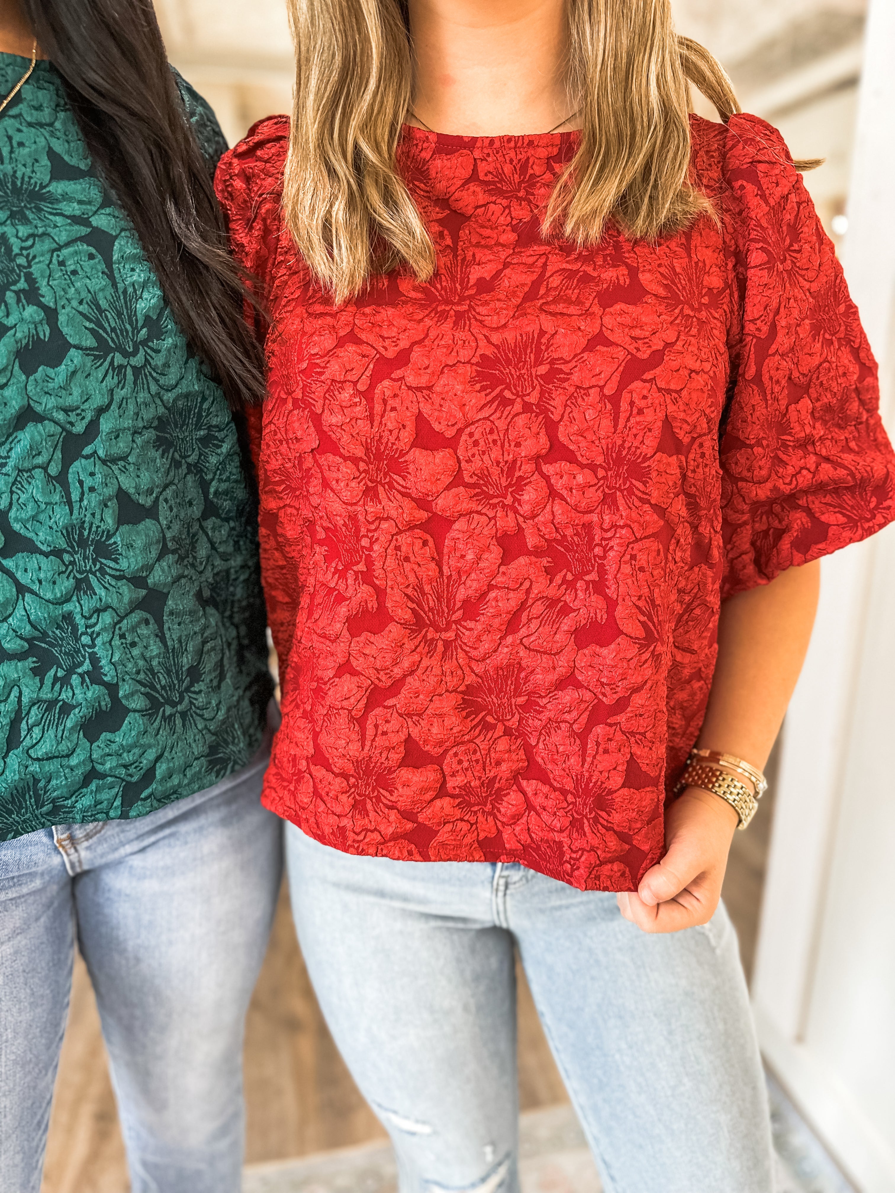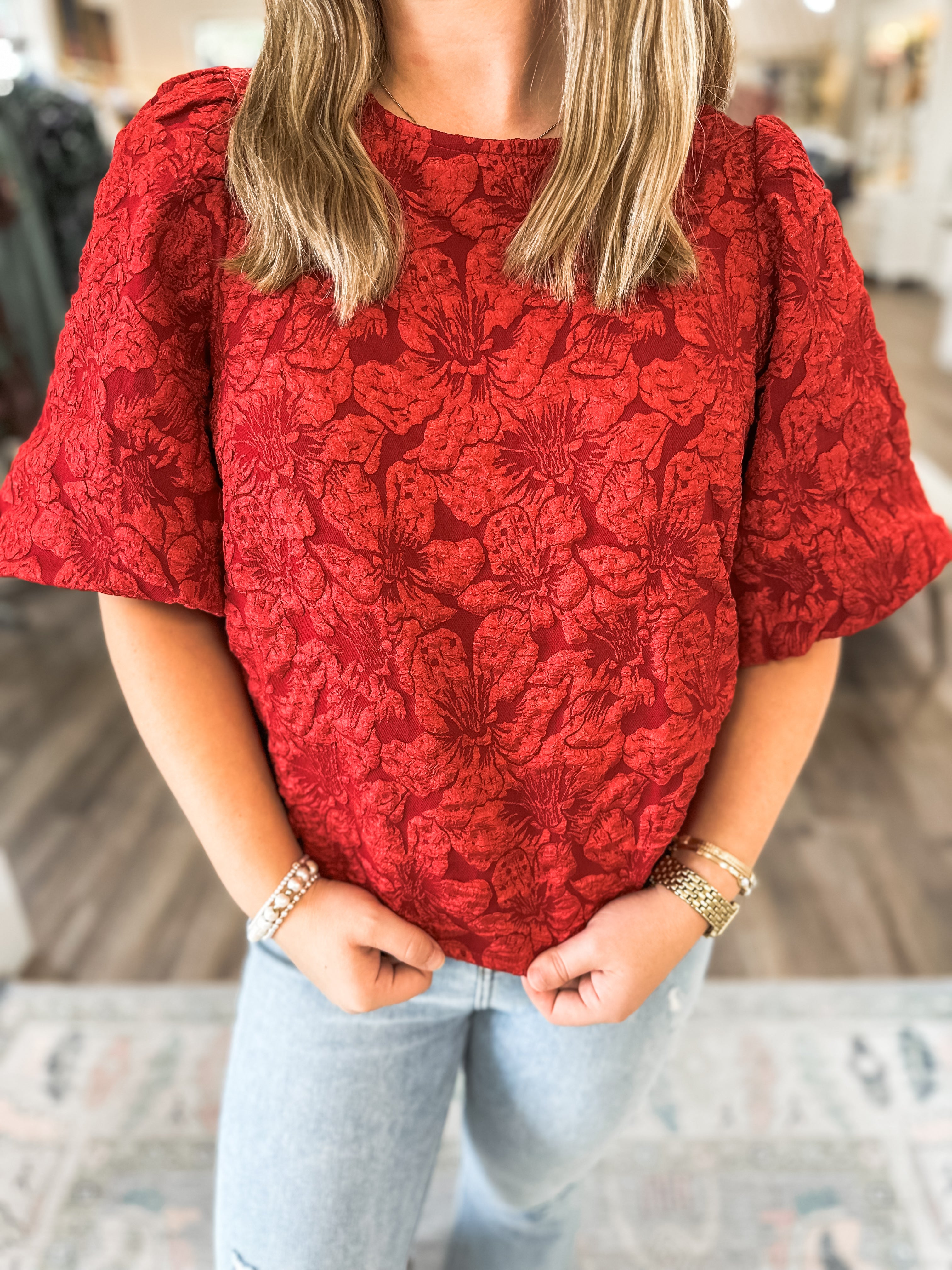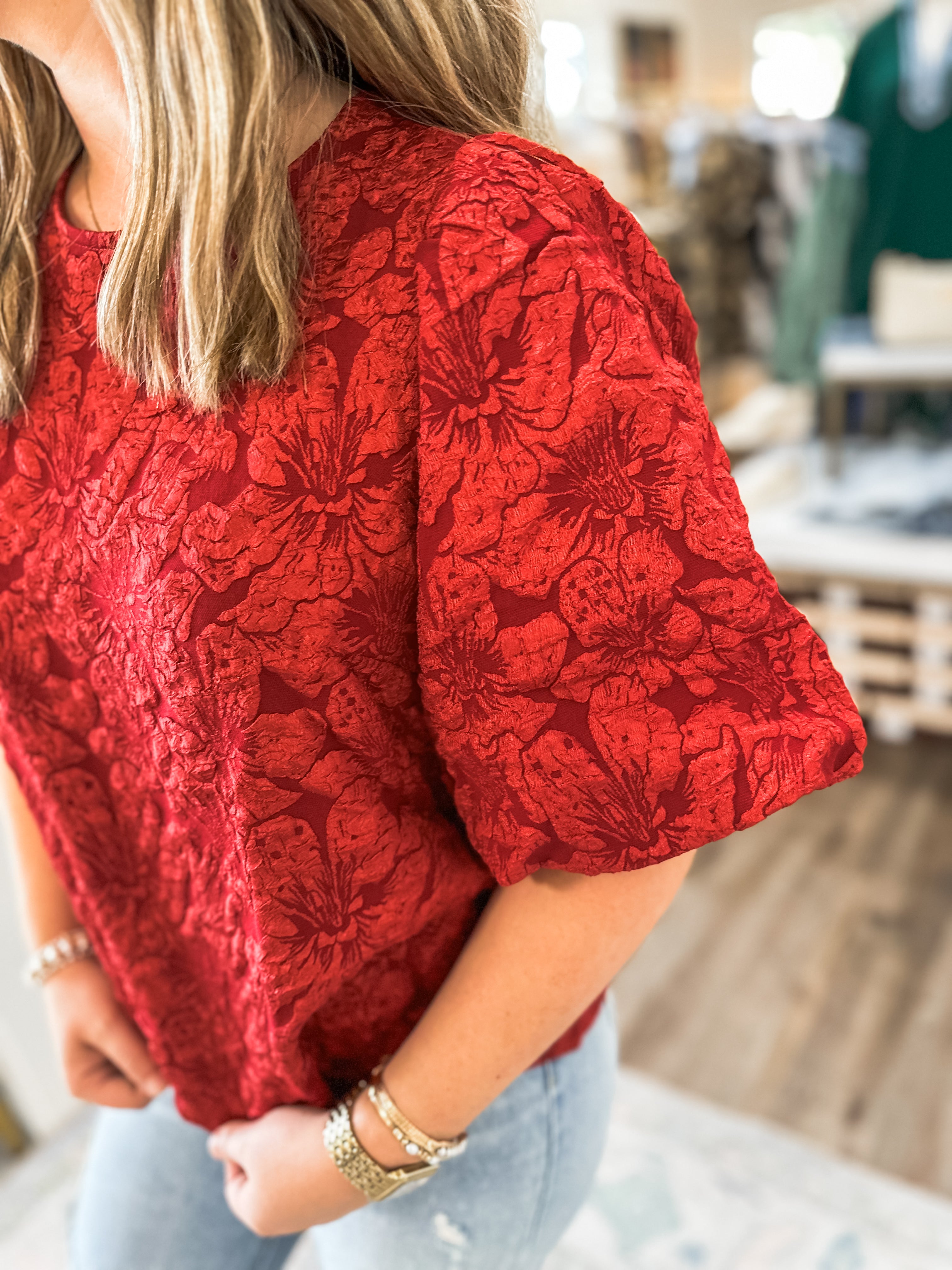 Make an entrance in this stunning textured jacquard blouse, where rich red roses meet chic, modern design. The puff sleeves and statement open-back tie detail bring just the right amount of drama—perfect for nights out, holiday parties, or whenever you want all eyes on you.