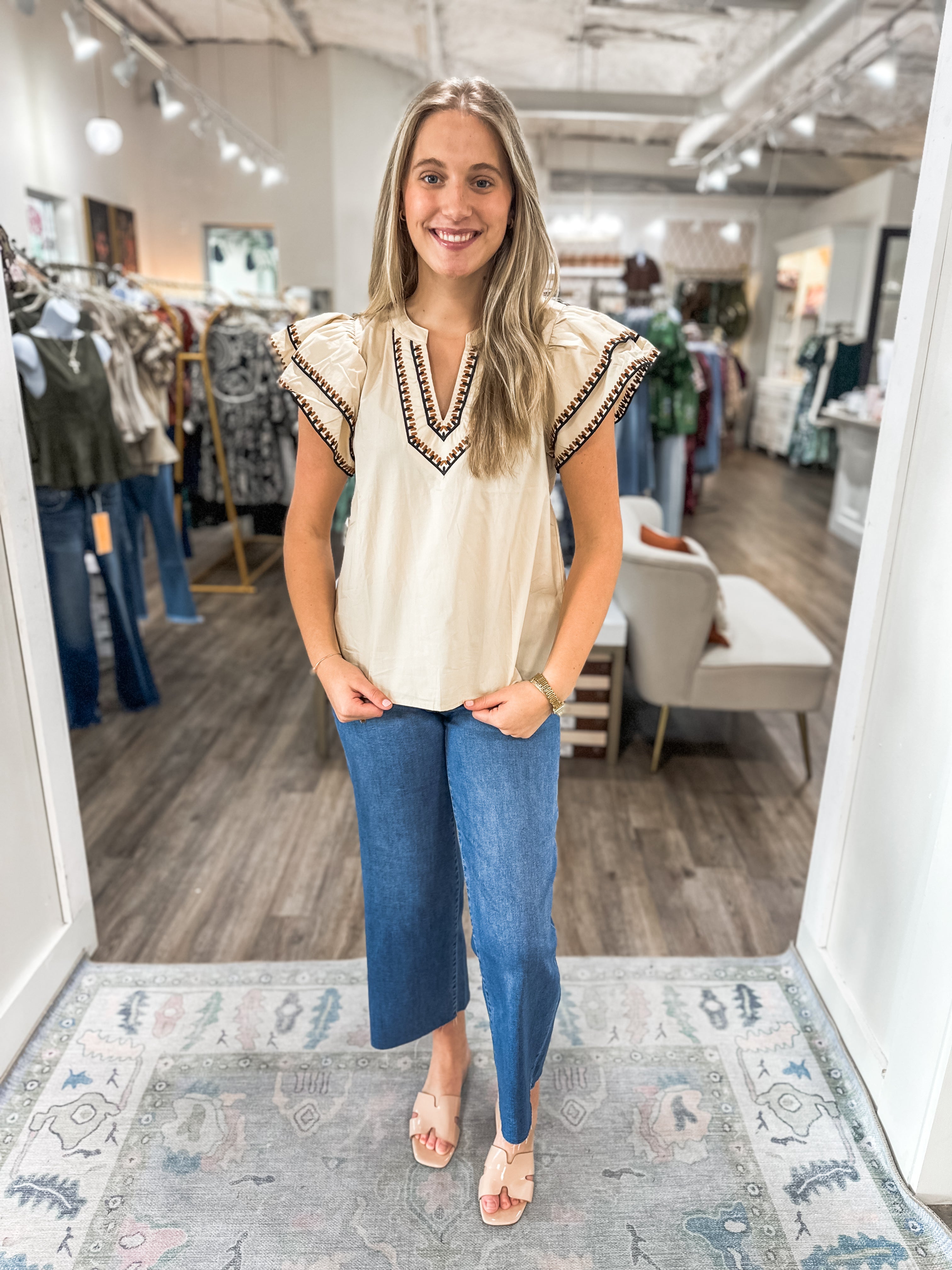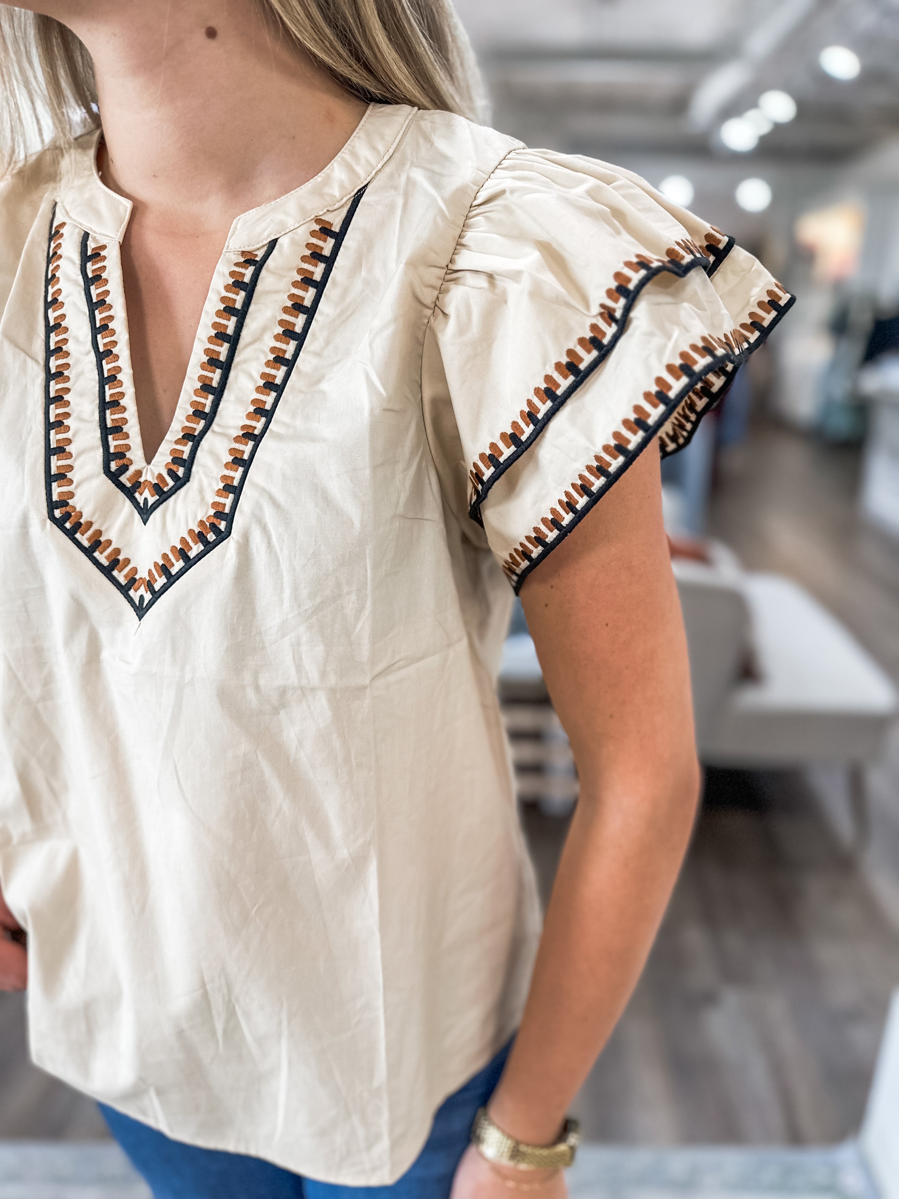 Features you’ll love: embroidered details, flutter sleeves, versatile styling