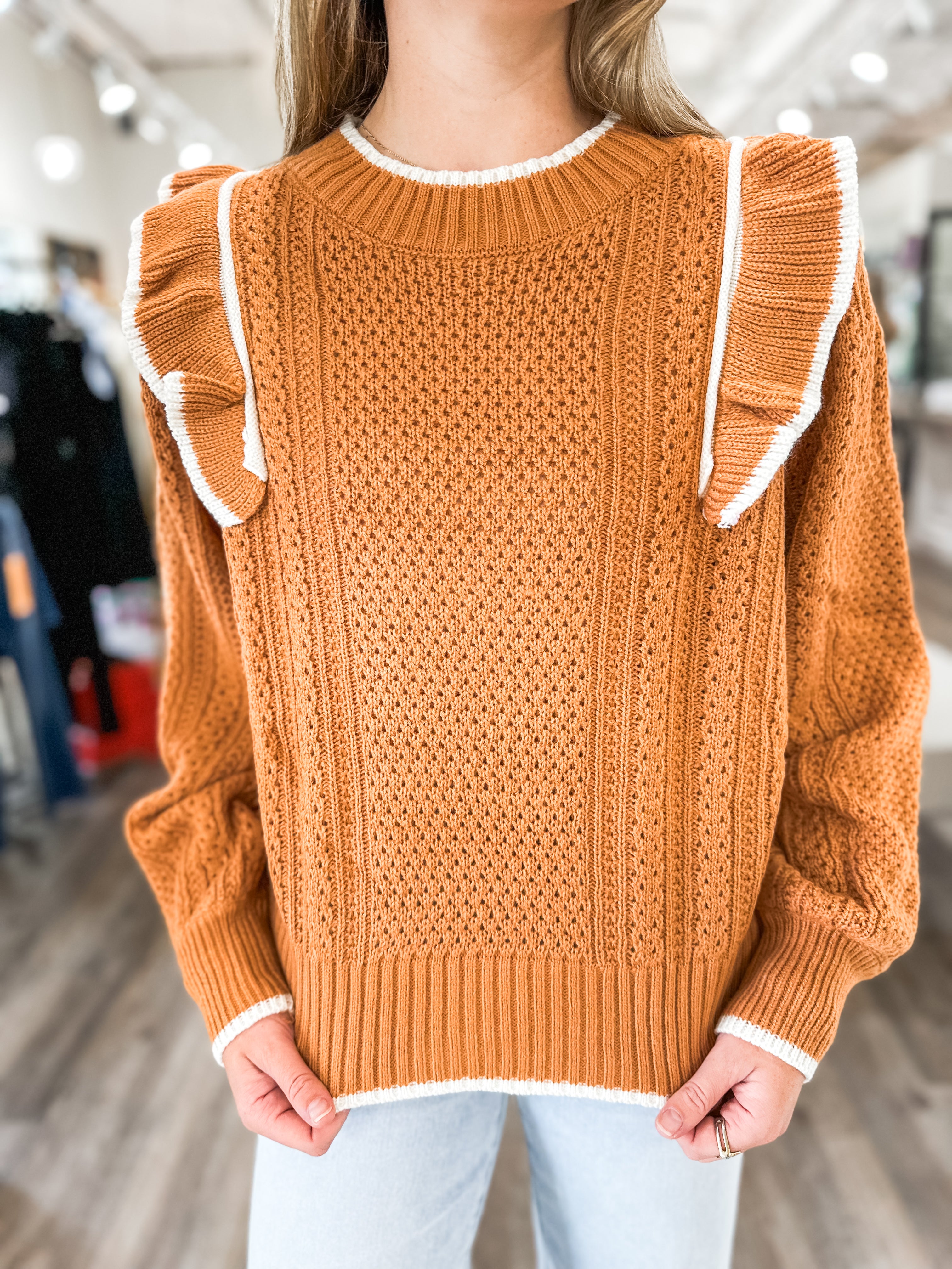 Chelsea's Rust/Ivory Ruffle Shoulder Detail Long Sleeve Sweater Top