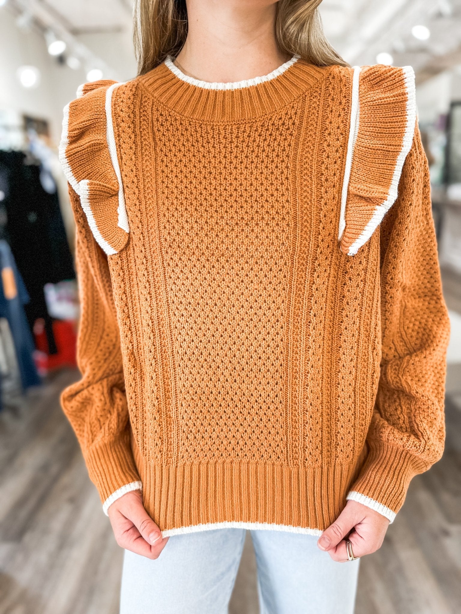 The perfect pick for fall festivals, pumpkin patch days, or casual Fridays that still call for a little flair. This cozy knit sweater comes in a rich rust hue with intricate pointelle stitching throughout for a classic, textured look. The statement ruffle sleeves steal the show—trimmed in crisp white with a preppy edge that adds just the right amount of drama. Finished with contrast piping at the neck and cuffs for a polished, boutique-worthy touch.