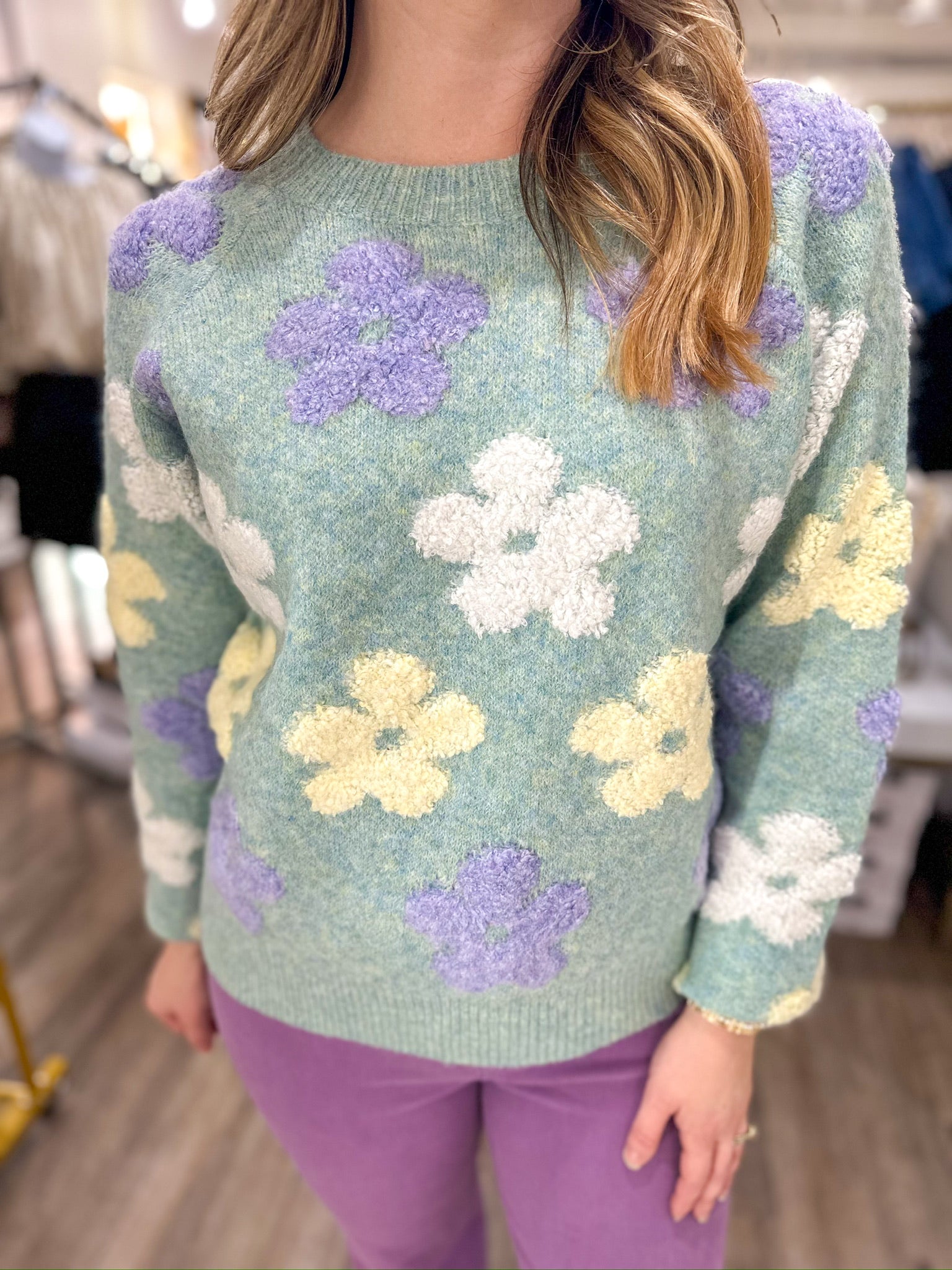 Bring a little sunshine into cooler days with this dreamy pastel floral sweater. Soft, playful, and effortlessly cozy, it’s perfect for errands, casual outings, school drop-off, or any day you want to feel cute and comfy.