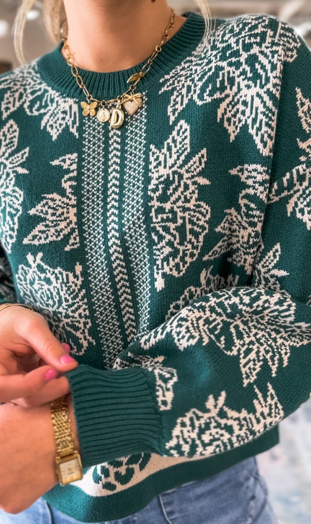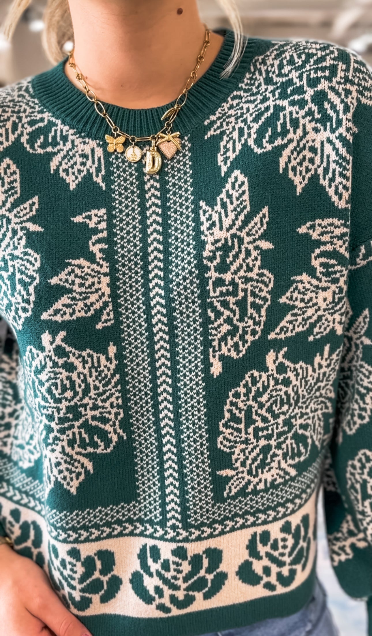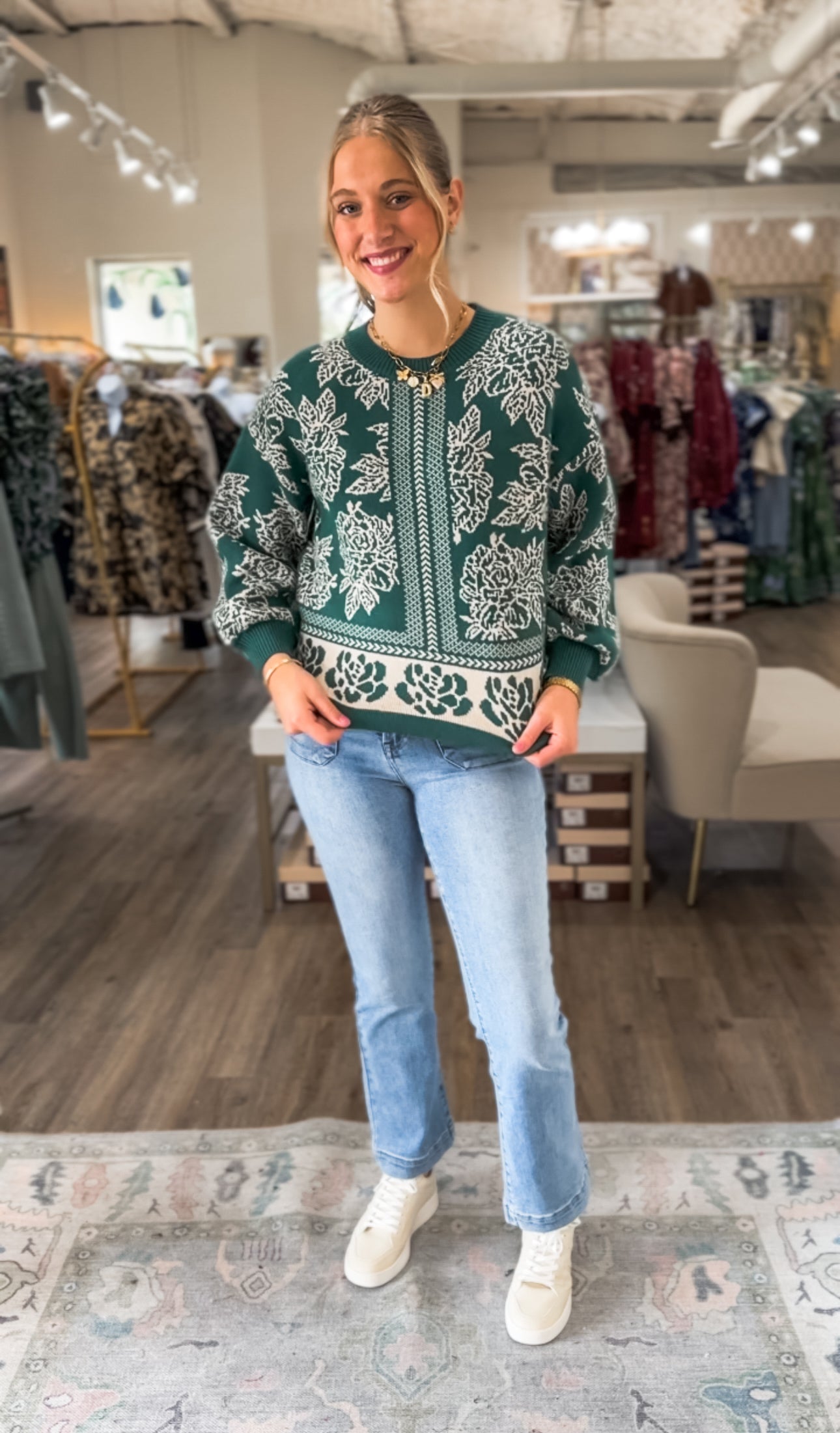 Romantic and timeless, the Pine Vintage Garden Sweater features a gorgeous cream floral knit pattern set against a rich green backdrop. The classic crew neckline and slightly relaxed fit make it a cozy yet elevated choice for cool days. Perfect with denim for casual charm or paired with a skirt for a more polished look.