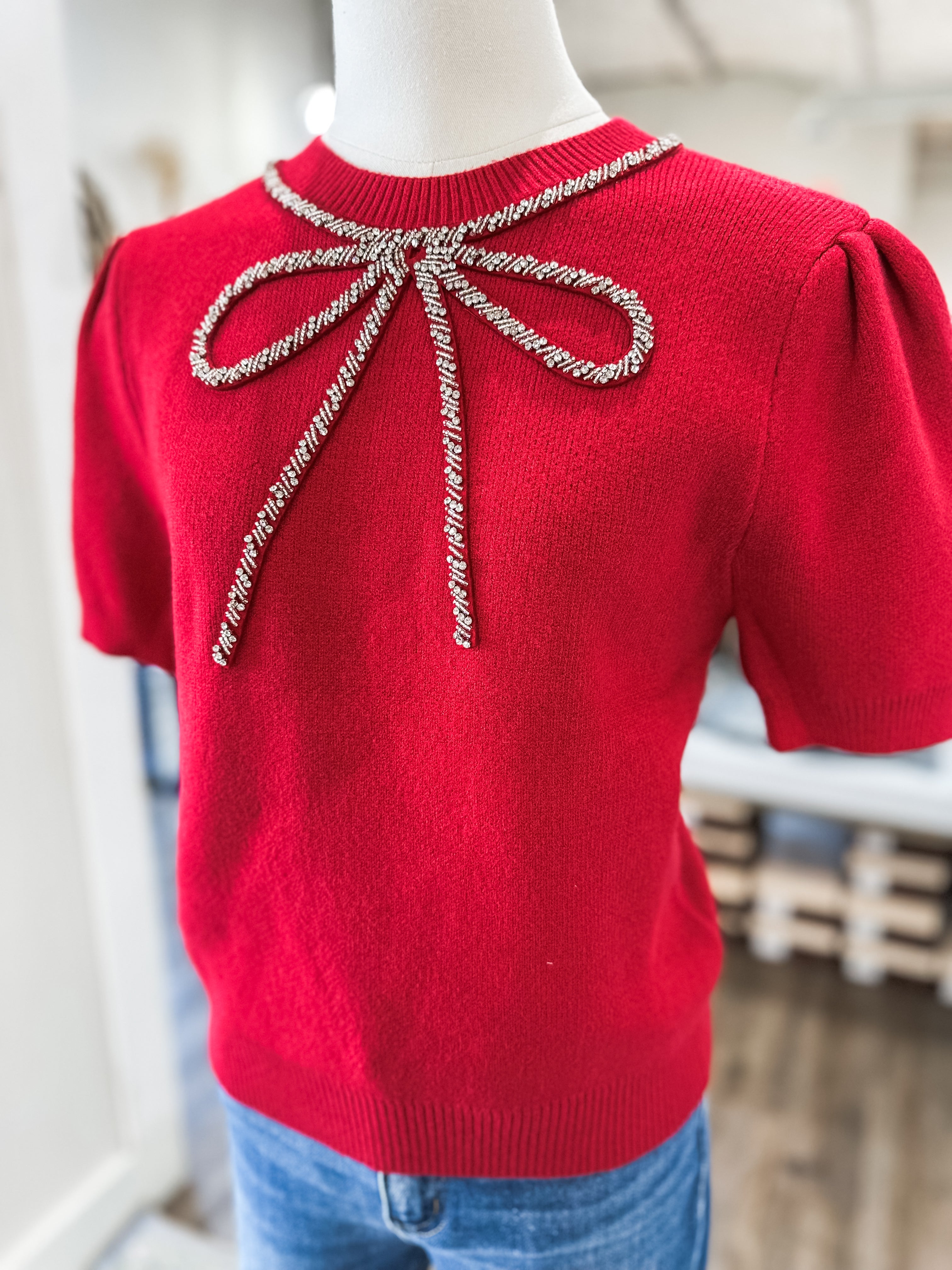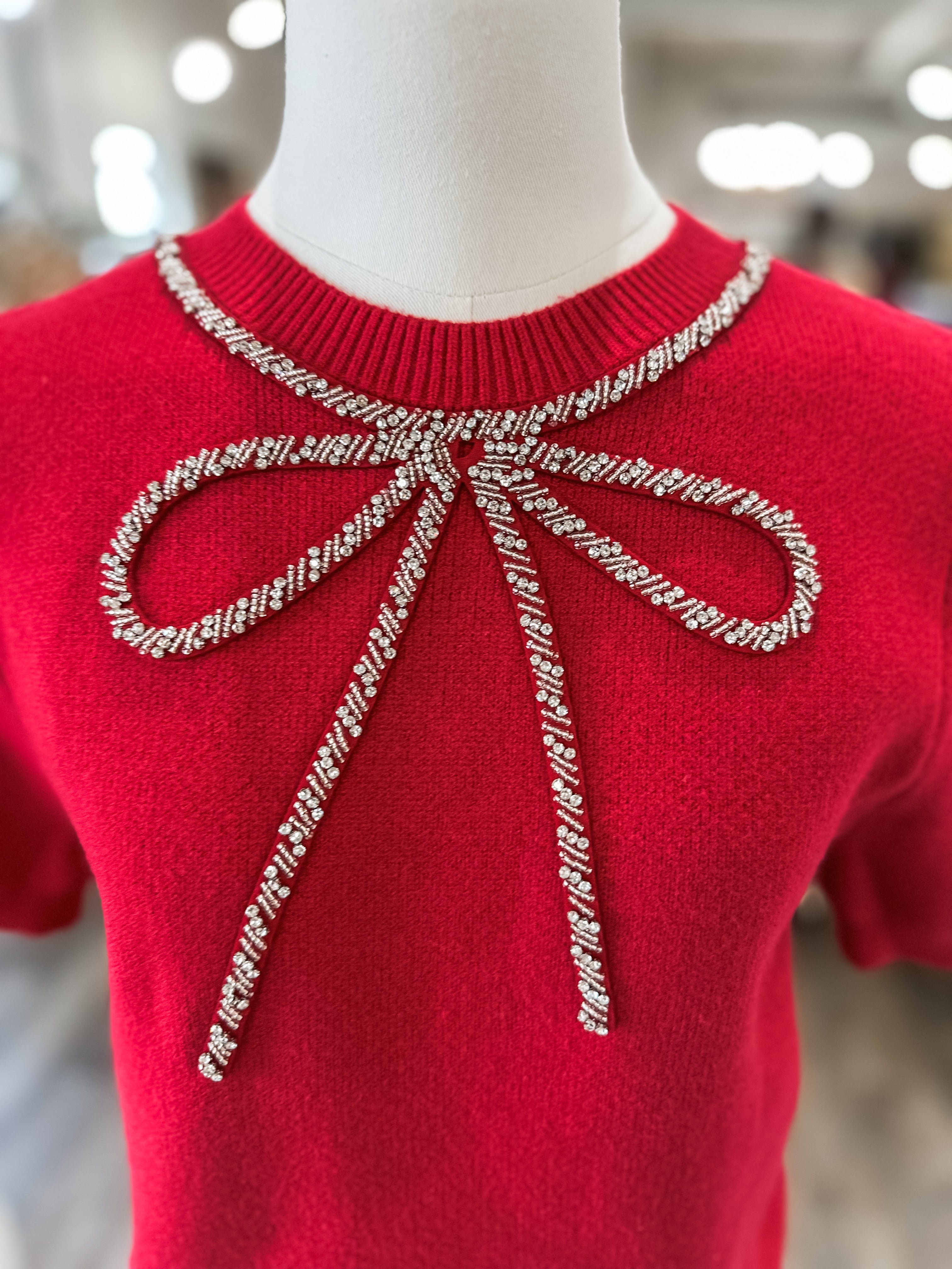Red Glitz & Grace Beaded Crystal Bow Sweater