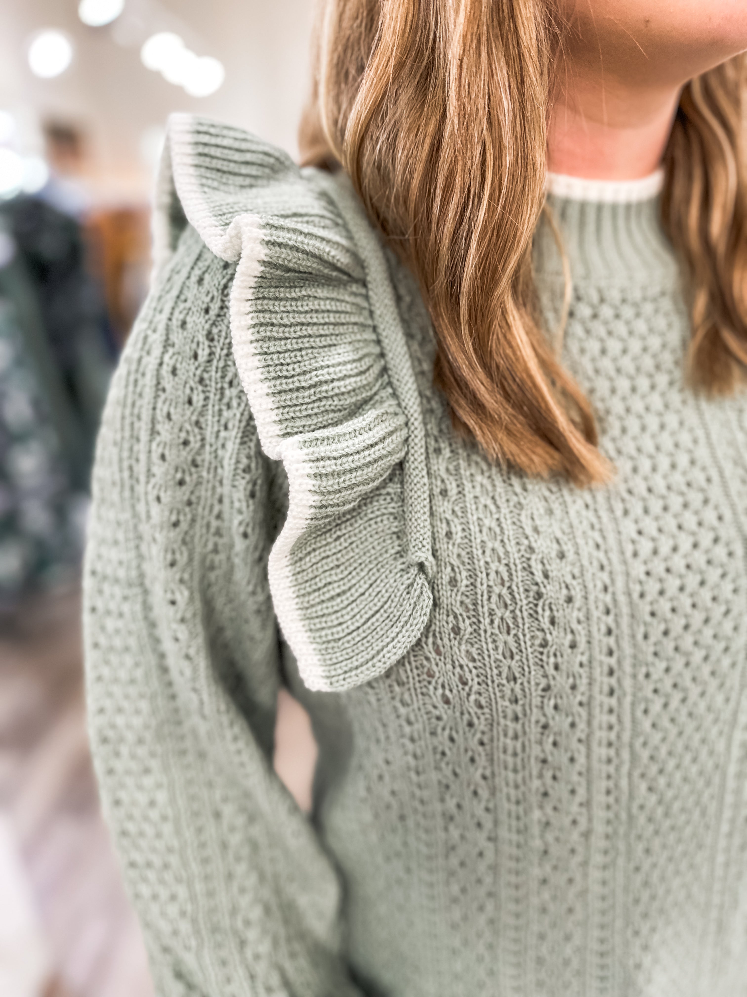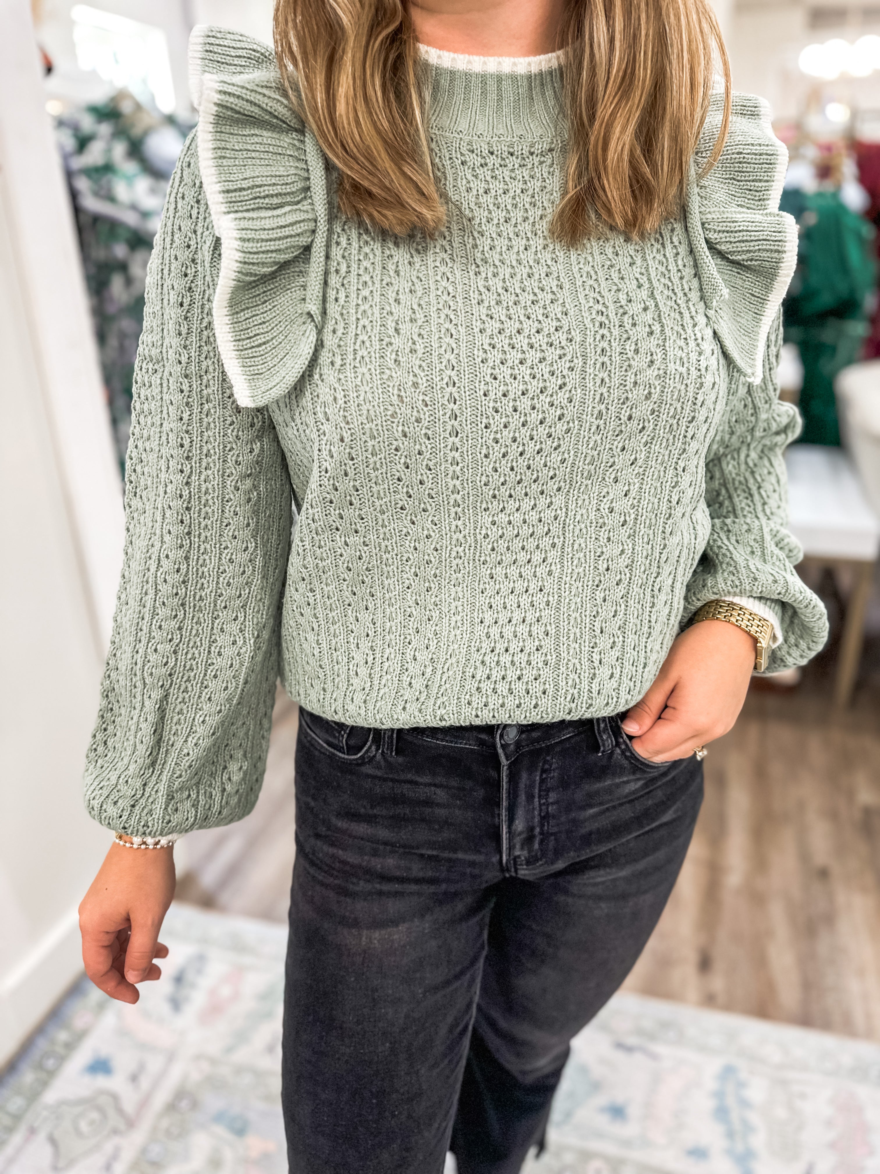 This soft sage knit features bold ruffle shoulders with white trim, a crew neckline, and a classic fit that pairs beautifully with denim or skirts. It’s a statement sweater that works for coffee dates, the office, or weekend get-togethers.