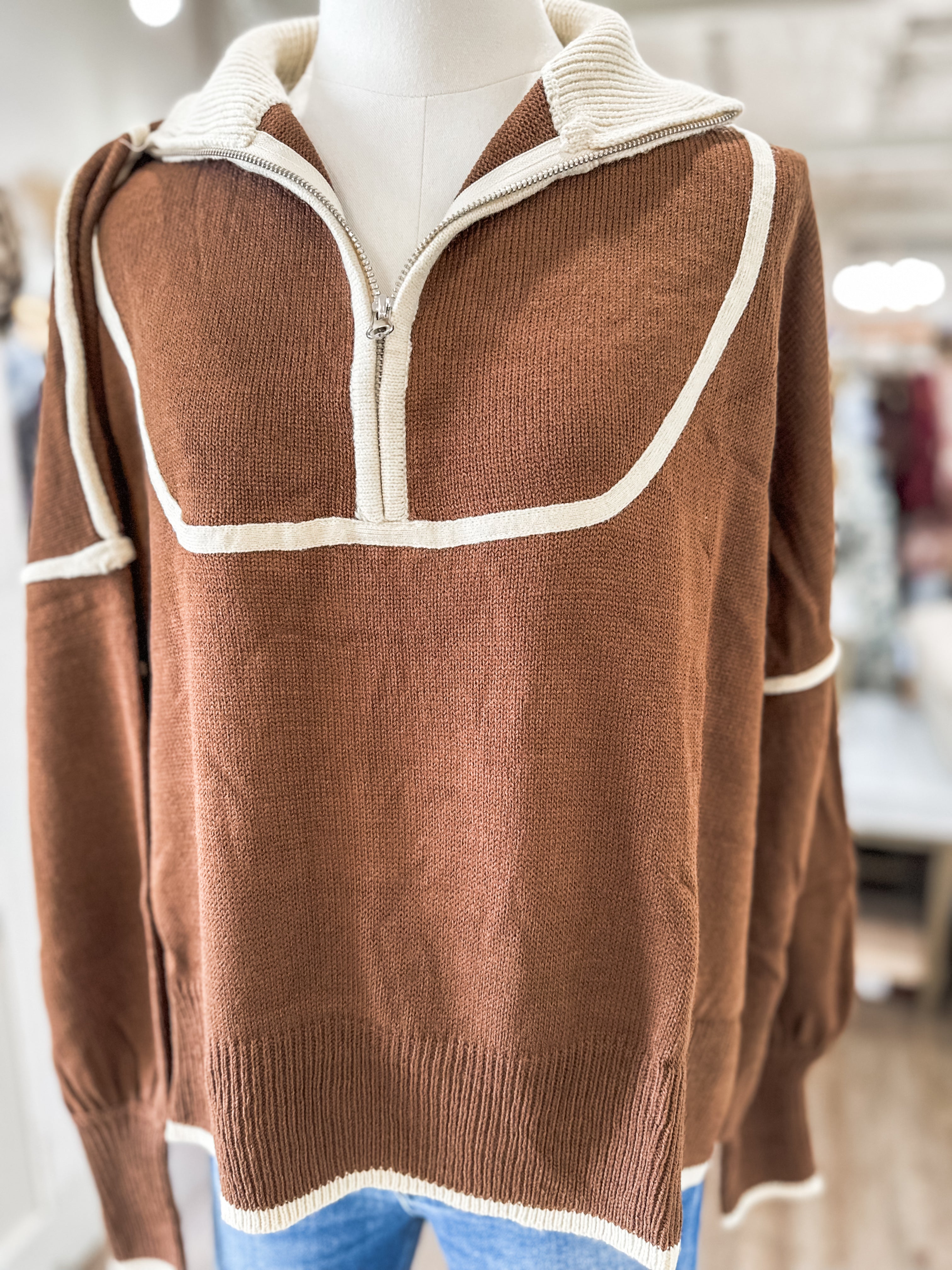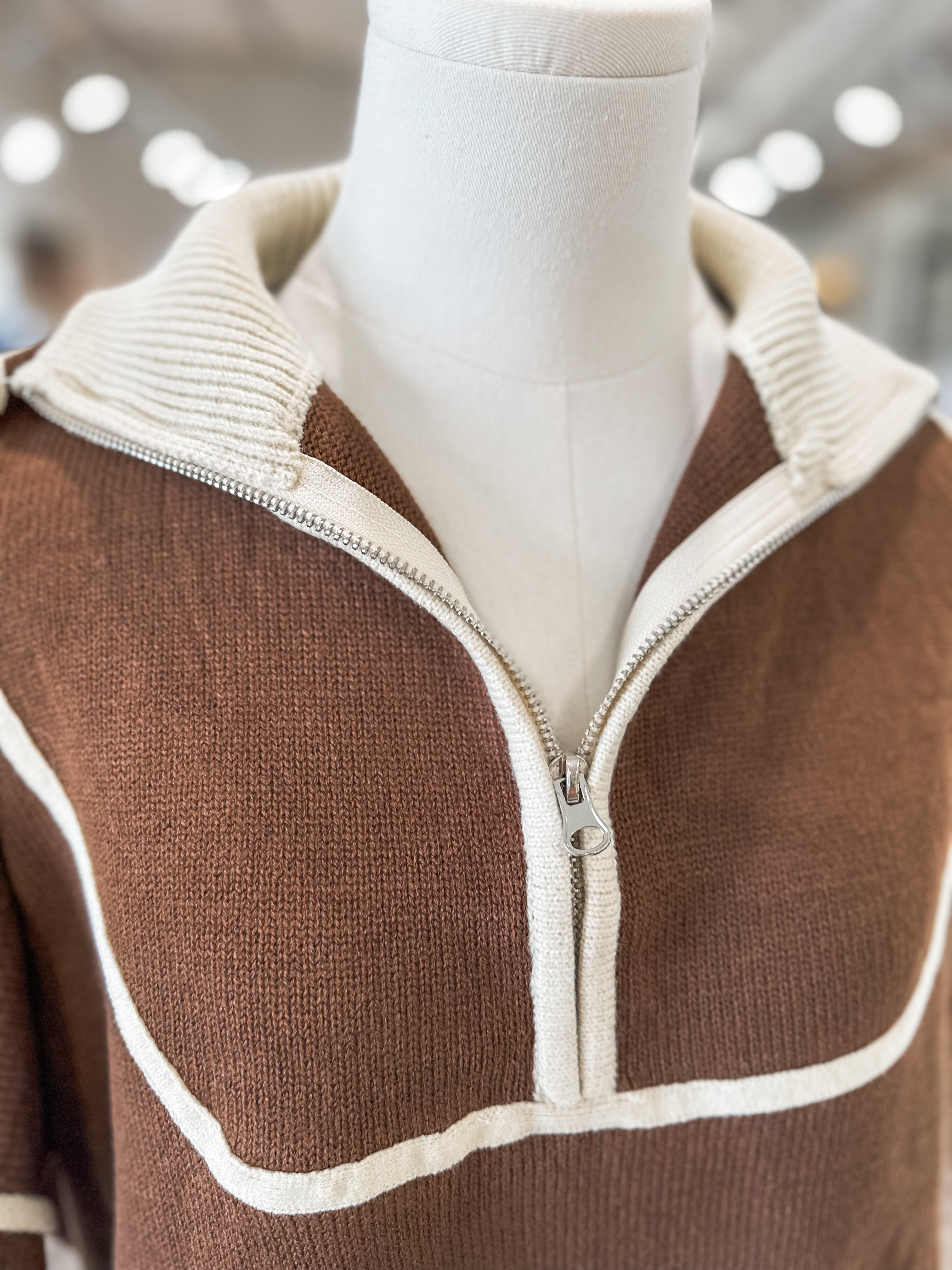 Cozy up in effortless style with this mocha and cream half-zip sweater — the perfect blend of casual comfort and chic detail. Ideal for coffee runs, lounging, or layering on cool fall and winter days.