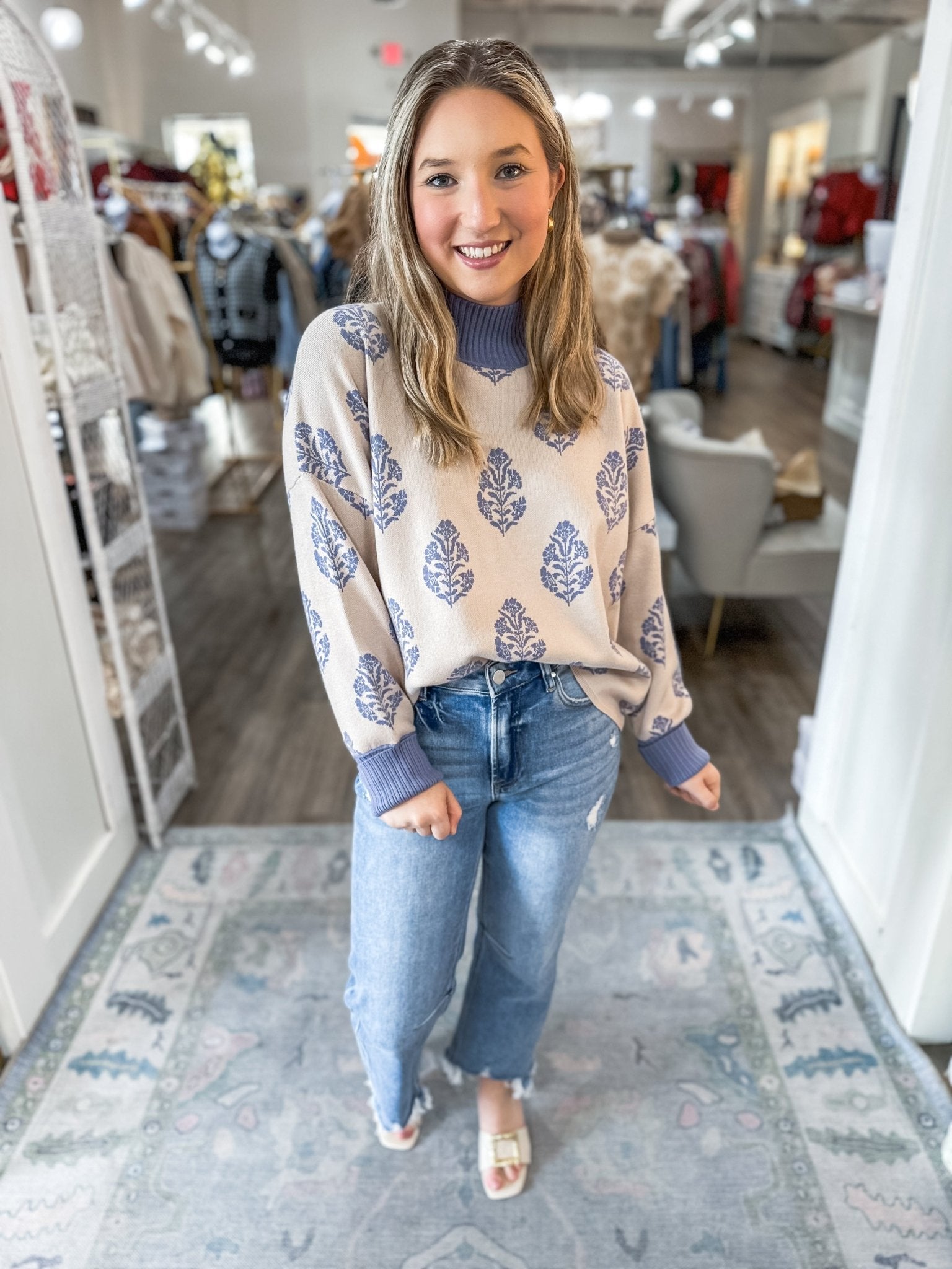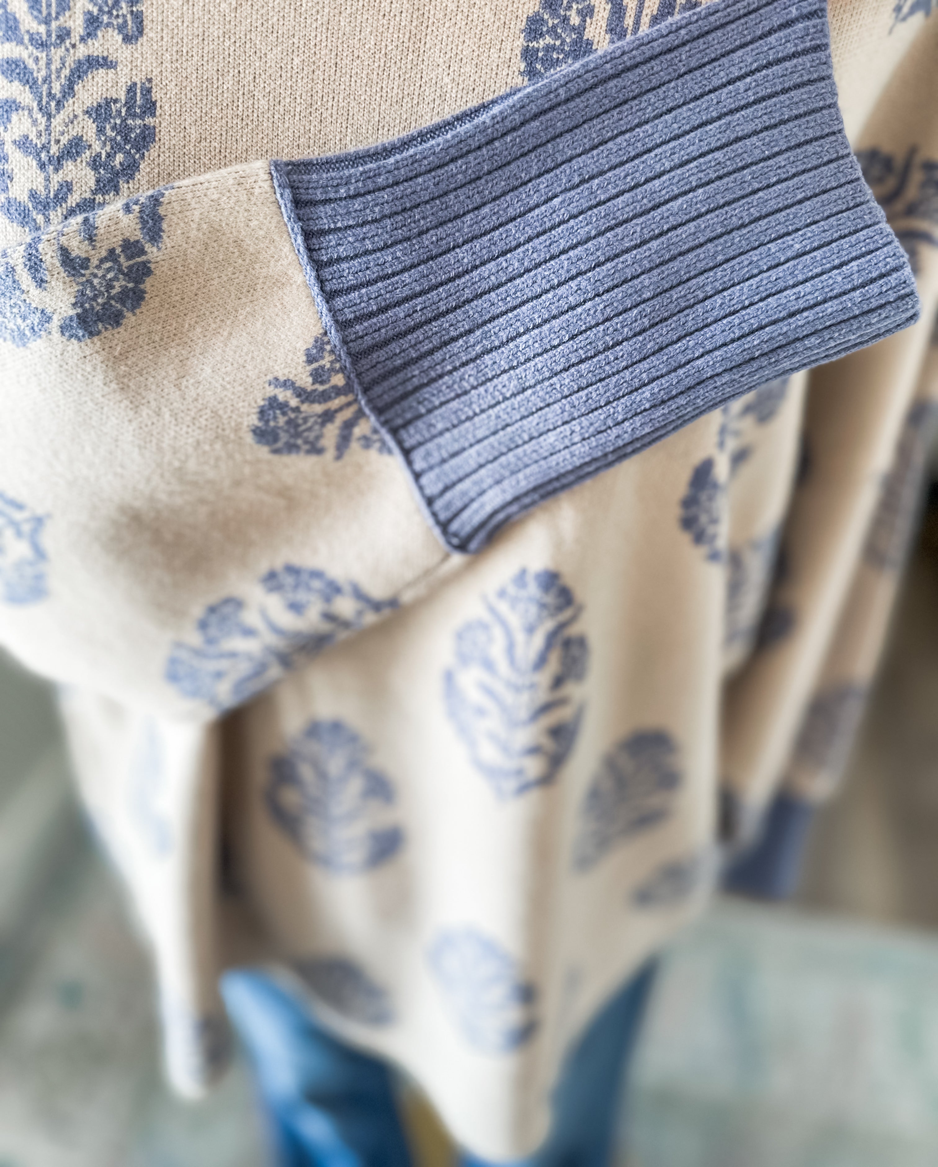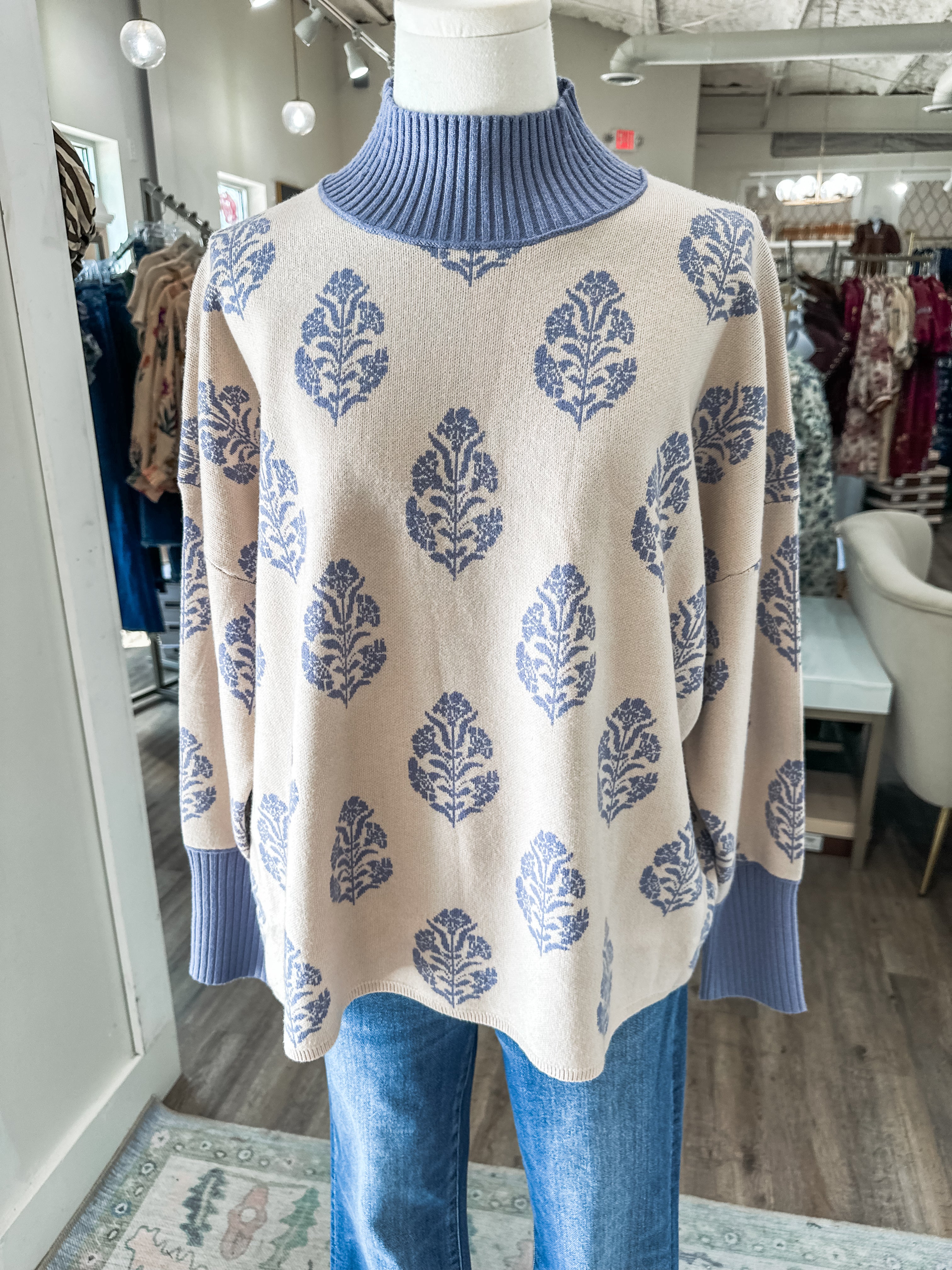 The perfect sweater to carry you from chilly mornings to cozy evenings. This ecru knit features a timeless blue damask-inspired pattern and a ribbed mock neckline for a touch of classic charm.