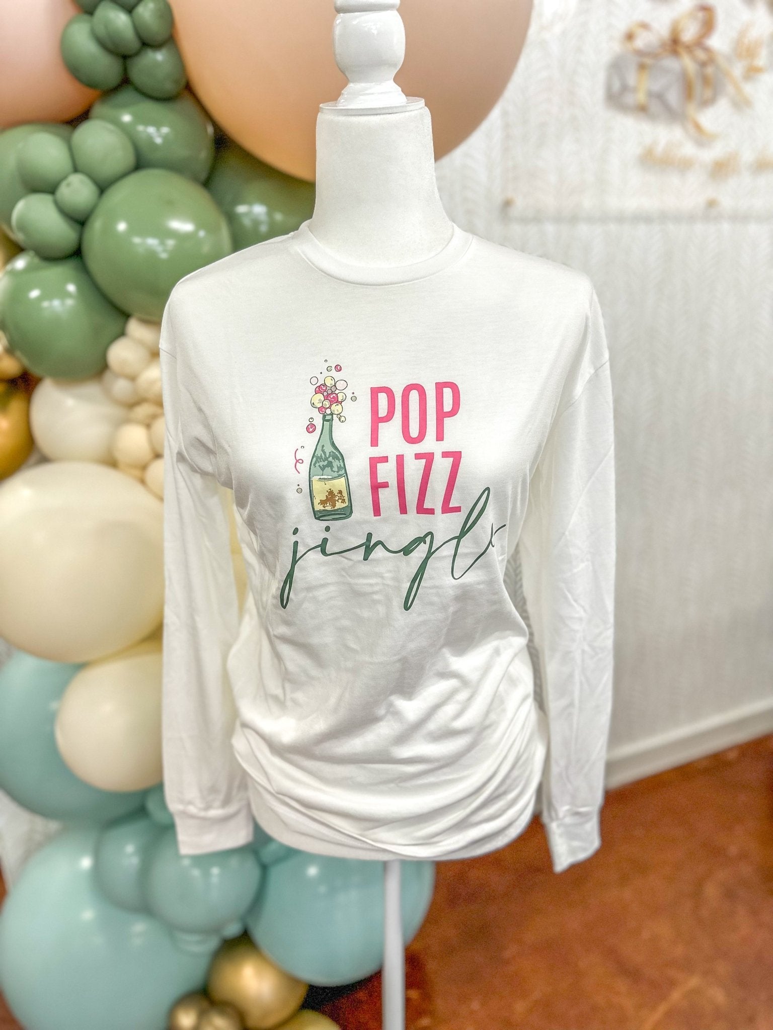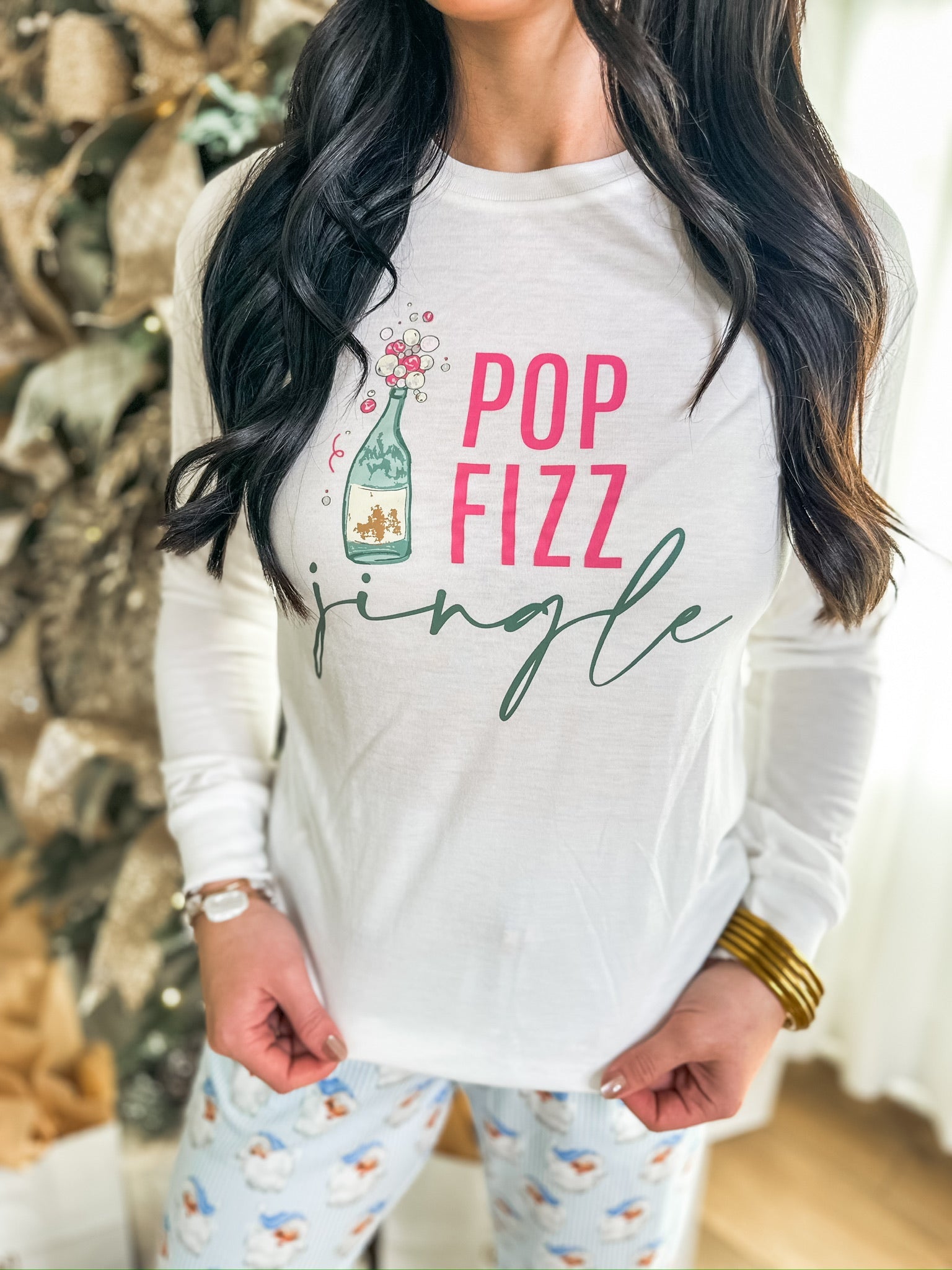 Cheers to the holidays in the cutest way possible! This festive long sleeve tee features a bubbly champagne bottle graphic with the words “Pop Fizz Jingle” — perfect for parties, girls’ nights, or cozy celebrations at home.