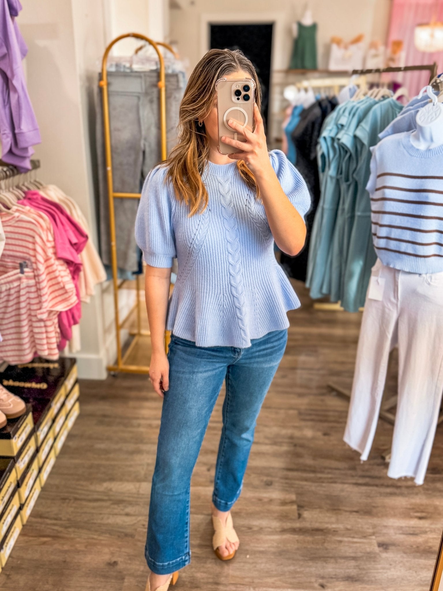 Bright, cheerful, and effortlessly feminine — this baby blue knit top is the perfect way to add a little sunshine to your wardrobe. With its flared hem and soft puff sleeves, it gives you that polished-but-playful look you can dress up or keep casual.