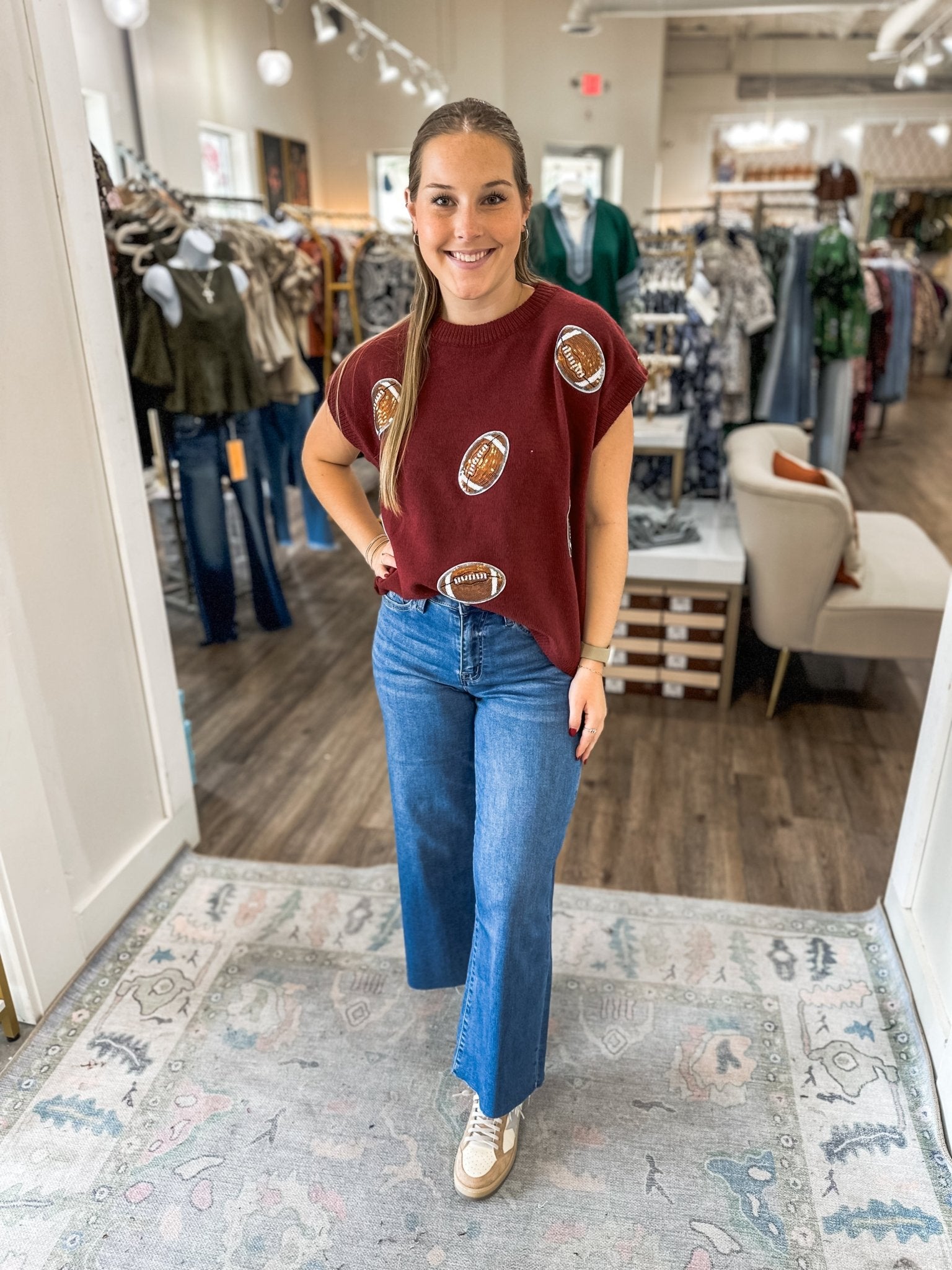 Game day just got cozier! This burgundy sweater top is the perfect mix of spirited and stylish — with playful football patches that show your team pride while keeping you comfortable all day long.