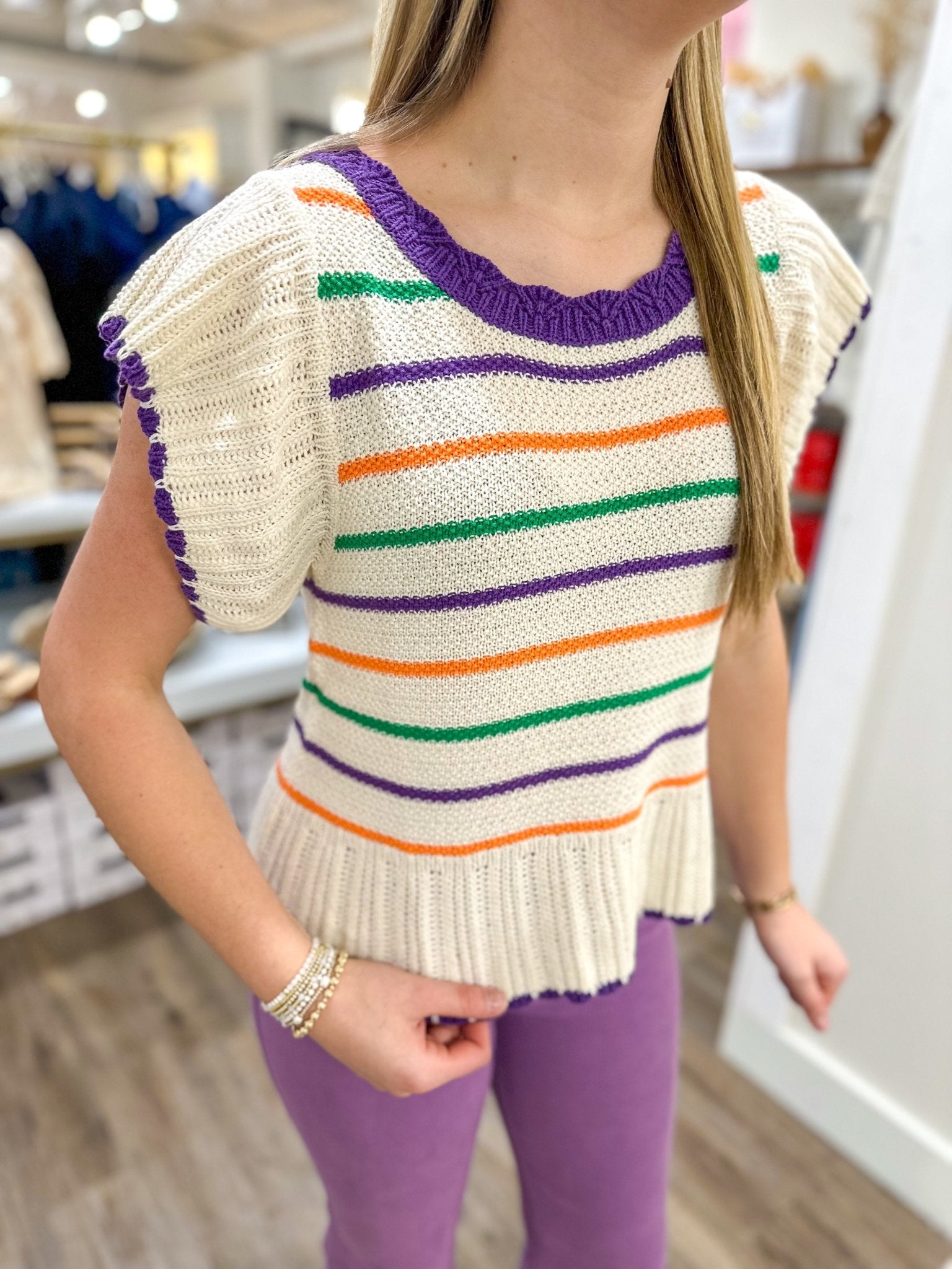 Lightweight, colorful, and full of charm. This festival stripe knit top features playful multicolor stripes with flutter sleeves for an easy, feminine feel. The thin, breathable knit makes it perfect for warm days, festivals, and everyday wear alike.
