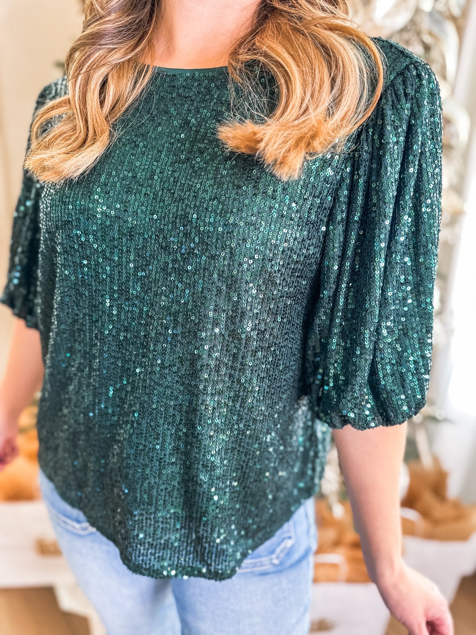 Add a little shimmer to your holiday lineup with this stunning sequin puff sleeve blouse — perfect for parties, dinners, and festive nights out!