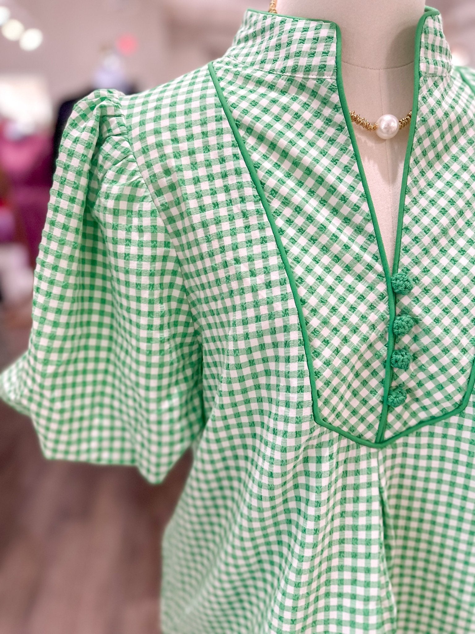 Design: Green gingham short sleeve top with puff sleeves, contrast trim, and structured bib neckline
