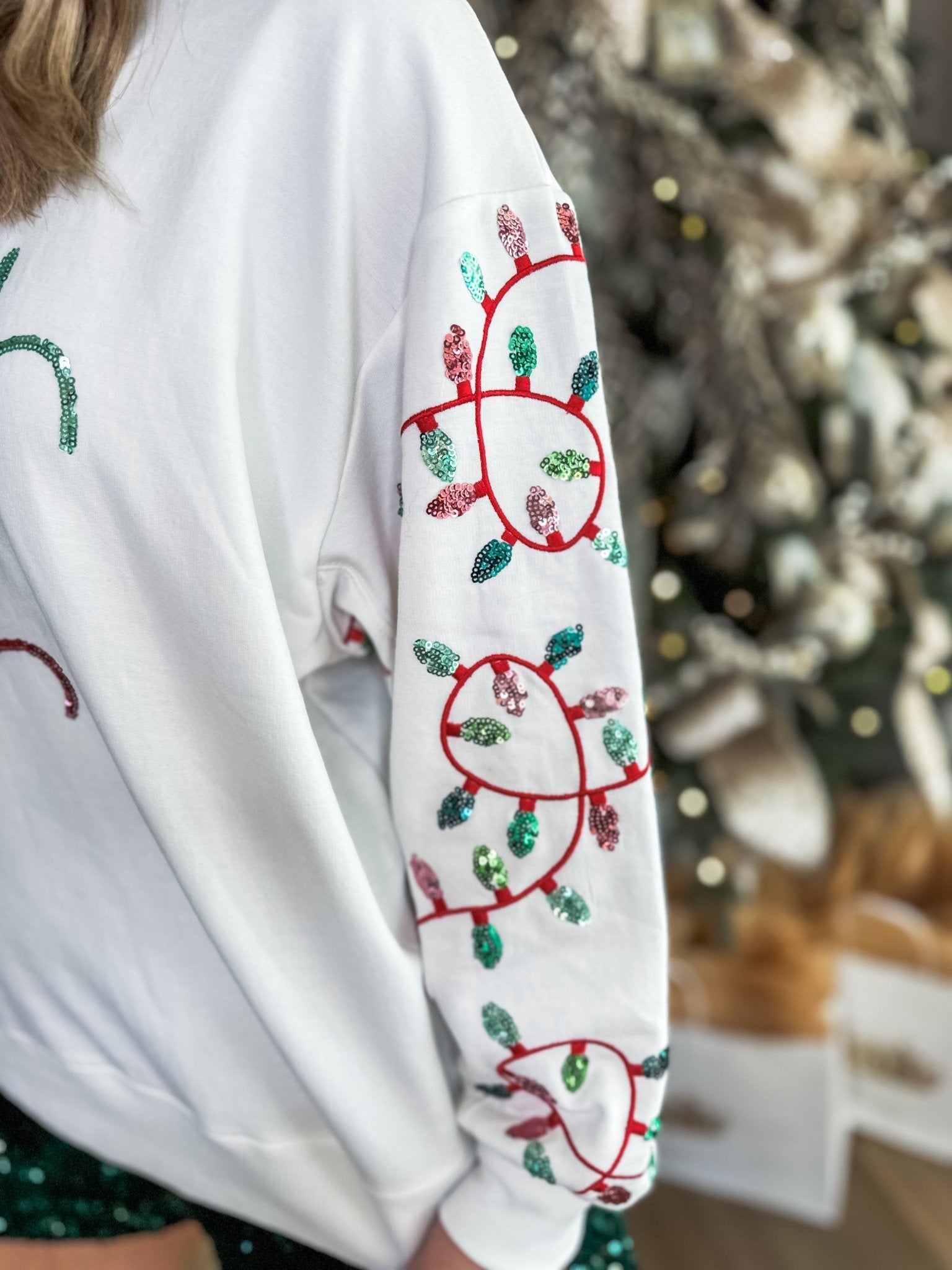 Bring on the cheer with this festive favorite! This cozy white sweatshirt features “Holly Jolly” spelled out in sparkling sequins across the front, with playful Christmas light details twinkling down the sleeves. It’s holiday happiness you can wear!