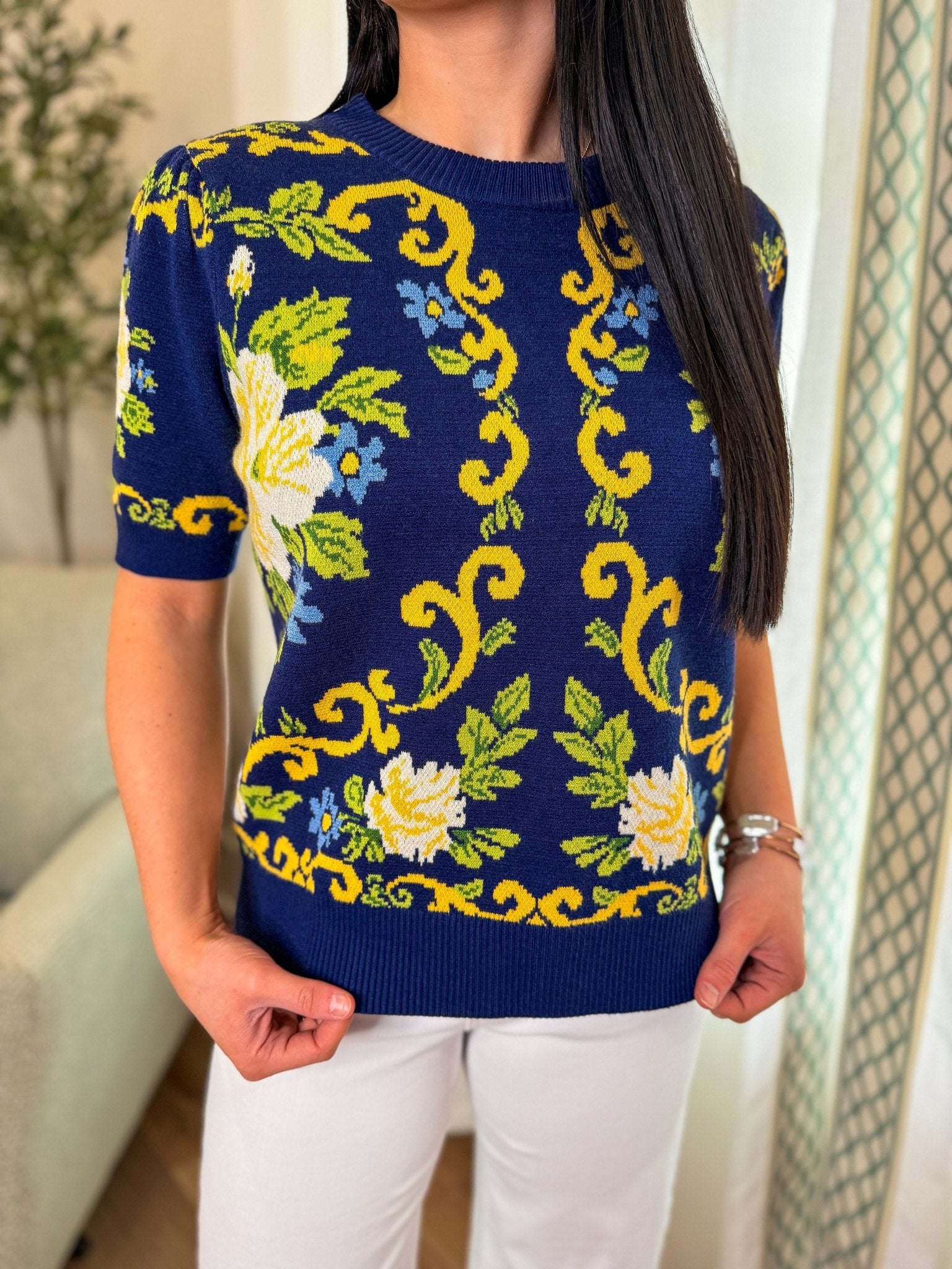 Classic meets statement in this beautifully detailed short sleeve sweater. Designed with an intricate floral and scroll pattern against a rich navy backdrop, this piece feels polished yet playful. The structured knit and flattering fit make it perfect for dressing up with white denim or pairing with tailored trousers for a refined look.