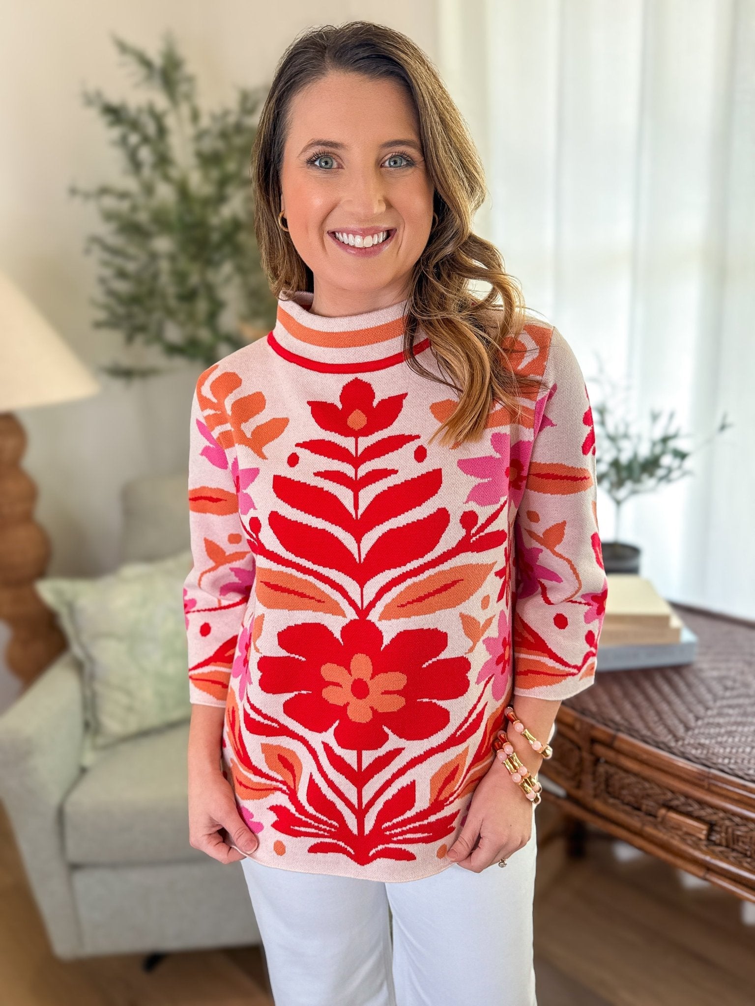 Design: Eye-catching floral knit pattern in pink, red, and orange tones with a mock neckline and relaxed three-quarter sleeves
