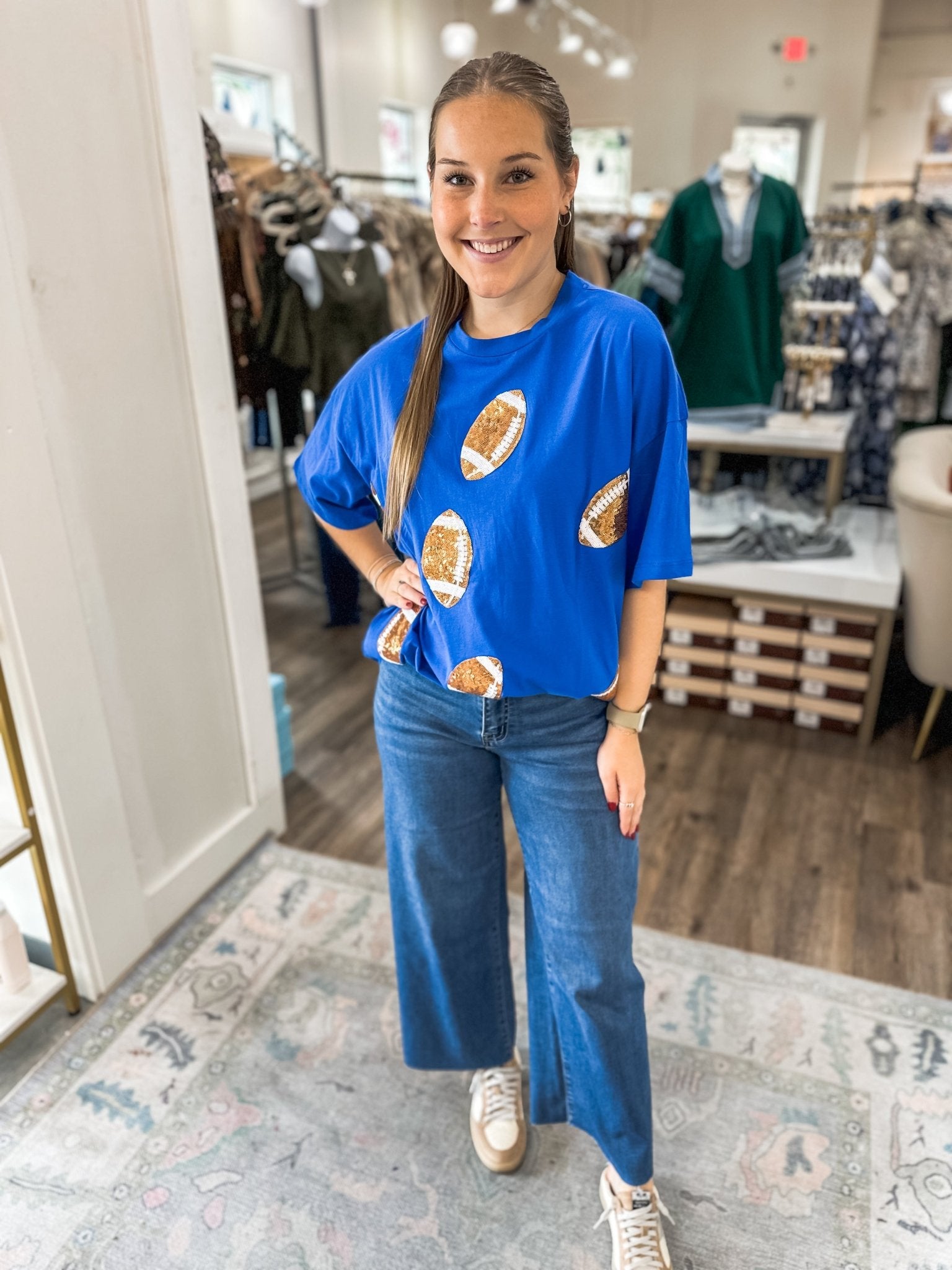Turn heads on game day with this bold and sparkly oversized tee! The vibrant royal blue color and dazzling sequin footballs make it the ultimate statement piece for cheering on your team.