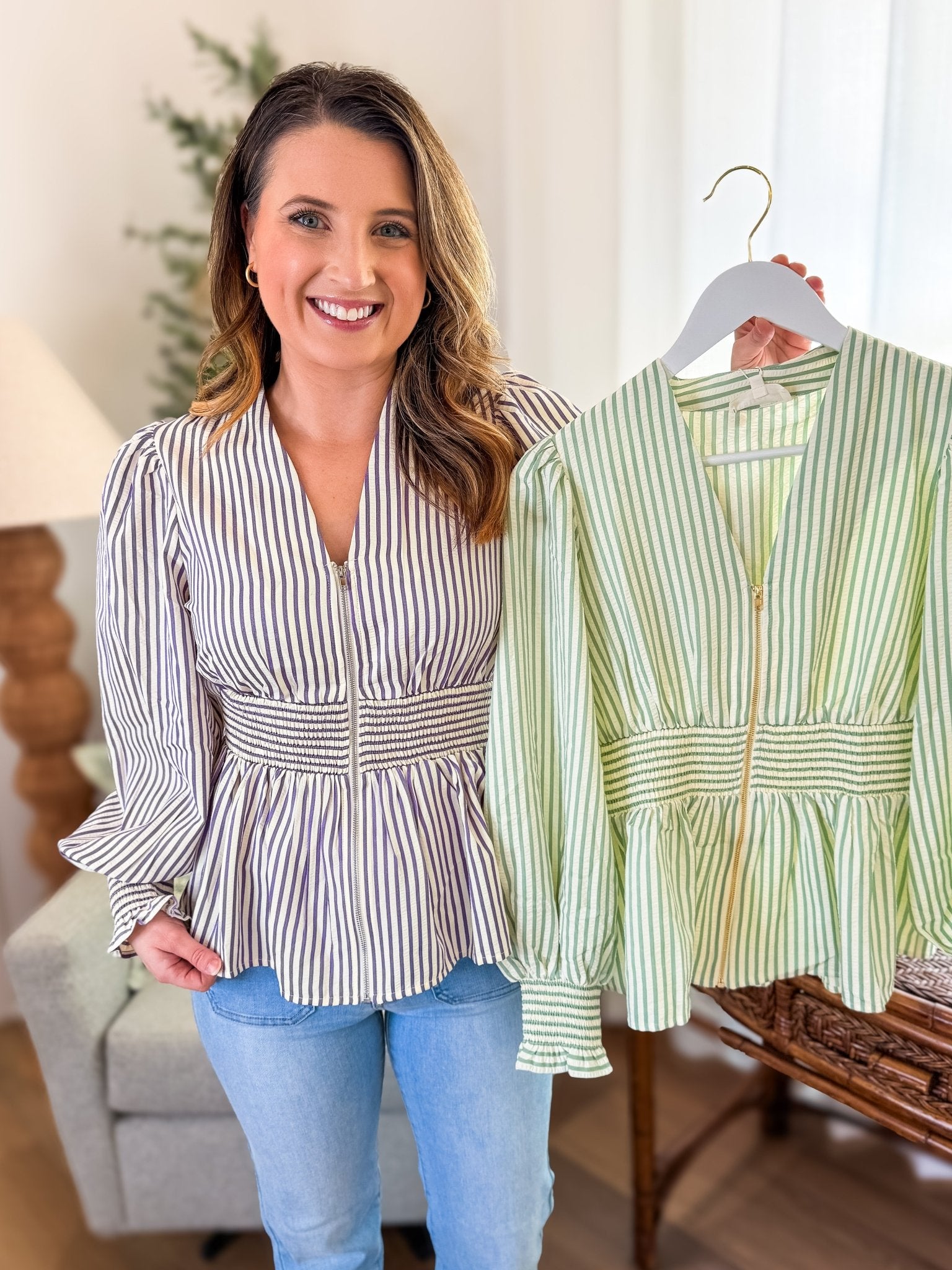Design: Vertical sage stripe pattern with functional front zipper, smocked waist detail, long sleeves with smocked cuffs, and a flattering peplum hem